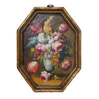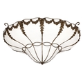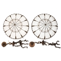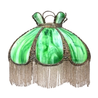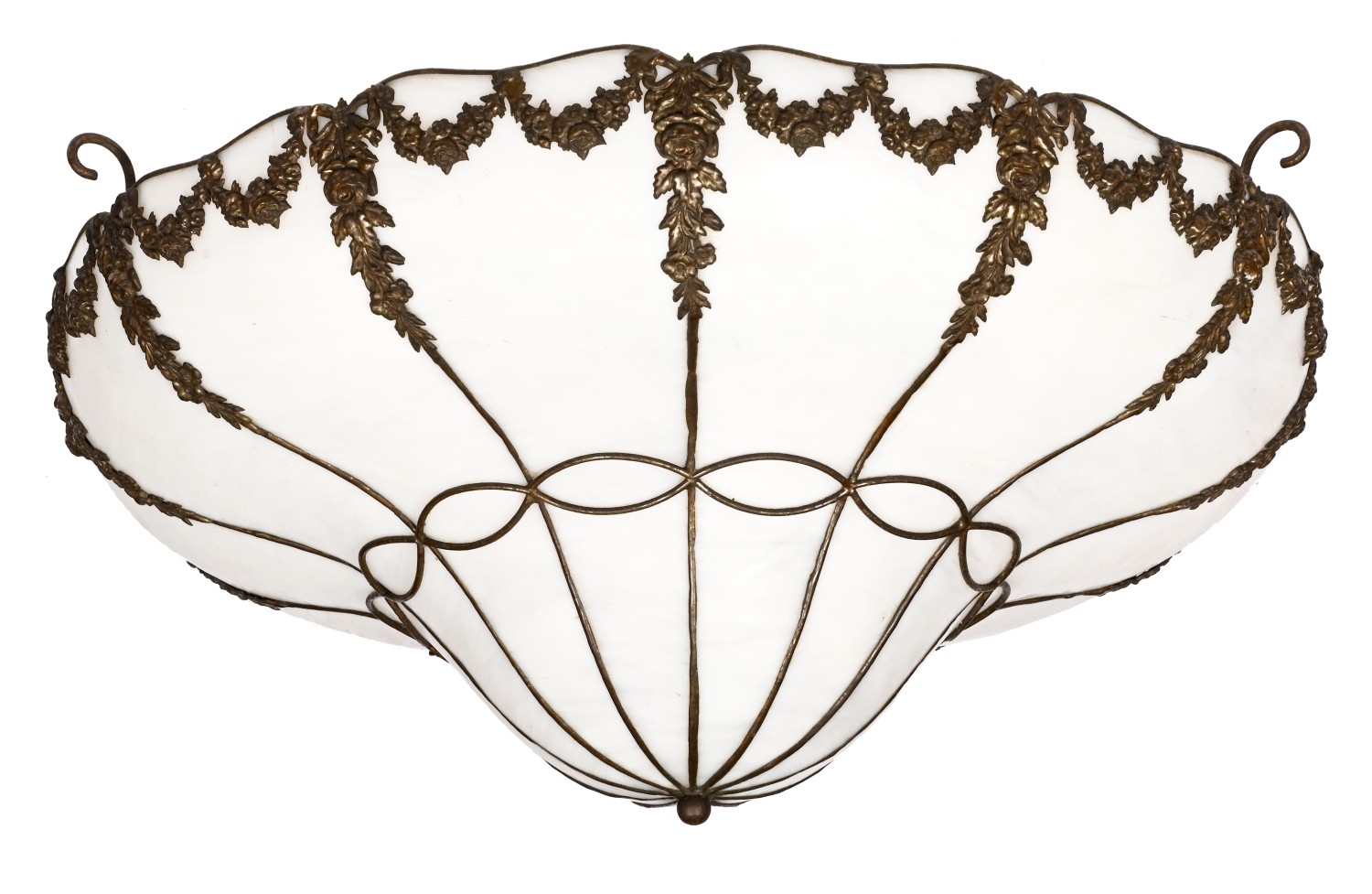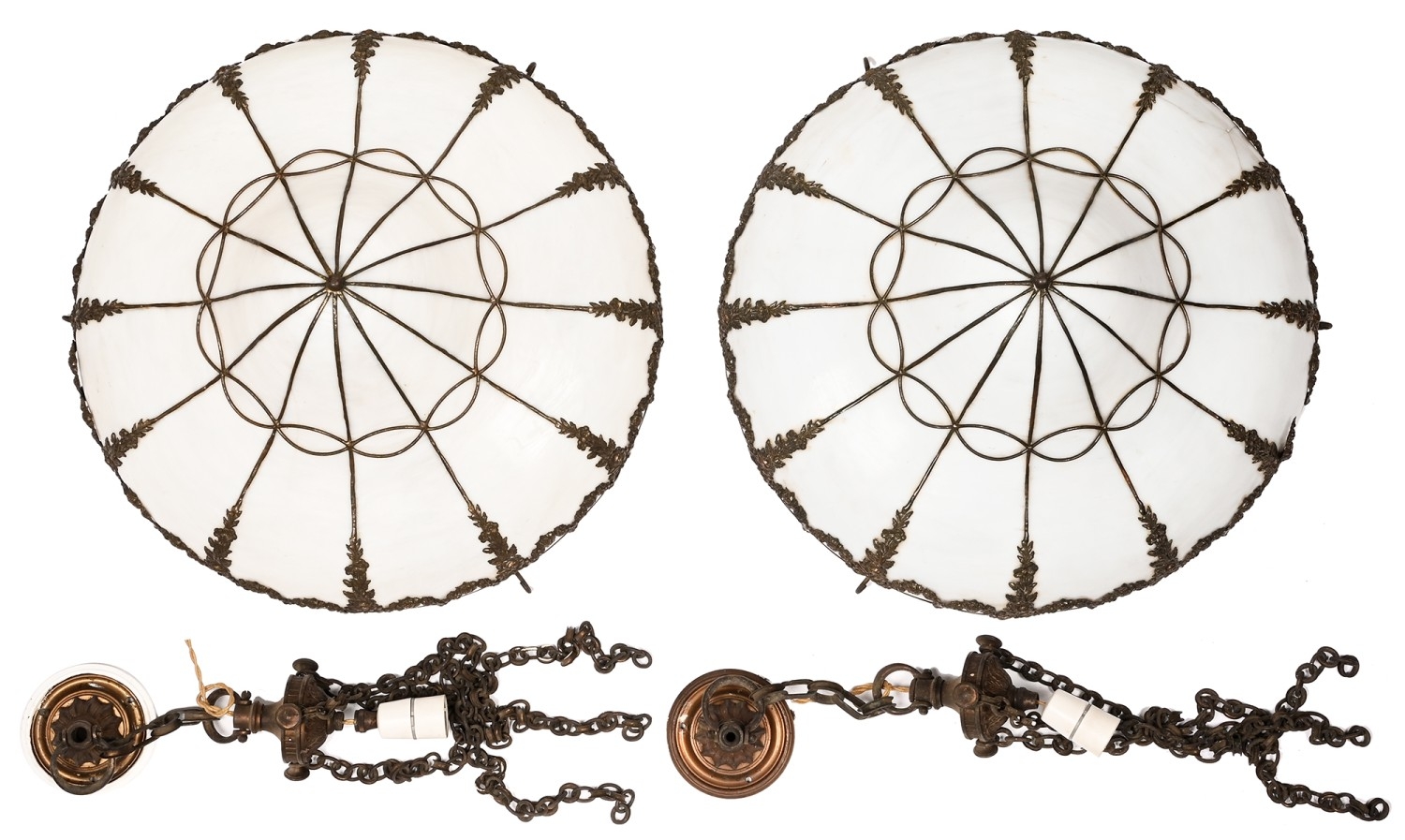 A pair of white marbled glass ogee hanging lamp shades, applied with stamped metal festoons, c1920, 47cm diam