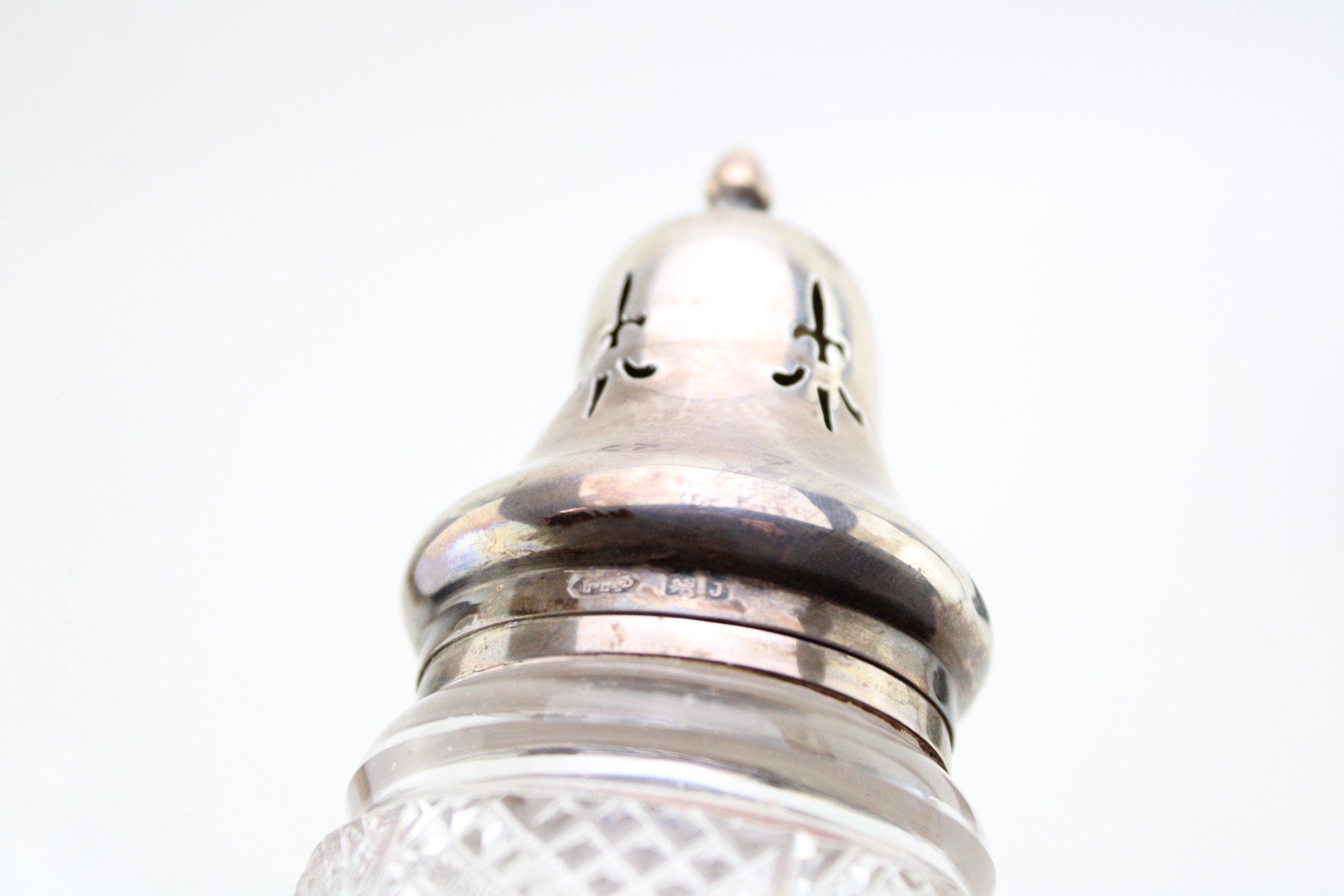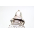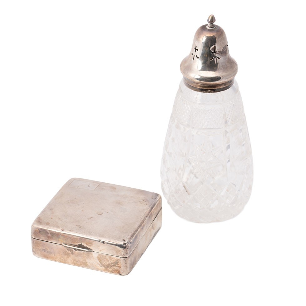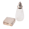 A silver cigarette box, 9cm x 9cm, with a silver topped sugar shaker (2).