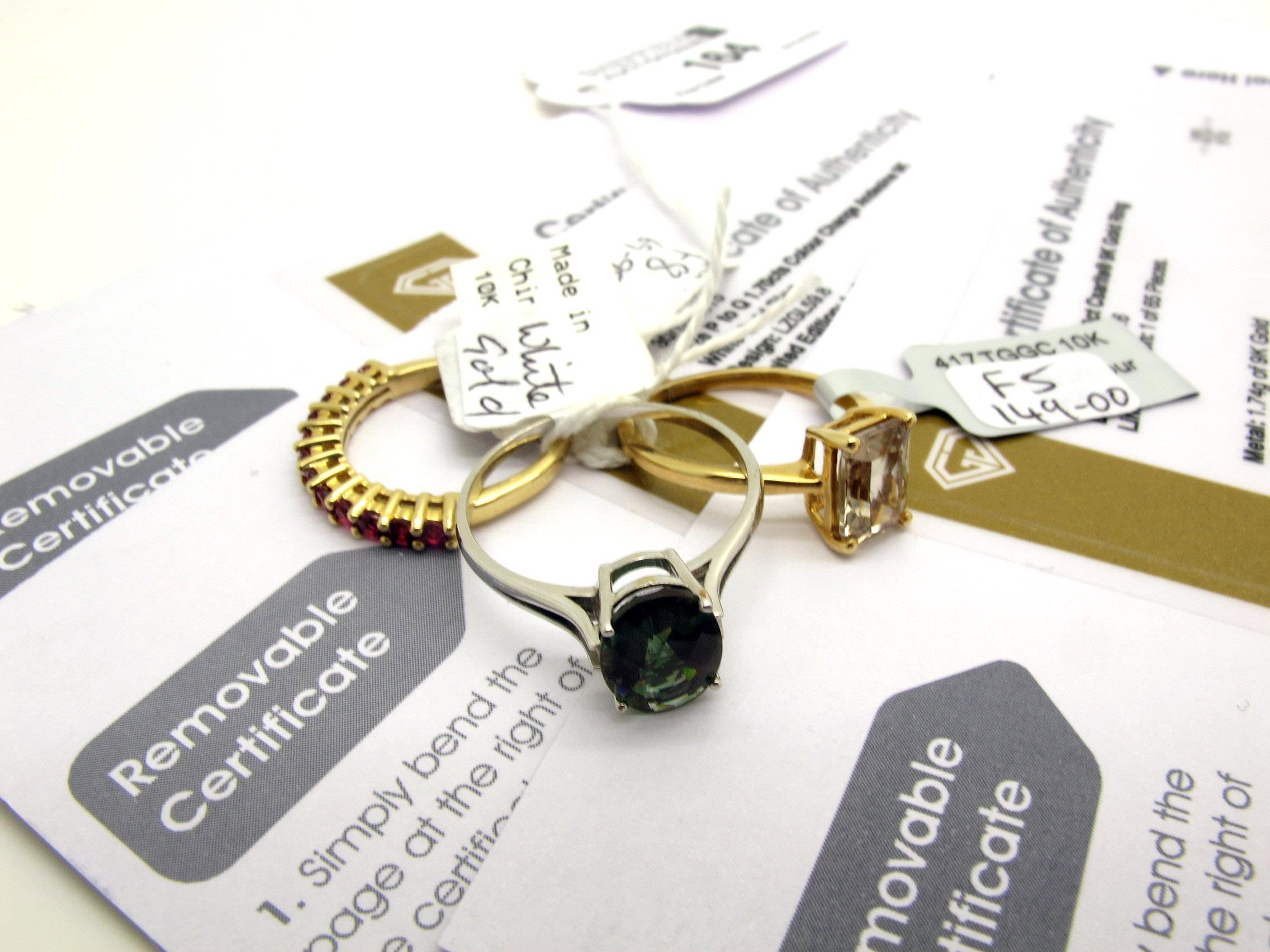 The Genuine Gemstone Company Ltd; A 9ct Gold 1.80ct Csarite Single Stone Ring, rectangular four claw, between tapered shoulders (finger size M), A 9ct Gold Cruzeiro Rubellite half eternity style ring, of uniform design, claw set throughout (finger size J 1/2), A 9ct White Gold 1.70ct Colour Change Anesine single stone ring, oval claw set, between bifurcated shoulders (finger size Q) (total weight 5.5 grams) (3).