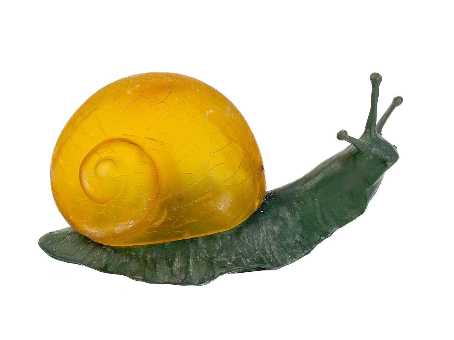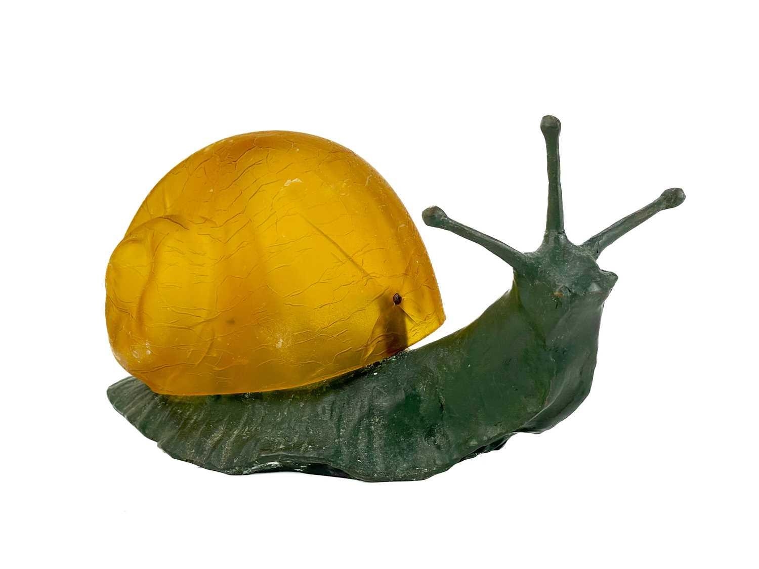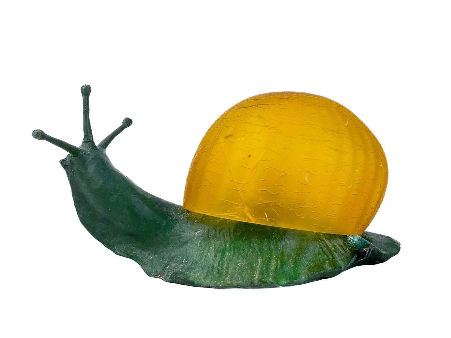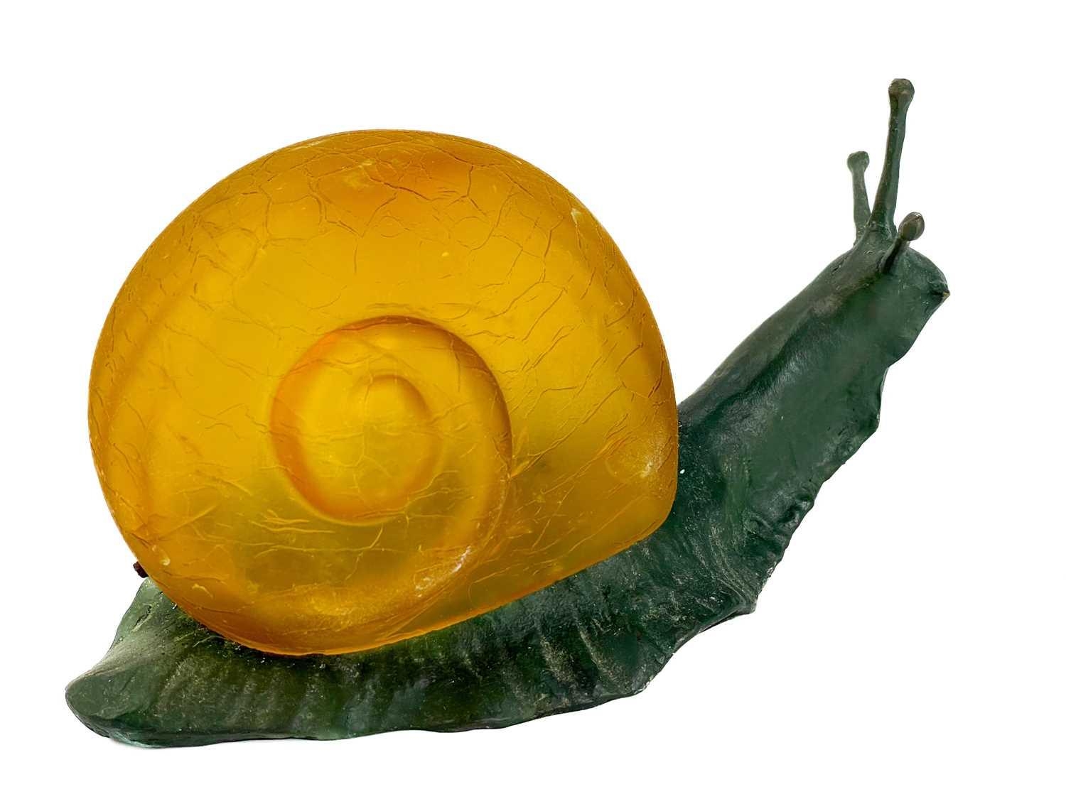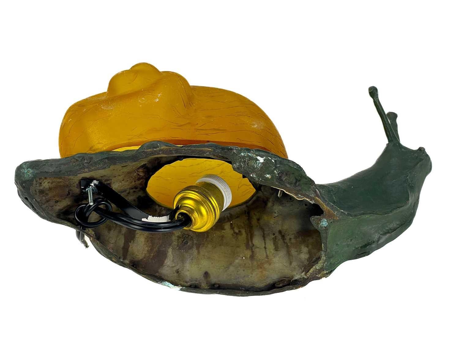 A novelty table lamp in the form of a snail. The simulated bronze body surmounted by an amber glass shade modelled as a shell. Height 12.5cm, length 23cm. The lamp will need to be professionally rewired, there are several fractures in the glass shade. Images of affected areas online.