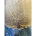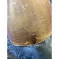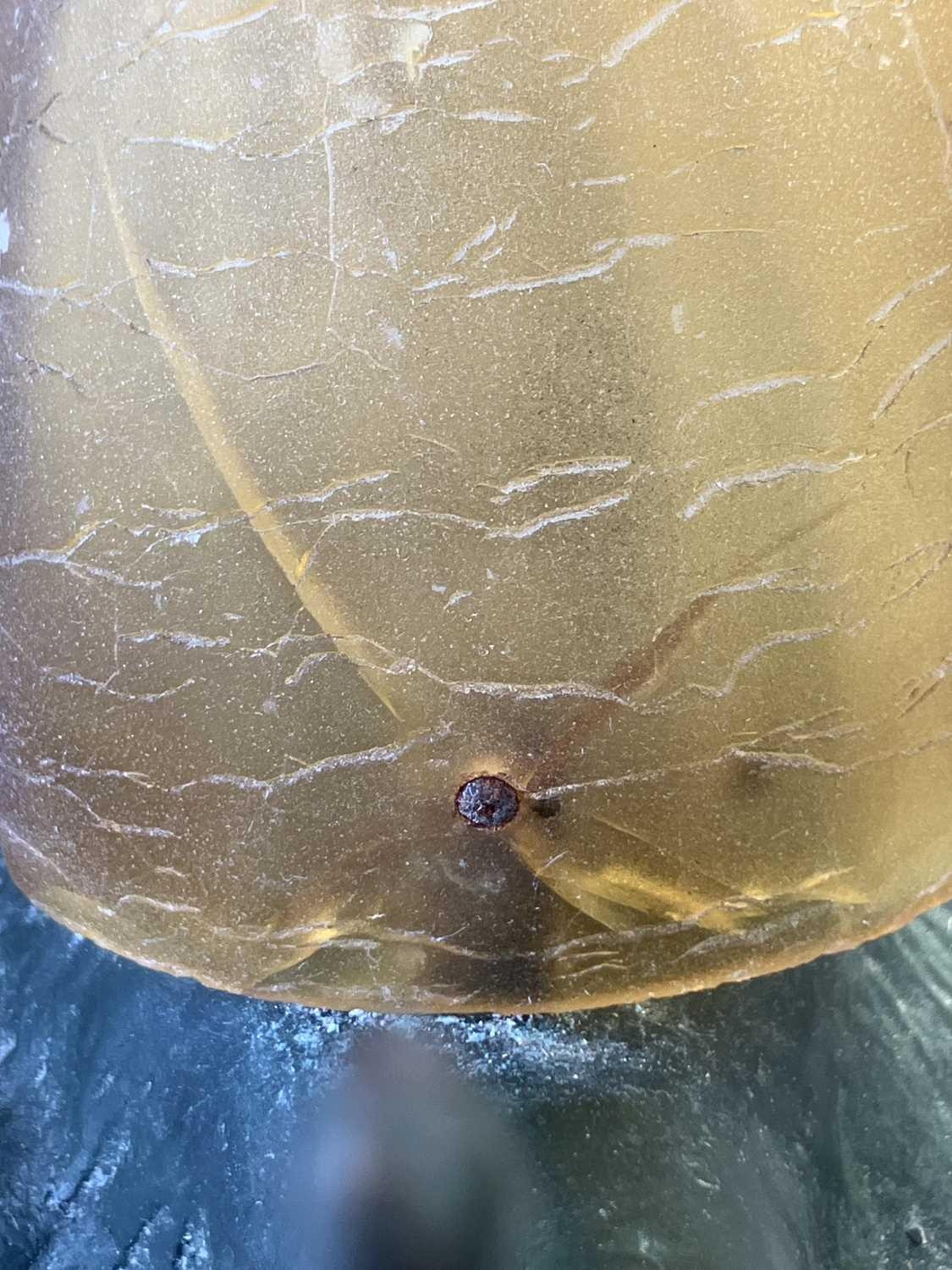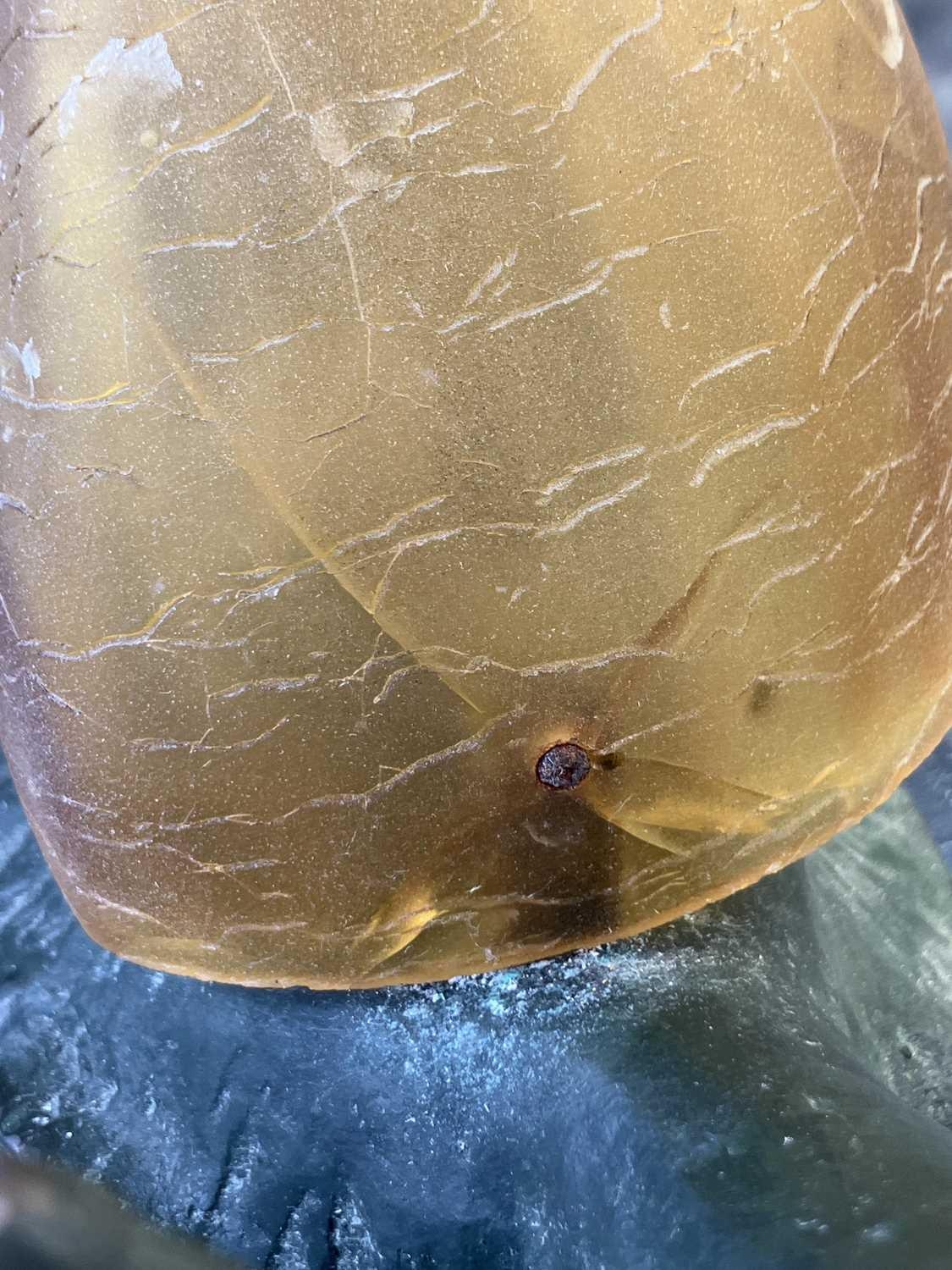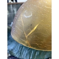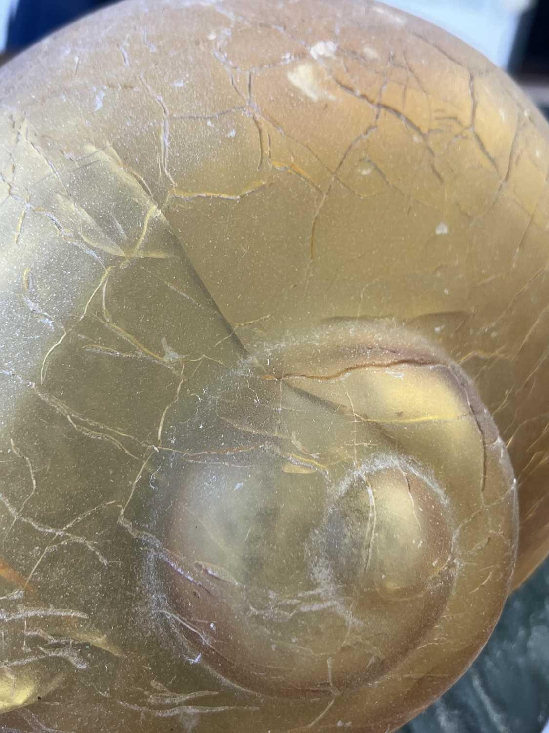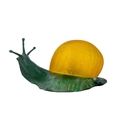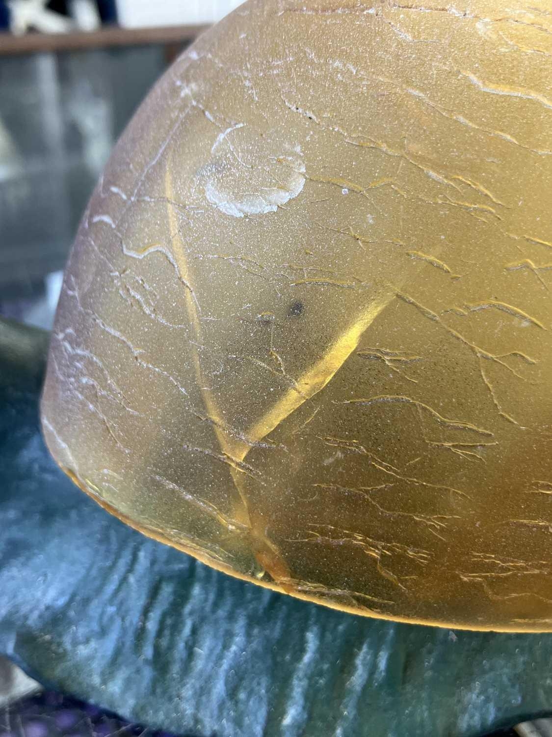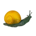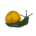 A novelty table lamp in the form of a snail. The simulated bronze body surmounted by an amber glass shade modelled as a shell. Height 12.5cm, length 23cm. The lamp will need to be professionally rewired, there are several fractures in the glass shade. Images of affected areas online.