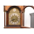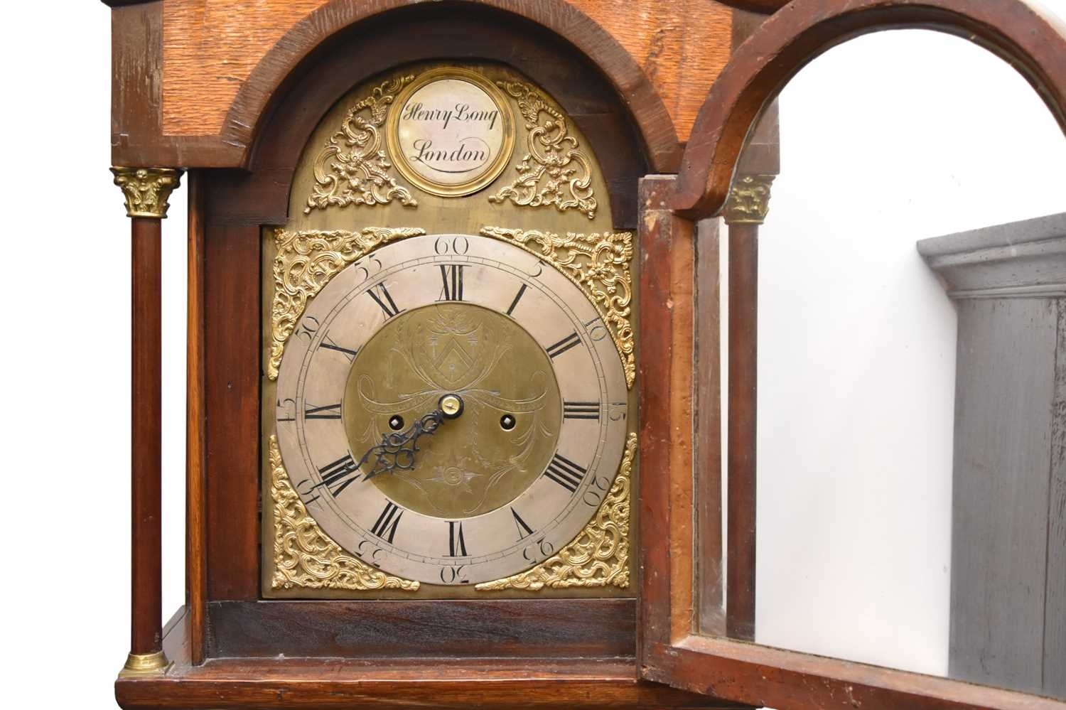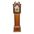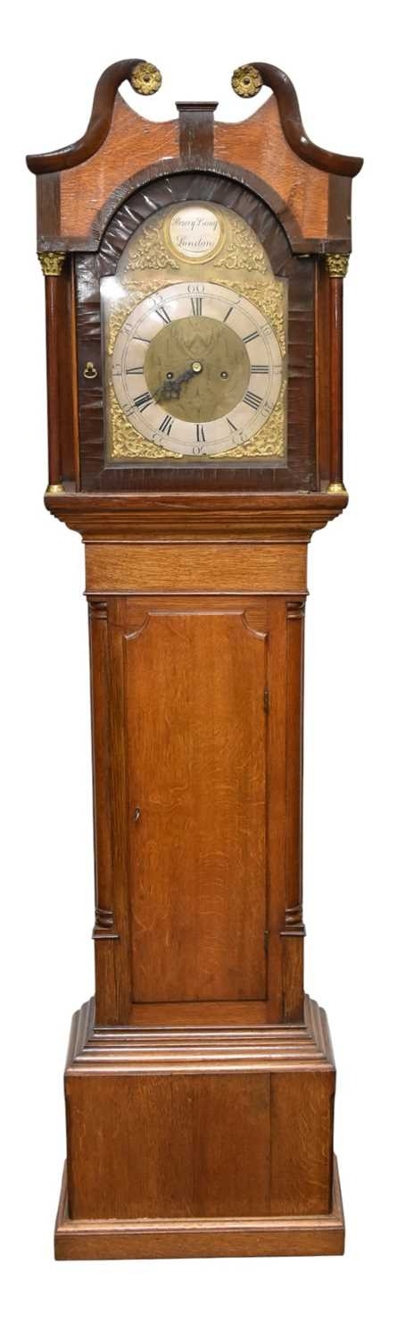 A 19th century oak brass dial longcase clock The dial signed Henry Long, London The hood with swan-neck pediment and turned front corner pilasters, the trunk with shaped door flanked by quarter pilasters, above a plain base box (reduced) on a plinth base. The 11 inch arched brass dial with silvered chapter ring with Roman hour markers and Arabic outer minutes track, the centre etched with an armorial crest and motto 'By Hammer and Hand all Arts do Stand'. The earlier polished brass eight-day movement with four knopped pillars, striking on a bell. With two weights, pendulum and door key. 46cm wide x 23cm deep x 190cm high