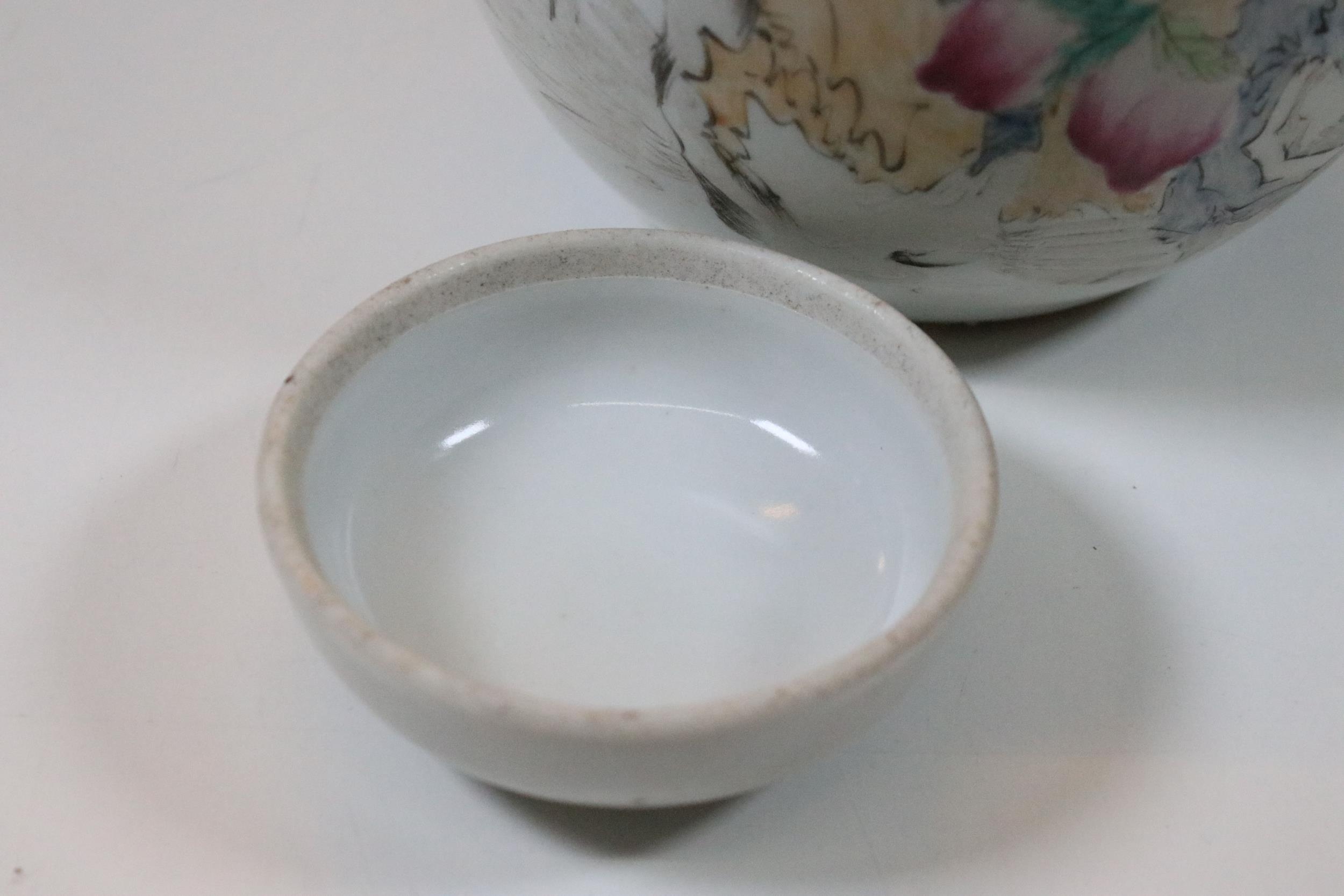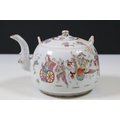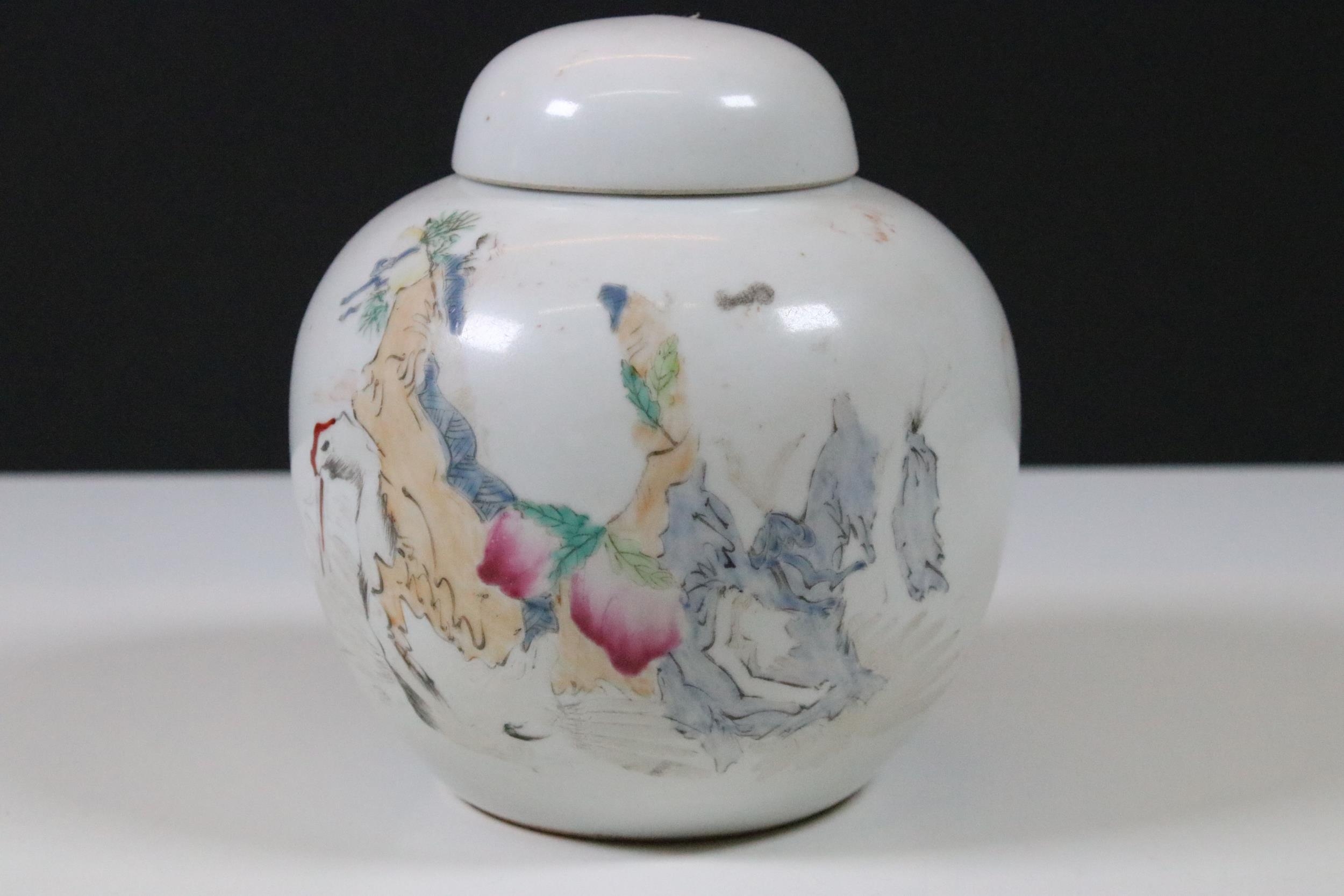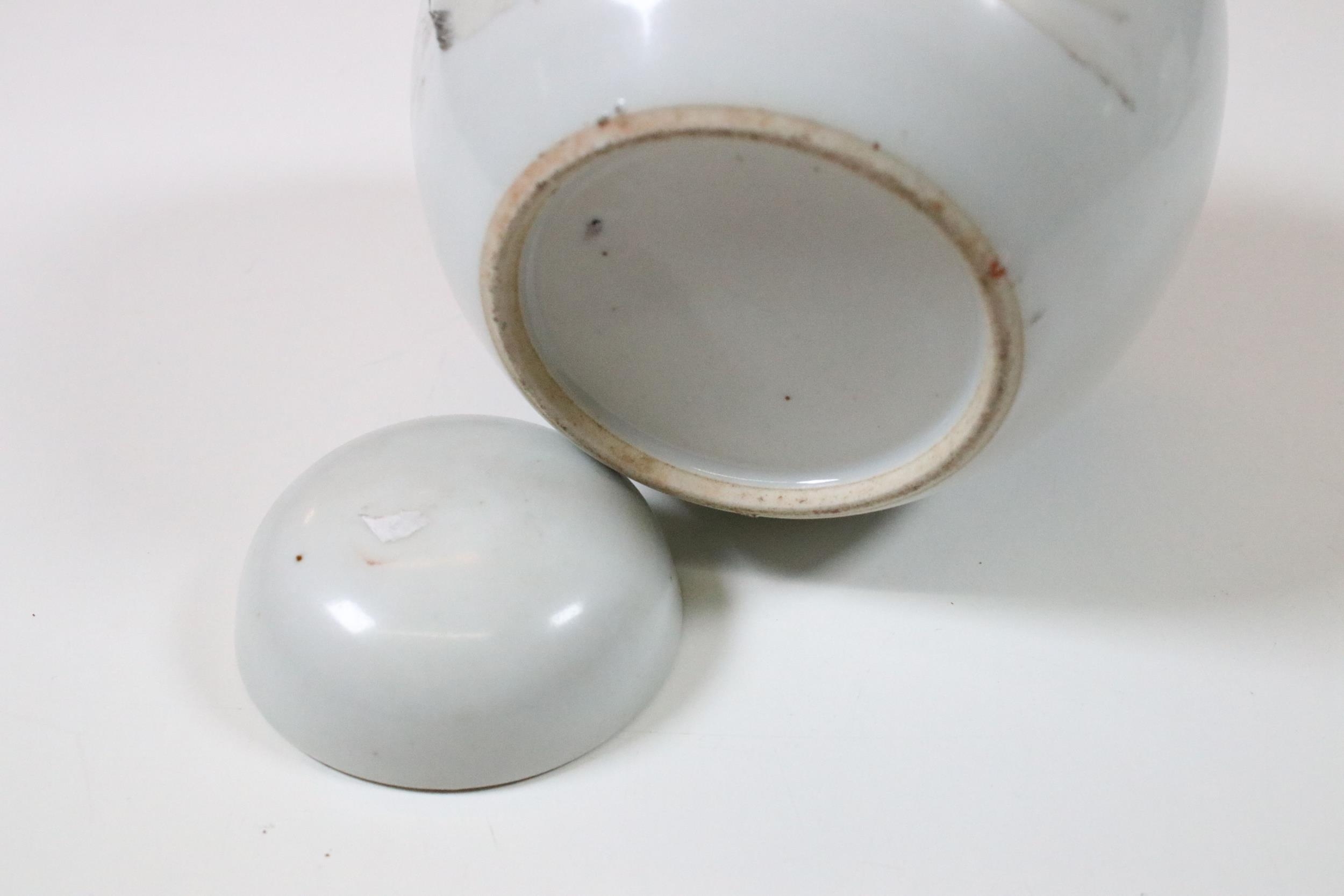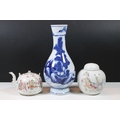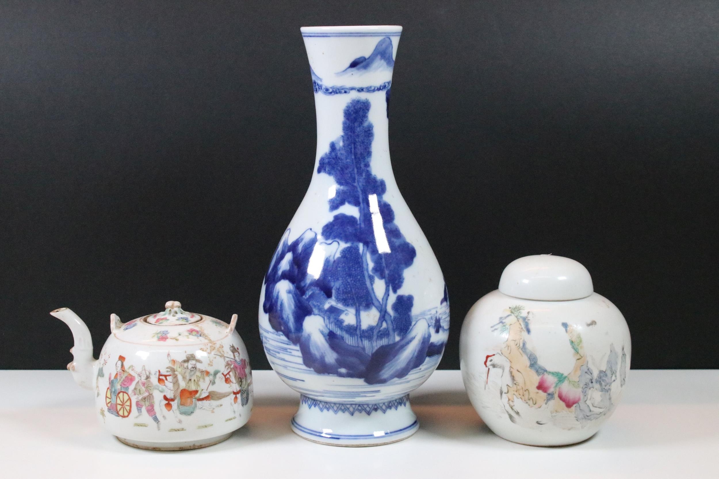 Collection of three Chinese ceramic items to include Late 19th Century Qing Dynasty blue and white vase with mountain and water decoration, Famille Rose ginger jar and Famille Rose lidded teapot with figural decoration