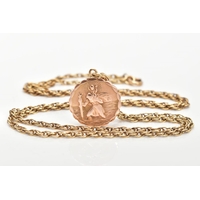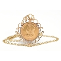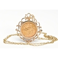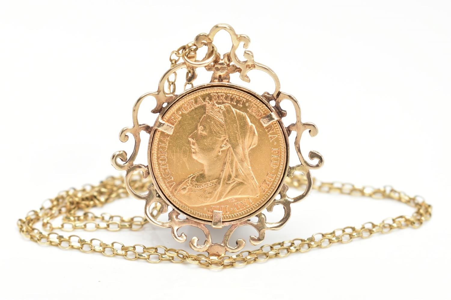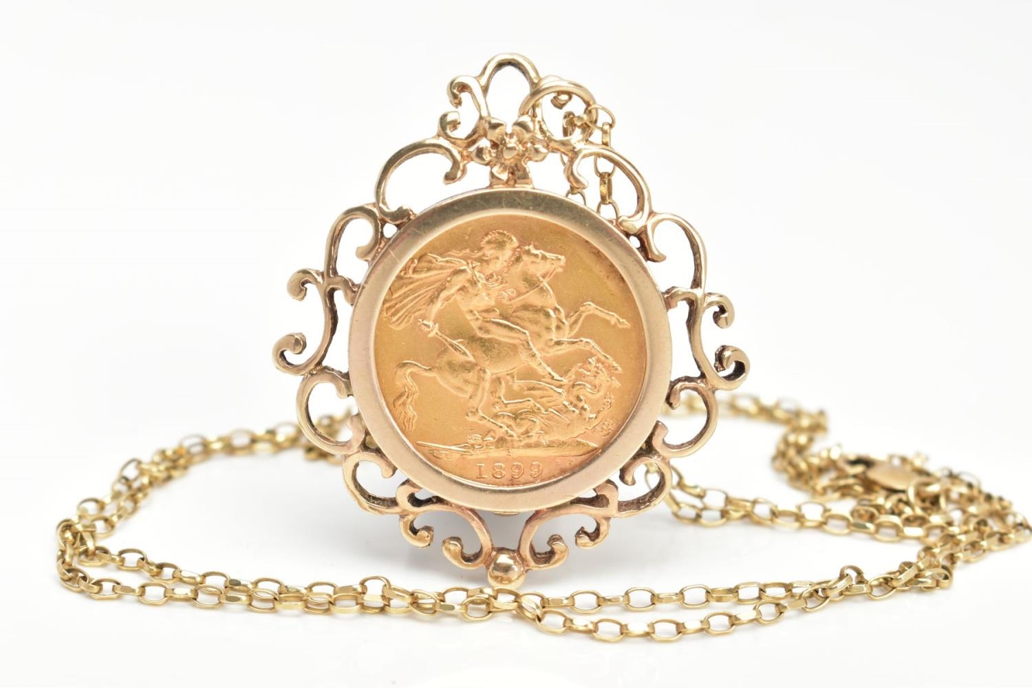 A MOUNTED FULL SOVEREIGN PENDANT AND CHAIN, a full sovereign depicting George and the dragon, dated 1899 and Queen Victoria, set in a scroll detailed mount, hallmarked 9ct gold London, suspended from a fine cable chain, fitted with a lobster clasp, approximate length 633mm, stamped 375, approximate gross weight 15.3 grams, (condition report: general moderate wear, overall good condition)