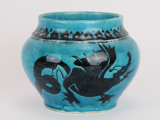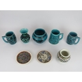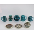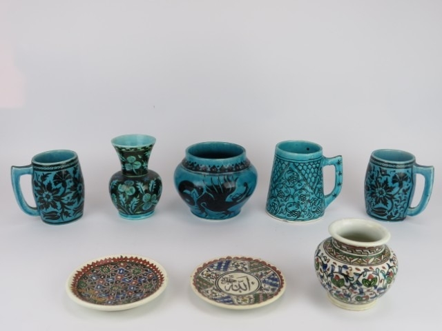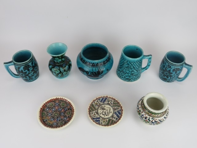 A vintage group of Turkish Iznik hand painted pottery wares. Comprising three vases, three tankards and two dishes. (8 items) 14.6 cm tallest height.