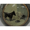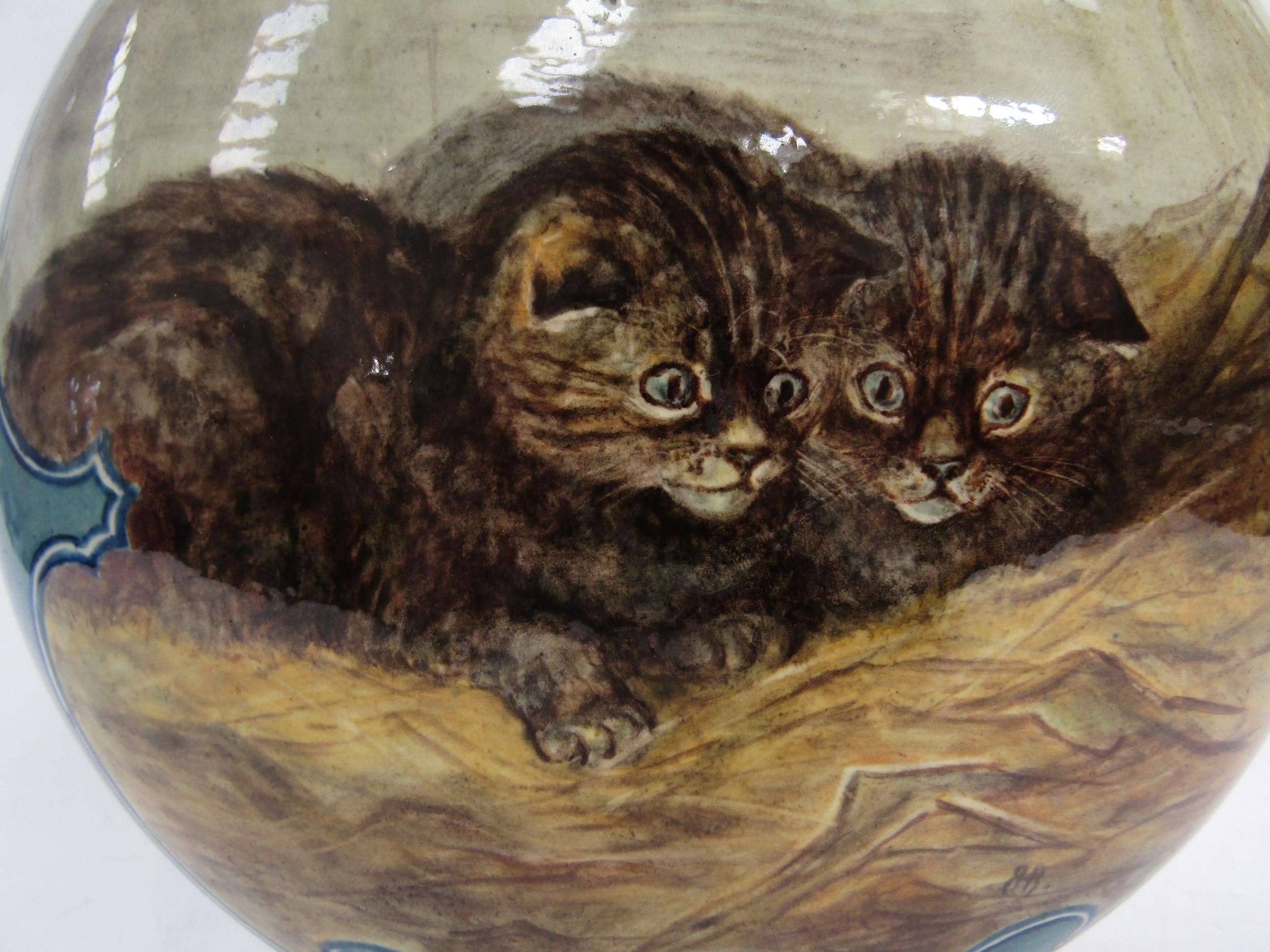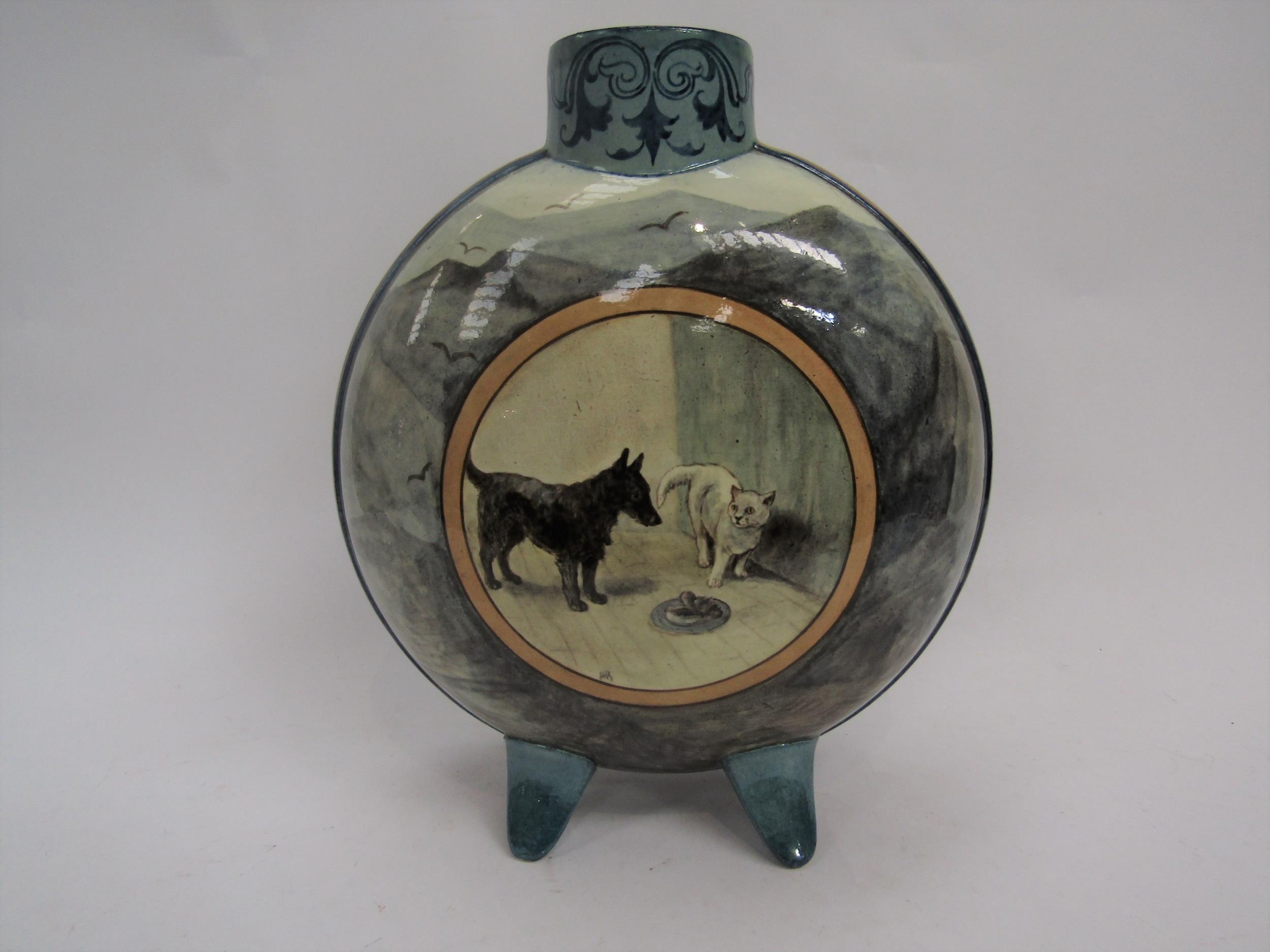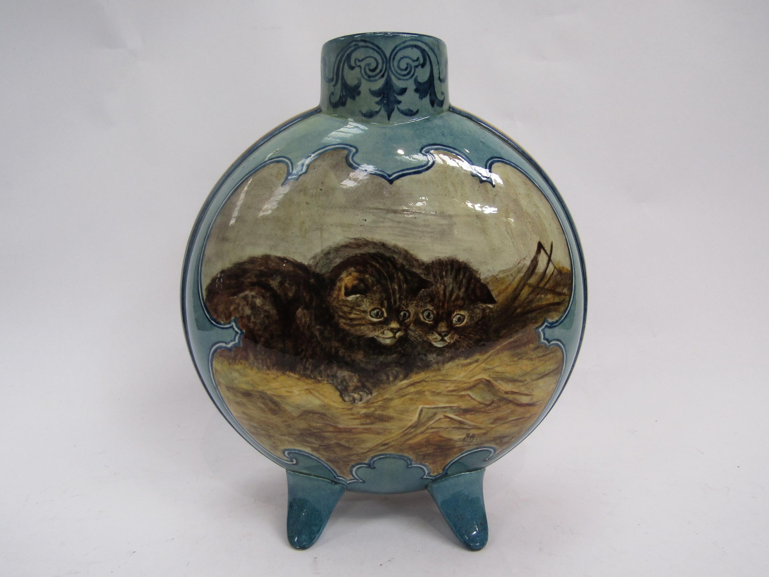 A Doulton Lambeth Hannah Barlow Faience moonflask, decorated with kittens to one side and a cat and dog to other, the painted panels monogrammed HBB. Painted monogram for Katherine Blake Smallfield to base, 34cm high