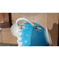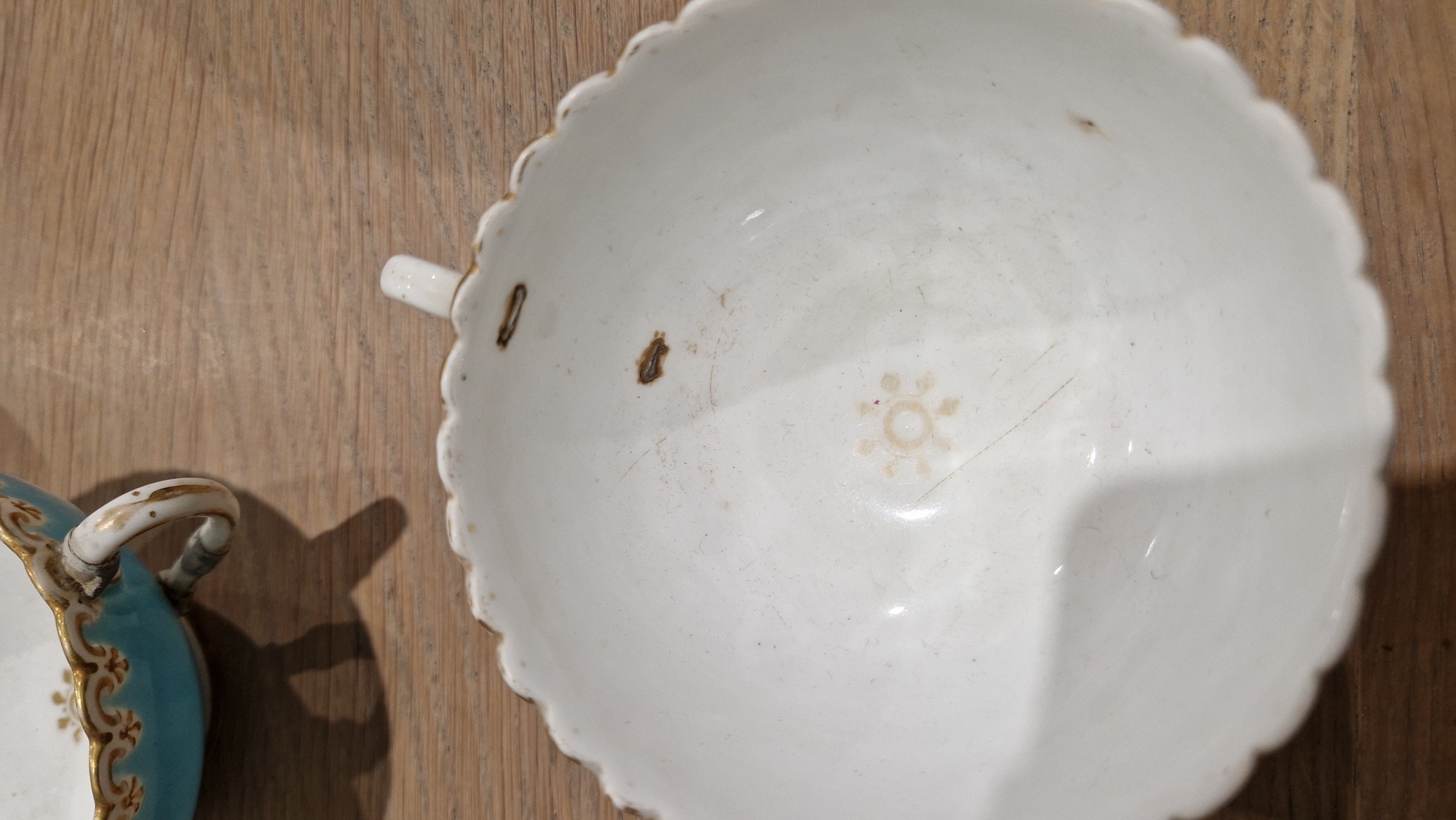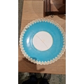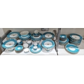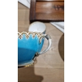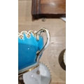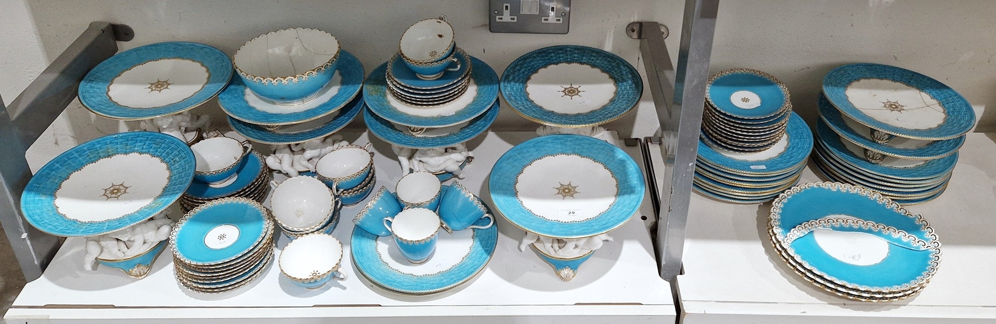 English porcelain turquoise ground composite part tea and dessert service in the Minton style, impressed black registration lozenges, impressed T.F factory marks, probably for Thomas Ford, circa 1870-80, basket-moulded with gilt rims, comprising two large figural comports with putti supports, four medium sized comports, four low footed comports, eighteen plates; together with an English porcelain turquoise ground part tea-service with shaped gilt C-scroll rims, comprising: three plates, ten teacups, four coffee cups and 33 saucers and a bowl (damages and repairs)