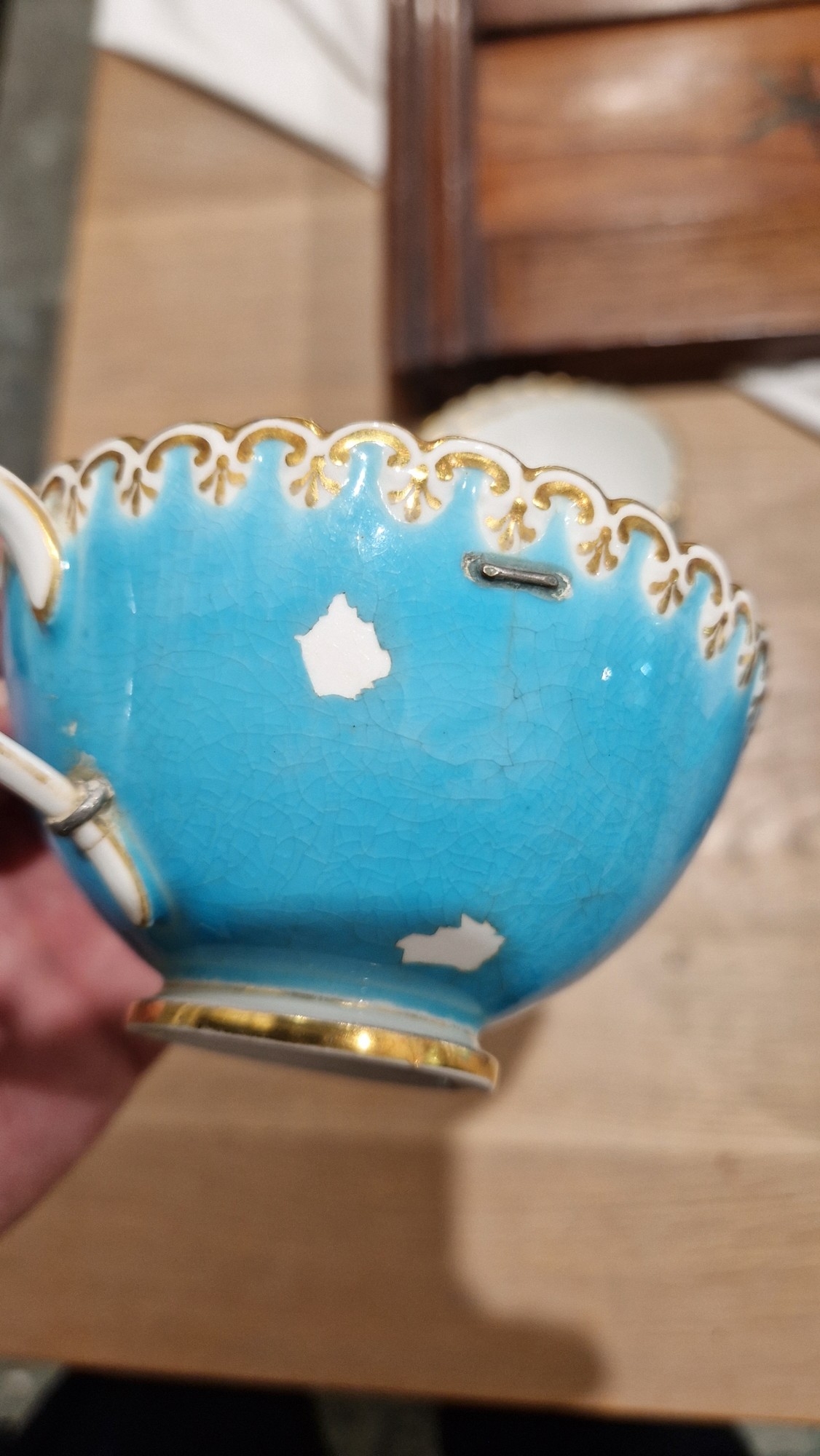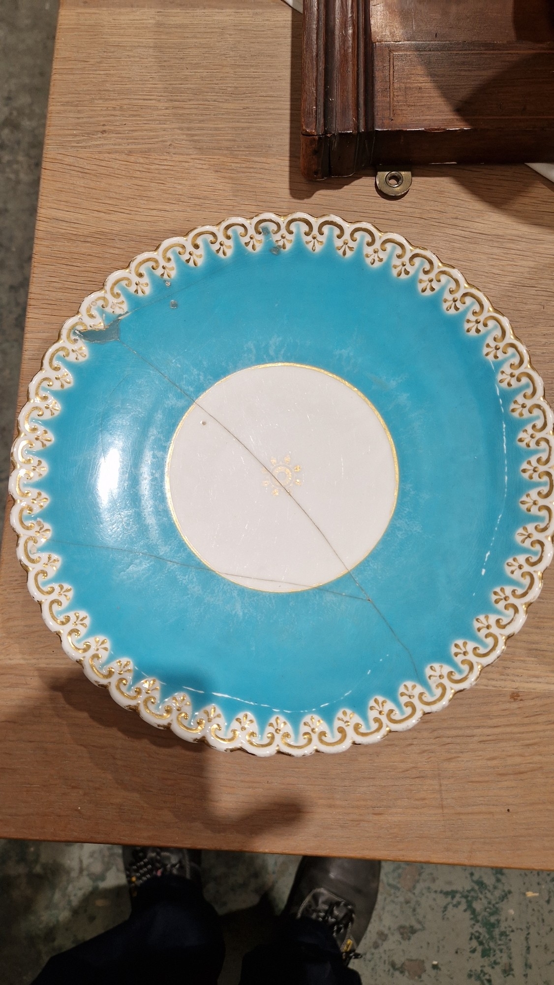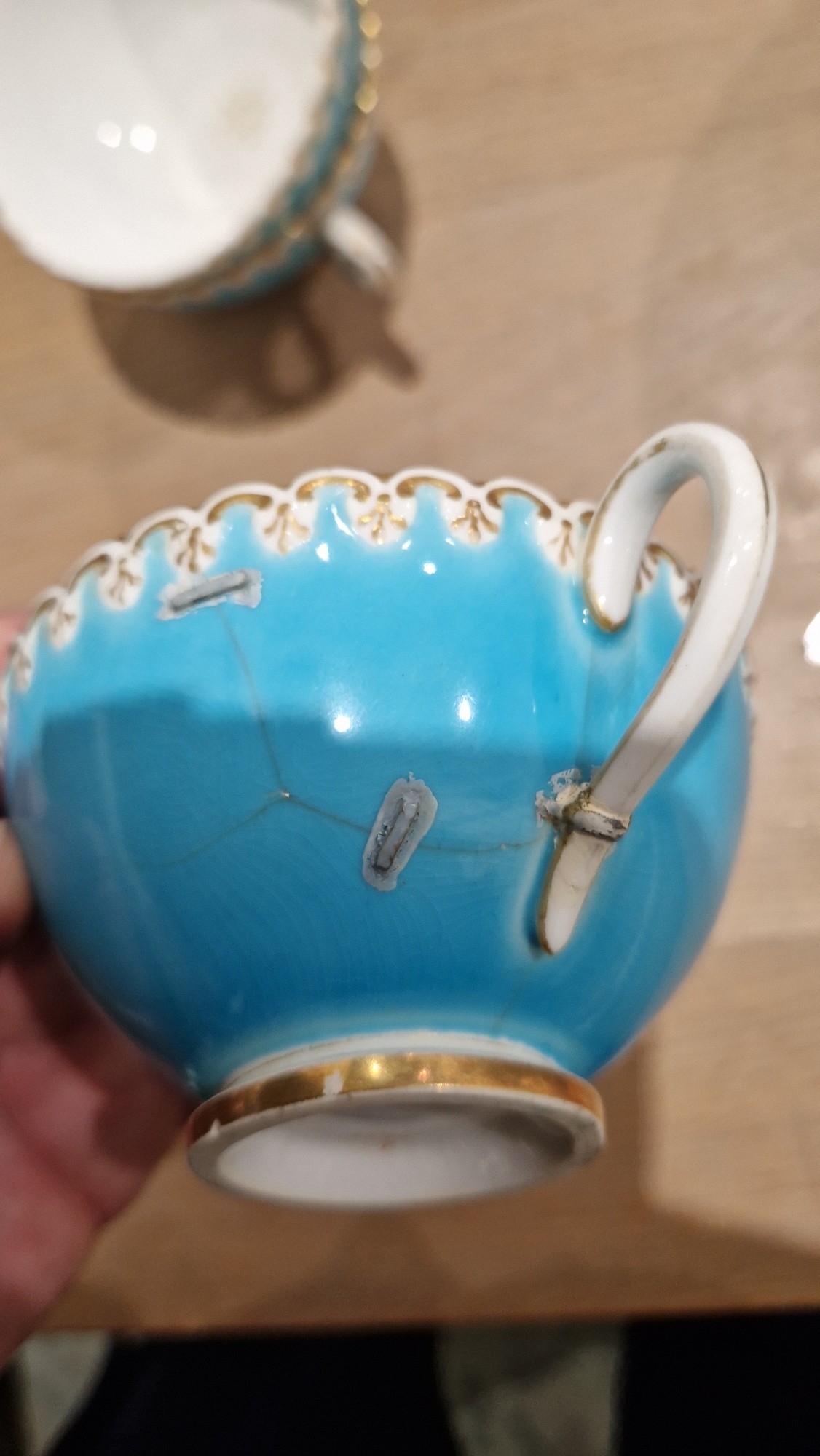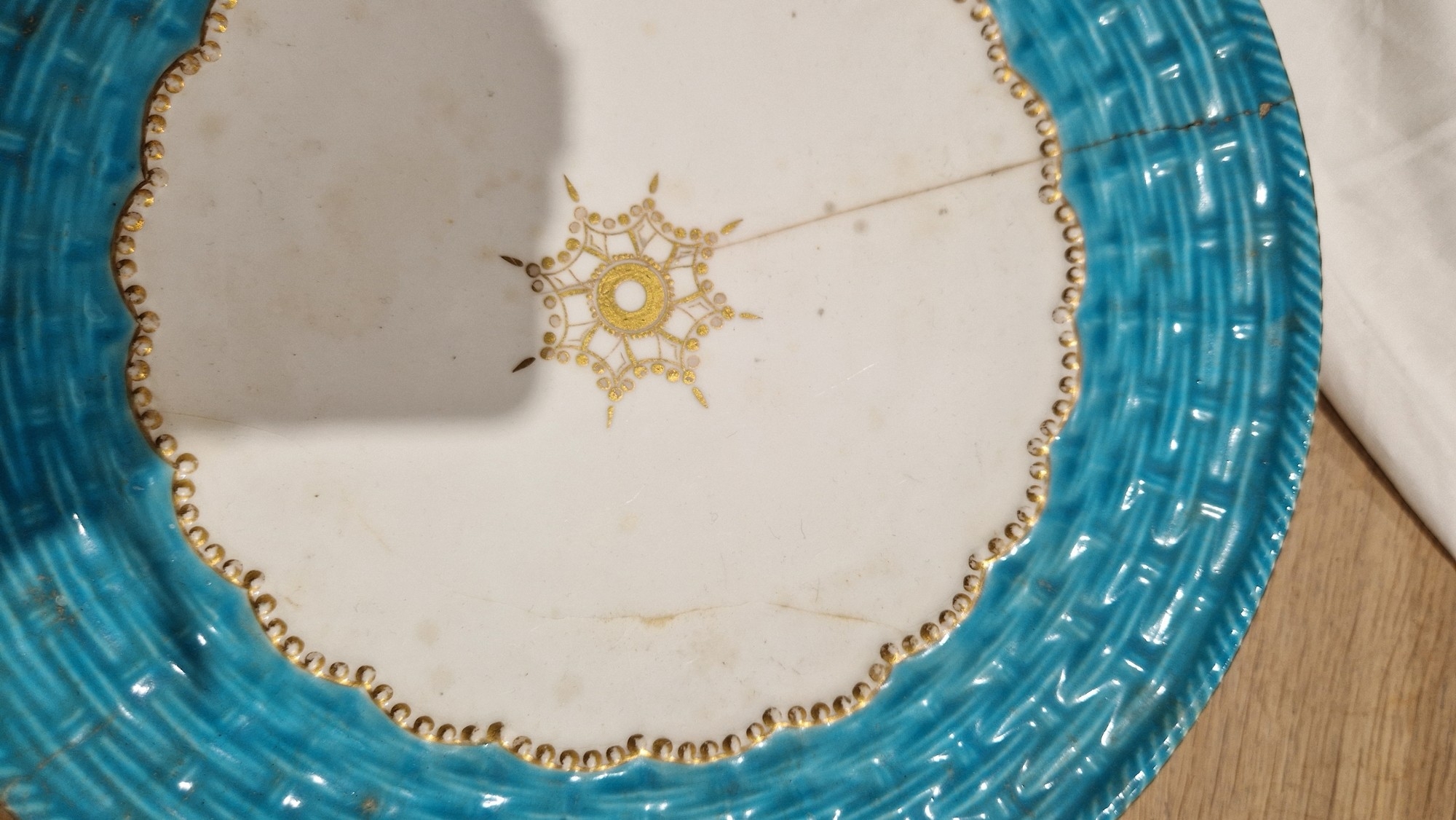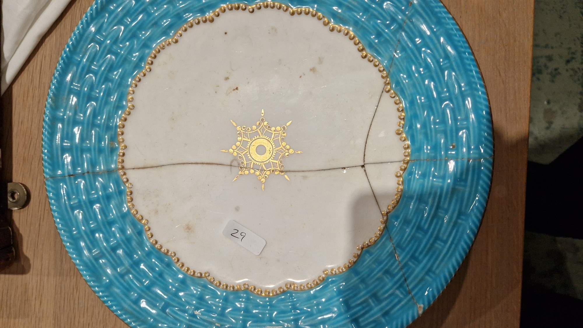 Two large comports - 24.5 cm diam. x 20 cm high: in good order. Four medium sized comports - 24.5 cm diam. x 14 cm high: one with chipping to putti's feet, another with one putto's head restuck and further light chipping to toes. Four low footed comports: one extensively cracked and riveted, another cracked and riveted and the third & fourth with patches of staining. Eighteen basket-moulded plates, 23.5 cm diam.: Three plates with C-scroll borders, one with section of rim cracked out but present, all extensively cracked and damaged. Slop bowl is extensively cracked and with riveted repairs. Seven teacups are cracked and riveted and the remainder are also cracked. All four coffee cups are cracked. Six saucers are cracked. Some rubbing, glaze crazing and wear to gilding and slight flaking to turquoise ground.
