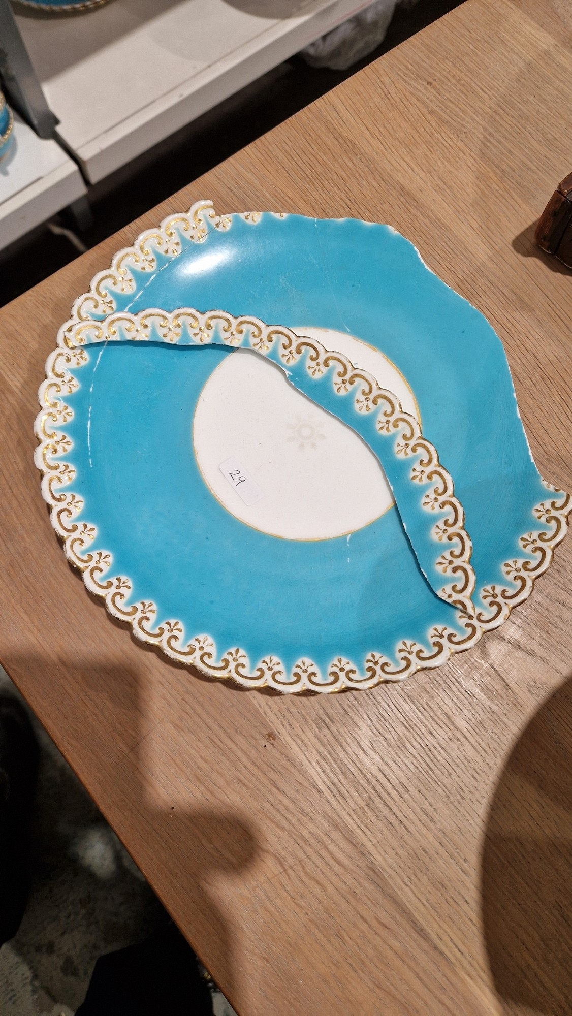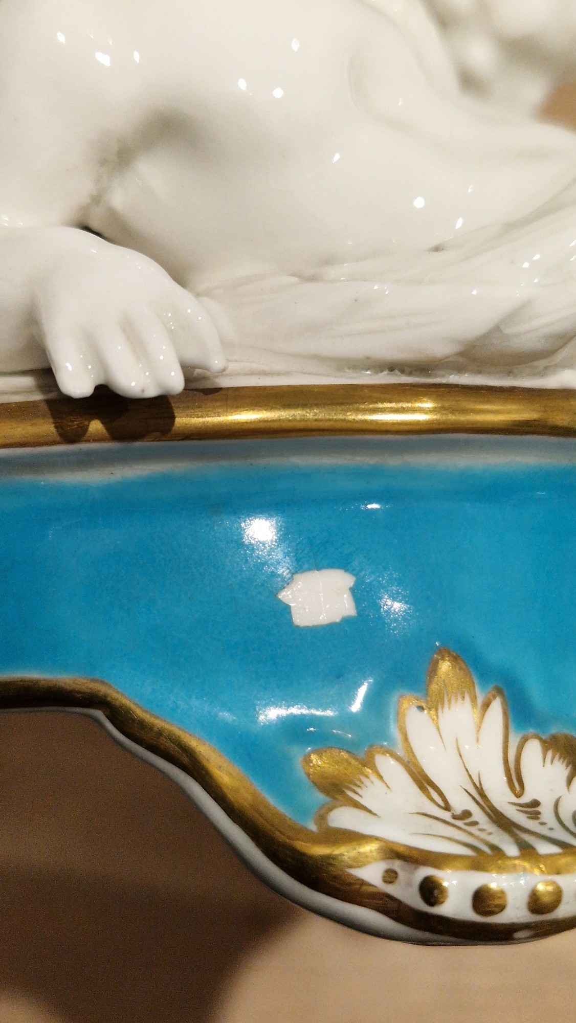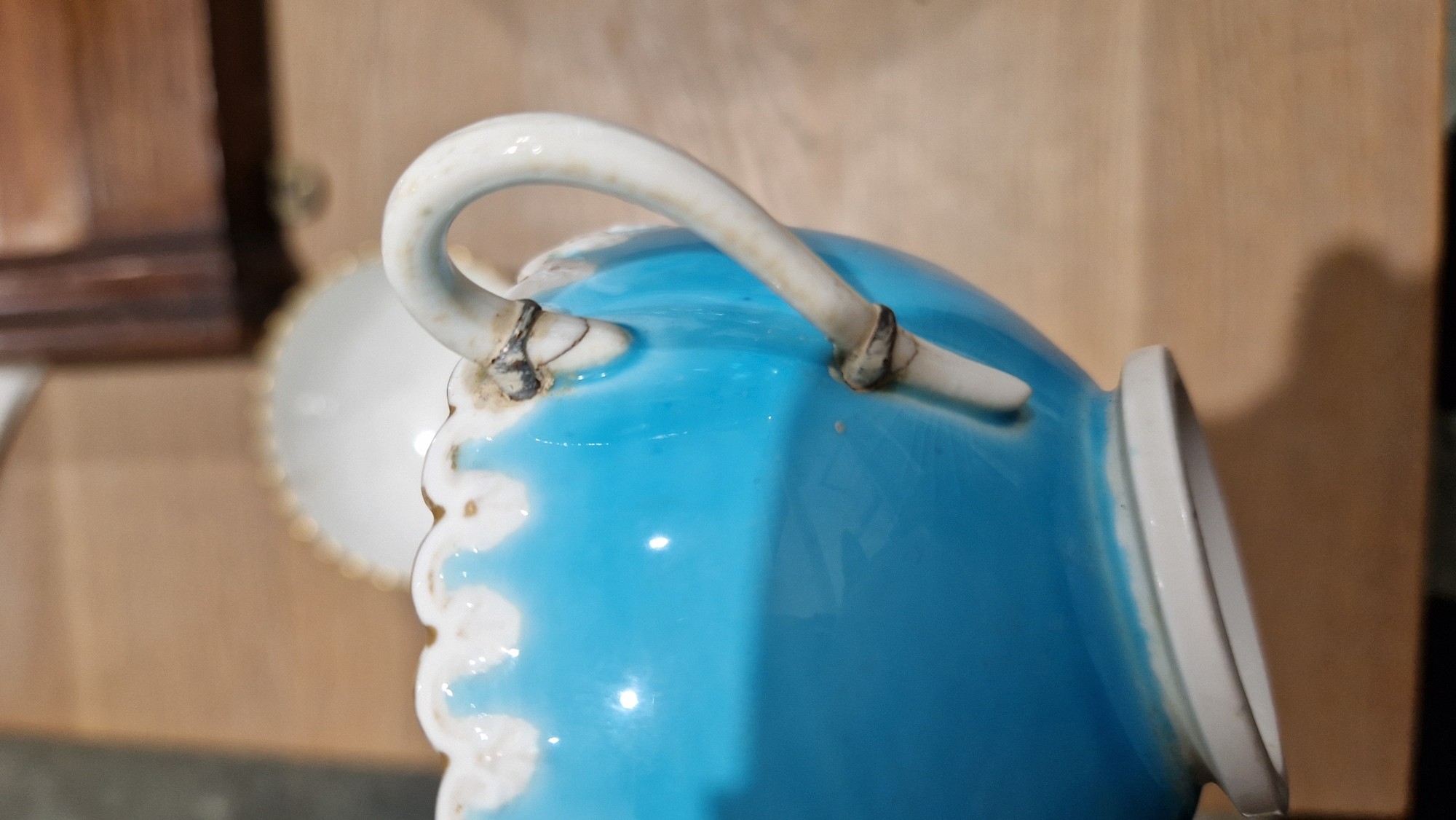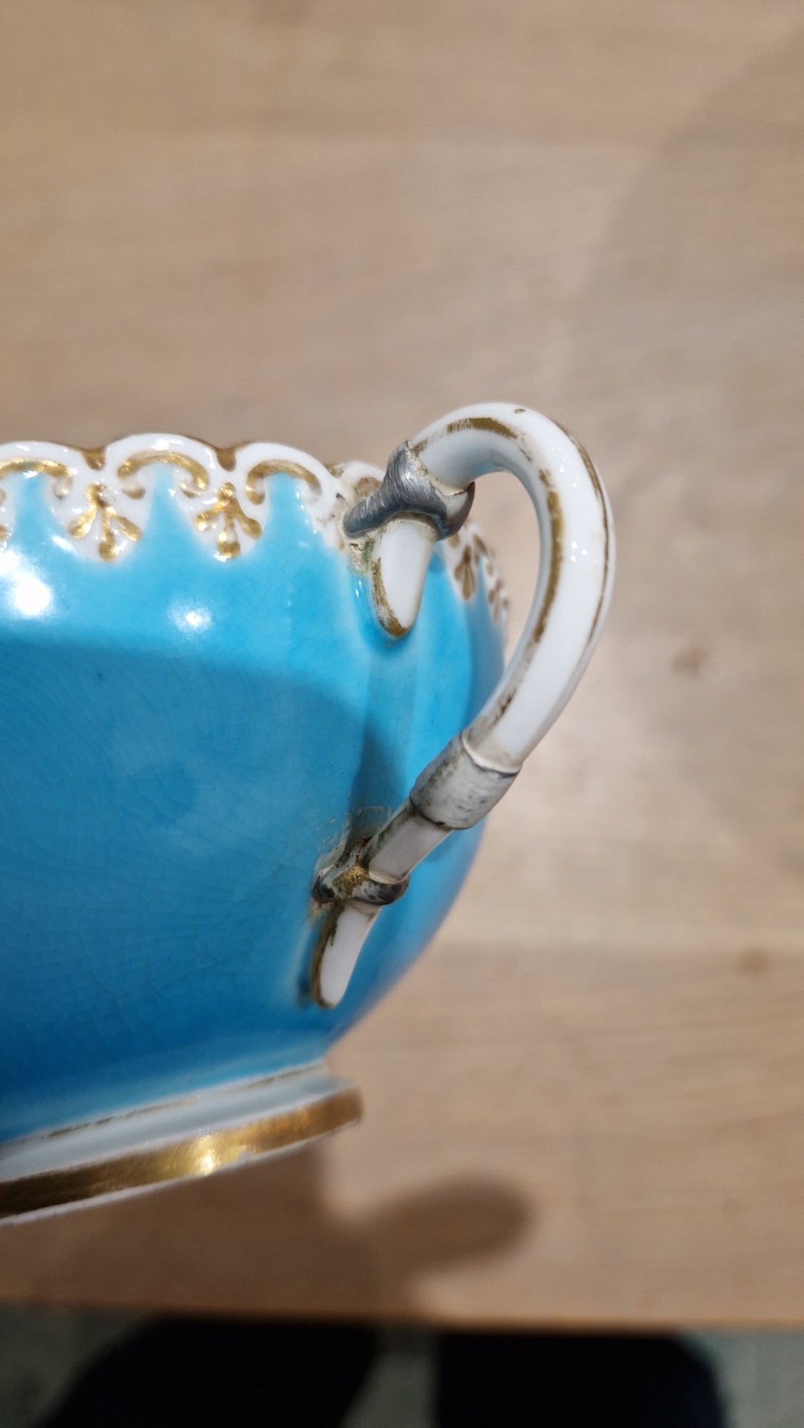 Two large comports - 24.5 cm diam. x 20 cm high: in good order. Four medium sized comports - 24.5 cm diam. x 14 cm high: one with chipping to putti's feet, another with one putto's head restuck and further light chipping to toes. Four low footed comports: one extensively cracked and riveted, another cracked and riveted and the third & fourth with patches of staining. Eighteen basket-moulded plates, 23.5 cm diam.: Three plates with C-scroll borders, one with section of rim cracked out but present, all extensively cracked and damaged. Slop bowl is extensively cracked and with riveted repairs. Seven teacups are cracked and riveted and the remainder are also cracked. All four coffee cups are cracked. Six saucers are cracked. Some rubbing, glaze crazing and wear to gilding and slight flaking to turquoise ground.