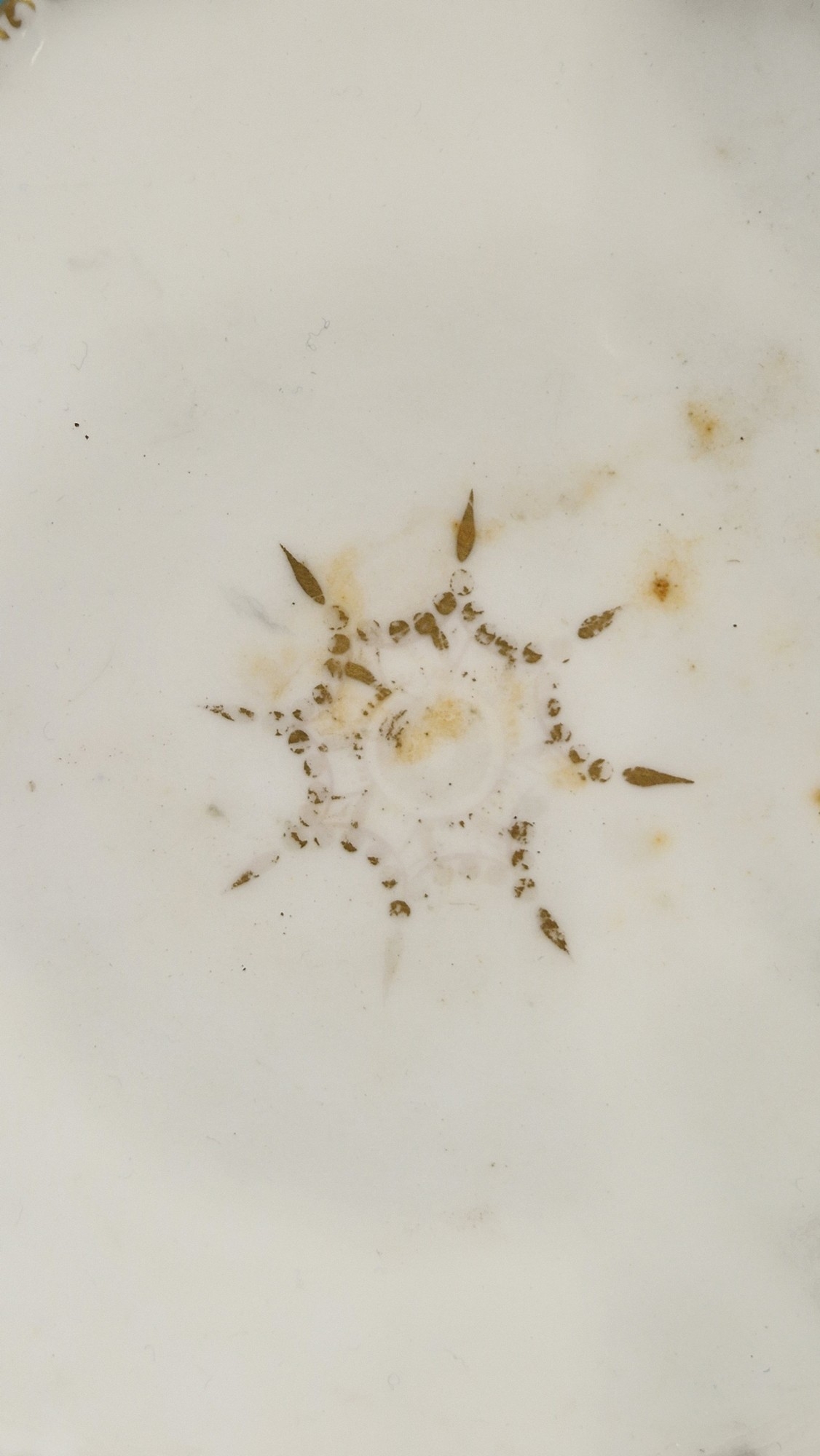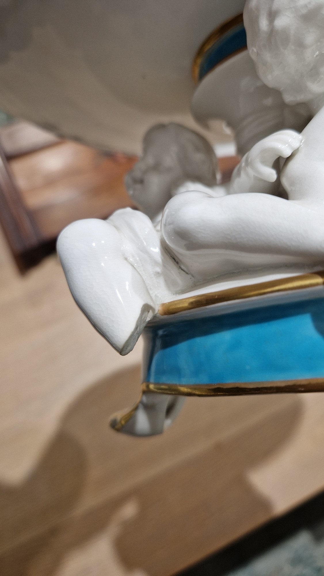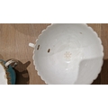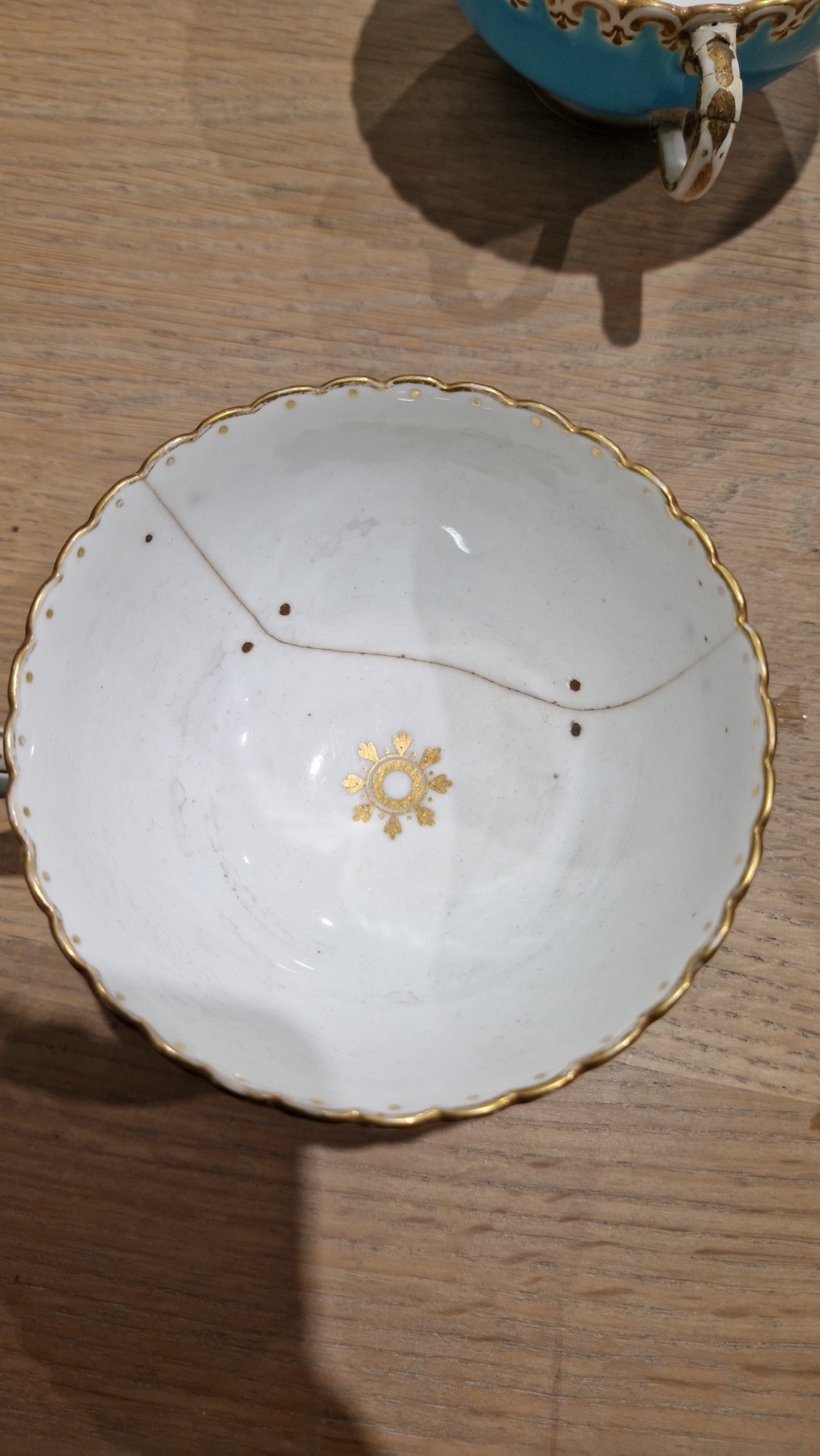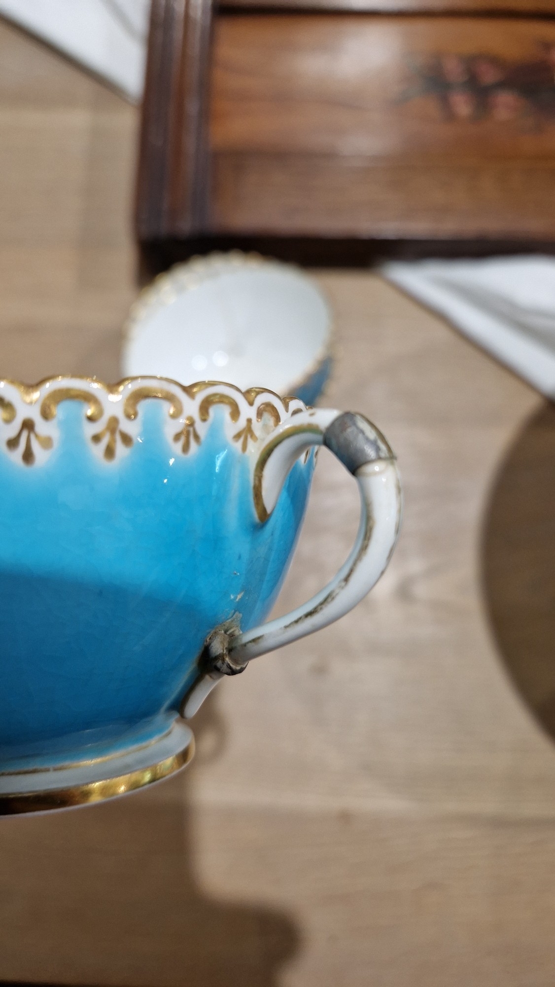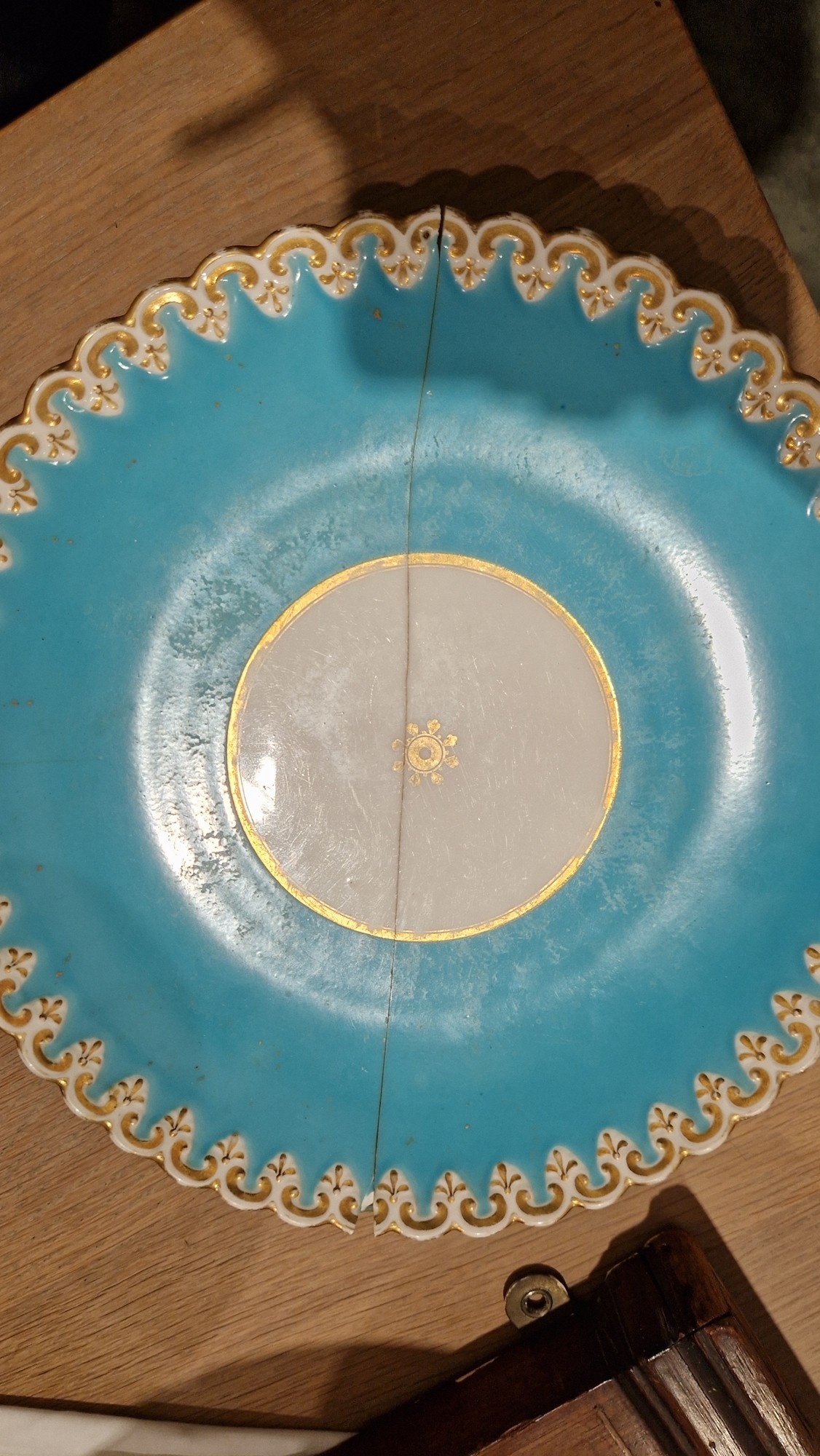 Two large comports - 24.5 cm diam. x 20 cm high: in good order. Four medium sized comports - 24.5 cm diam. x 14 cm high: one with chipping to putti's feet, another with one putto's head restuck and further light chipping to toes. Four low footed comports: one extensively cracked and riveted, another cracked and riveted and the third & fourth with patches of staining. Eighteen basket-moulded plates, 23.5 cm diam.: Three plates with C-scroll borders, one with section of rim cracked out but present, all extensively cracked and damaged. Slop bowl is extensively cracked and with riveted repairs. Seven teacups are cracked and riveted and the remainder are also cracked. All four coffee cups are cracked. Six saucers are cracked. Some rubbing, glaze crazing and wear to gilding and slight flaking to turquoise ground.