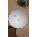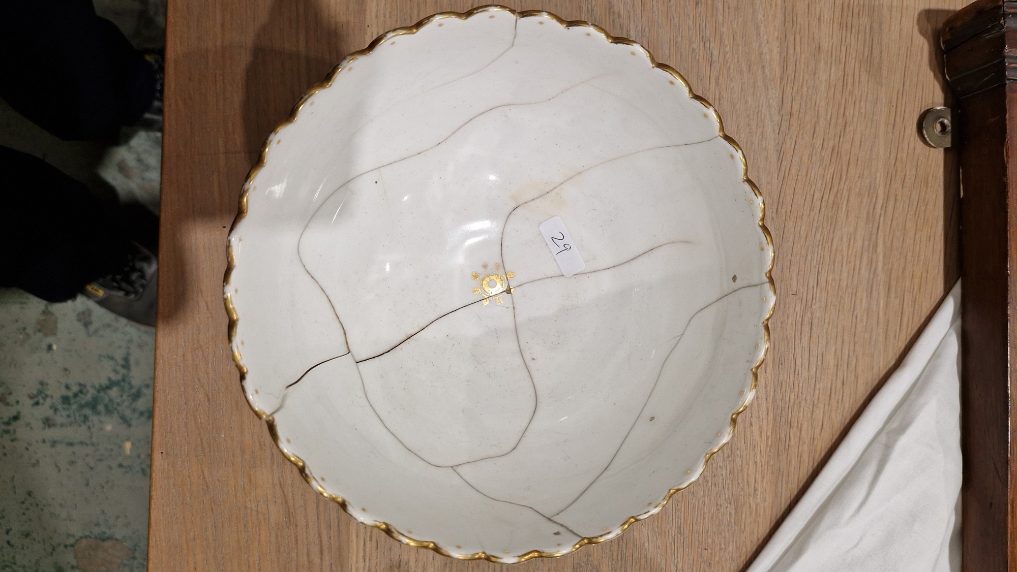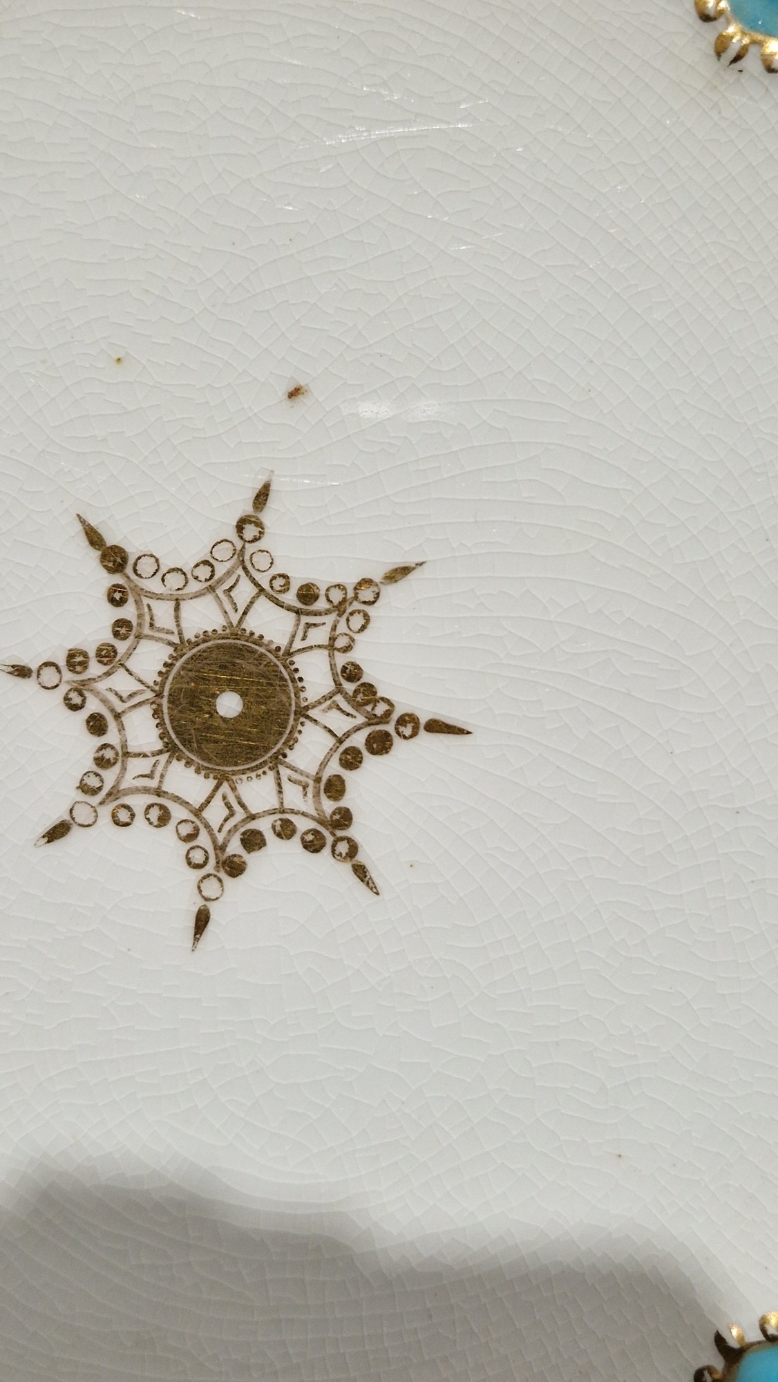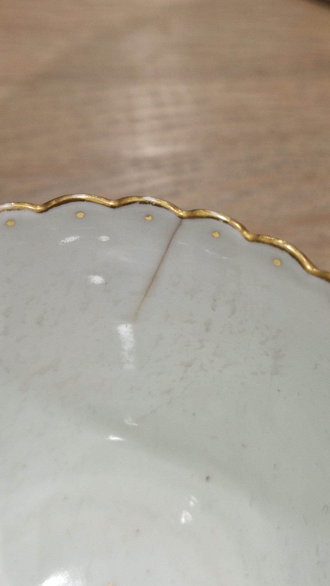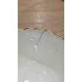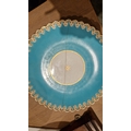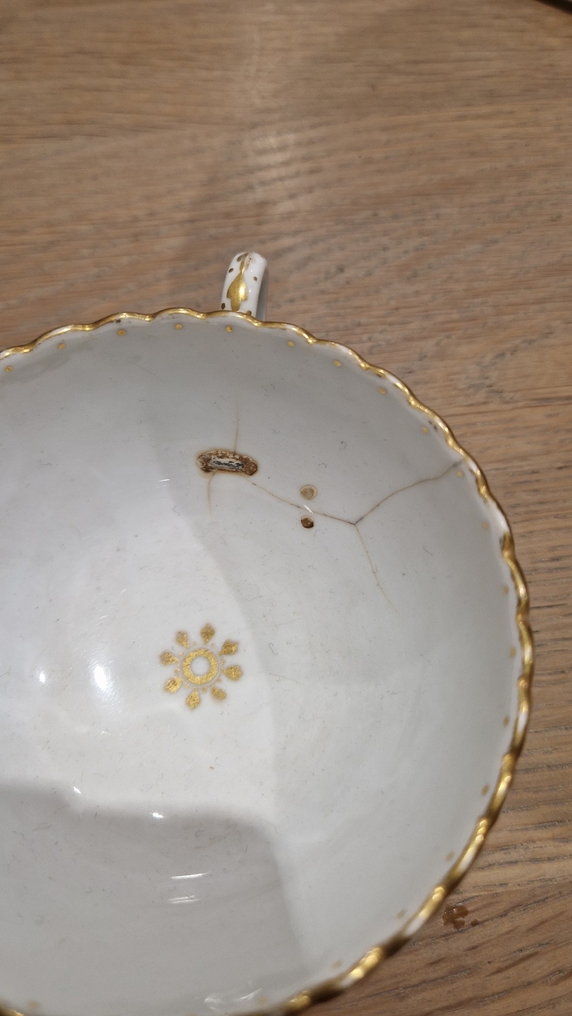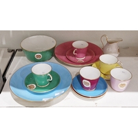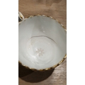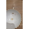 Two large comports - 24.5 cm diam. x 20 cm high: in good order. Four medium sized comports - 24.5 cm diam. x 14 cm high: one with chipping to putti's feet, another with one putto's head restuck and further light chipping to toes. Four low footed comports: one extensively cracked and riveted, another cracked and riveted and the third & fourth with patches of staining. Eighteen basket-moulded plates, 23.5 cm diam.: Three plates with C-scroll borders, one with section of rim cracked out but present, all extensively cracked and damaged. Slop bowl is extensively cracked and with riveted repairs. Seven teacups are cracked and riveted and the remainder are also cracked. All four coffee cups are cracked. Six saucers are cracked. Some rubbing, glaze crazing and wear to gilding and slight flaking to turquoise ground.