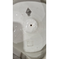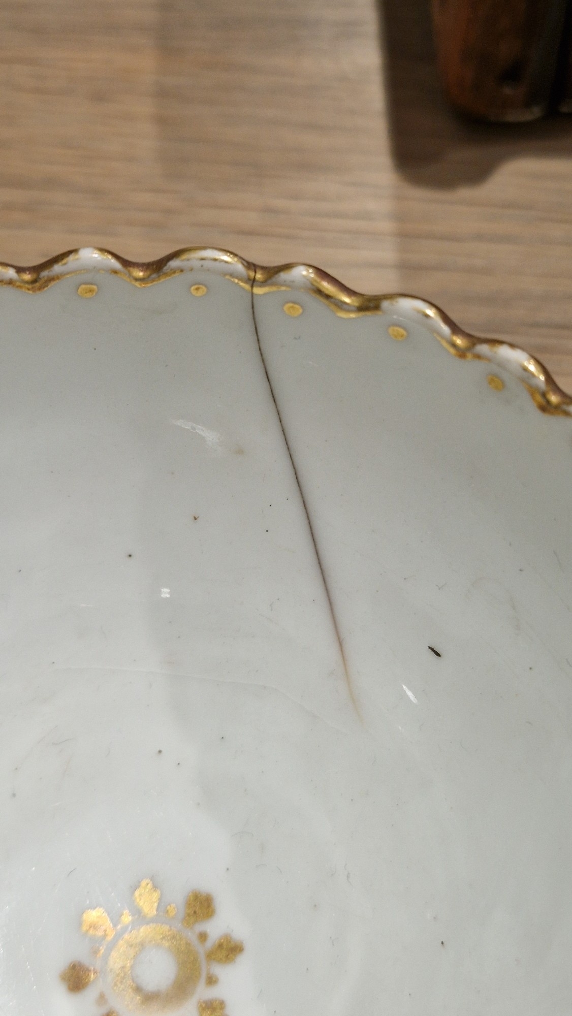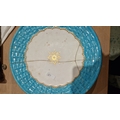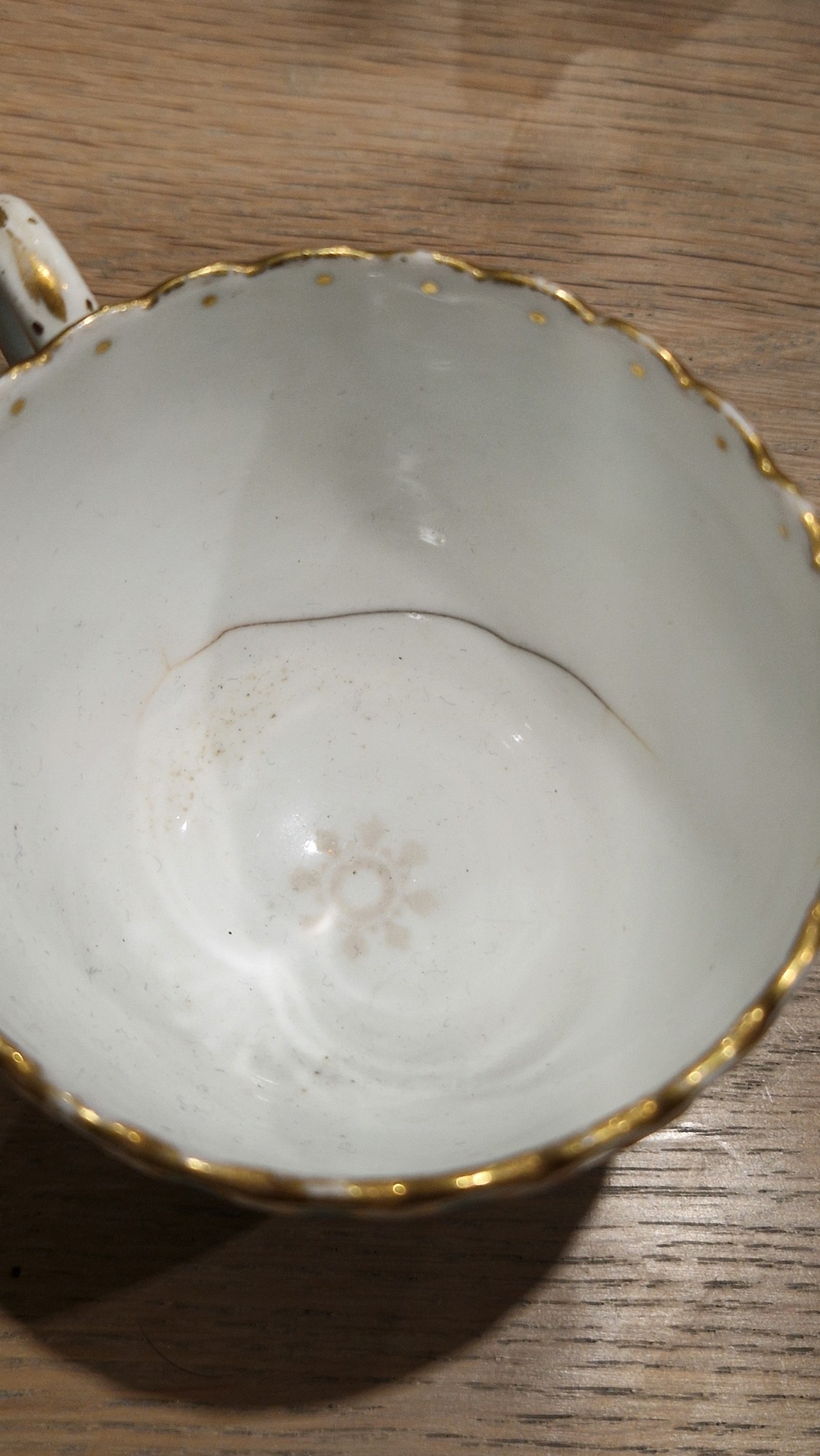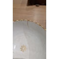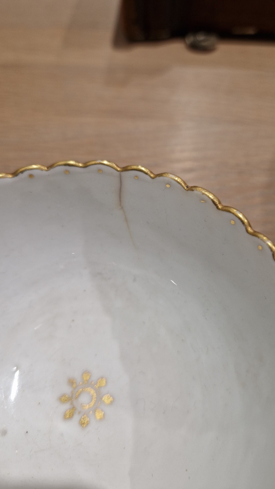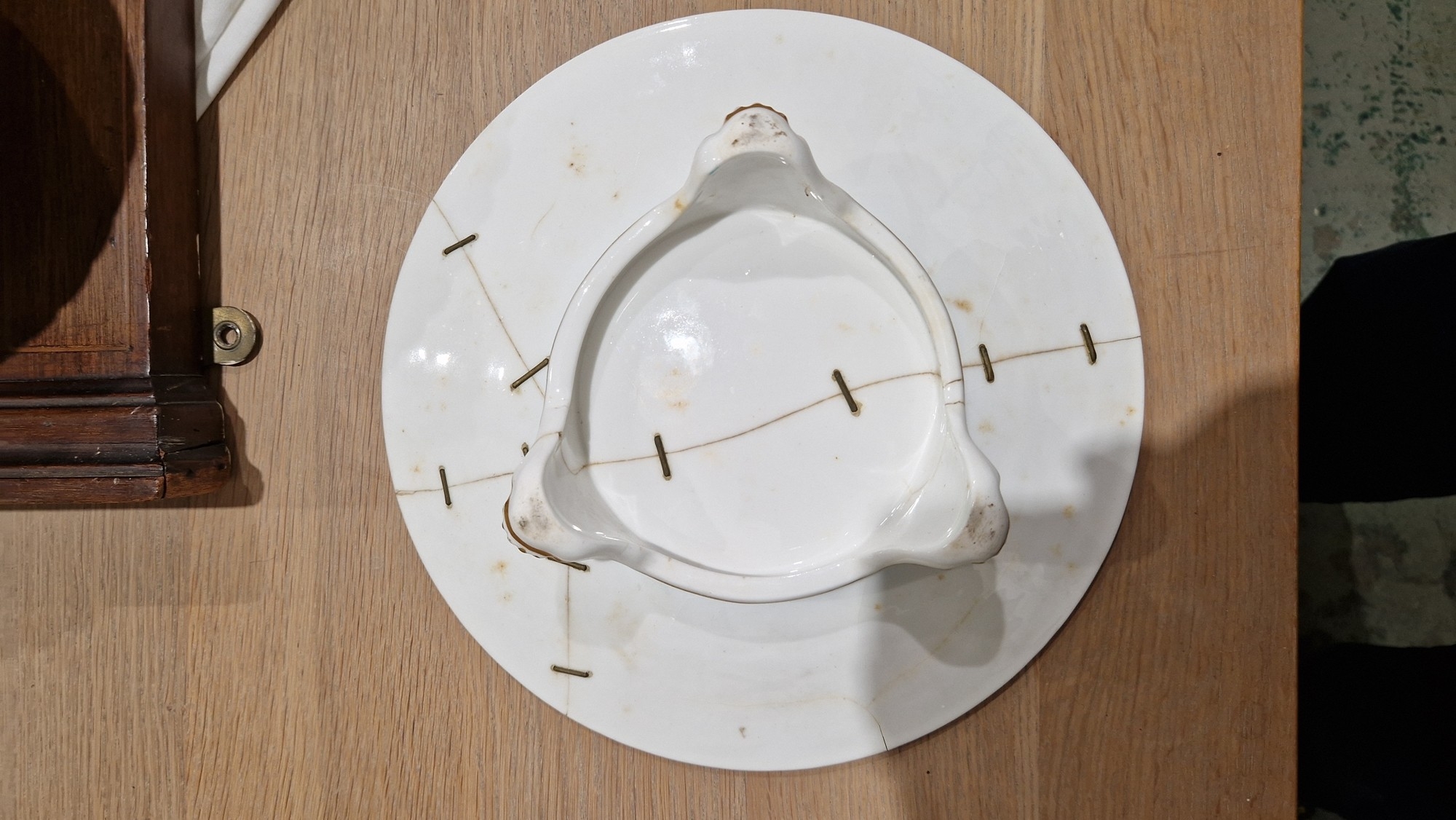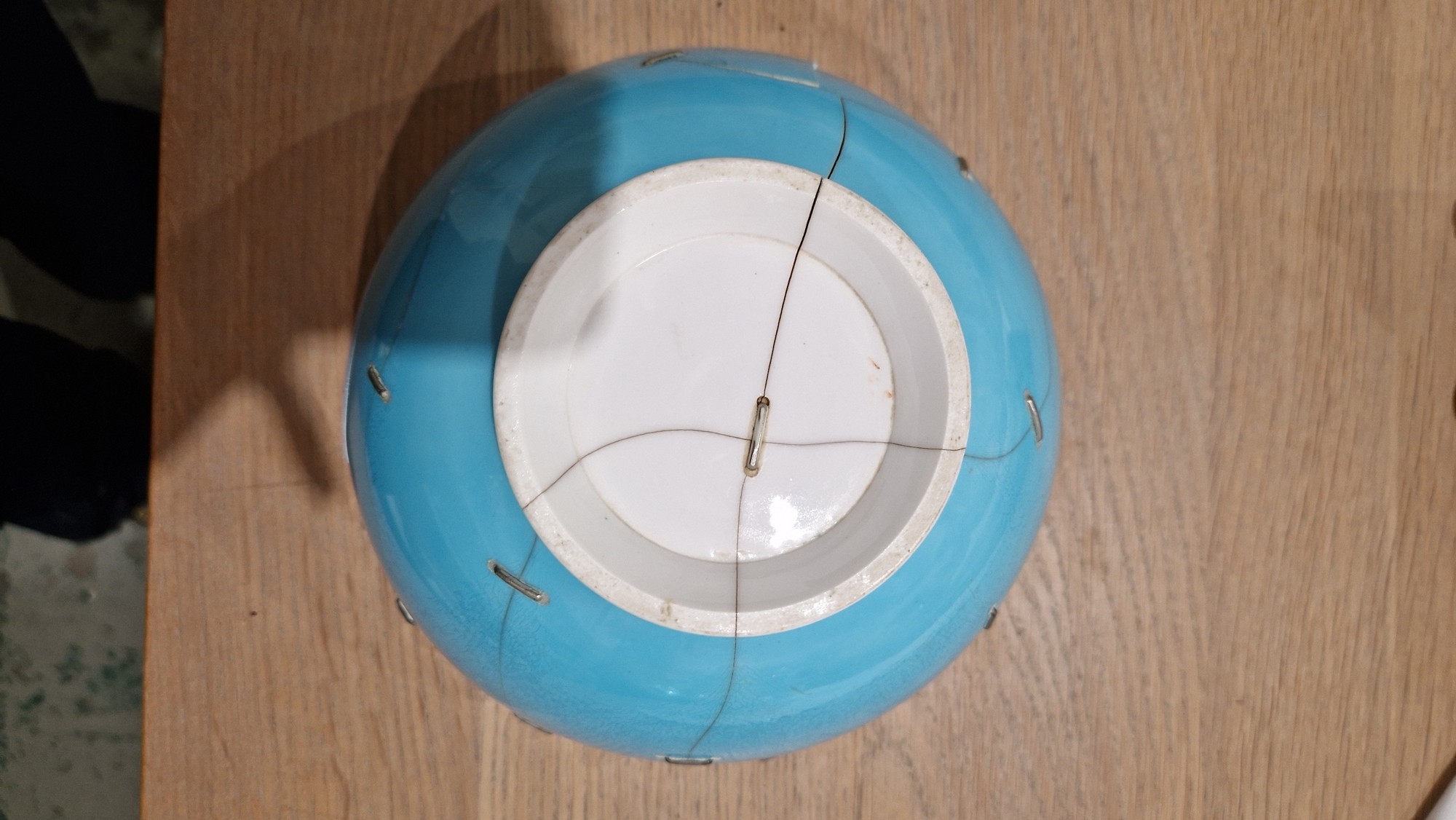 Two large comports - 24.5 cm diam. x 20 cm high: in good order. Four medium sized comports - 24.5 cm diam. x 14 cm high: one with chipping to putti's feet, another with one putto's head restuck and further light chipping to toes. Four low footed comports: one extensively cracked and riveted, another cracked and riveted and the third & fourth with patches of staining. Eighteen basket-moulded plates, 23.5 cm diam.: Three plates with C-scroll borders, one with section of rim cracked out but present, all extensively cracked and damaged. Slop bowl is extensively cracked and with riveted repairs. Seven teacups are cracked and riveted and the remainder are also cracked. All four coffee cups are cracked. Six saucers are cracked. Some rubbing, glaze crazing and wear to gilding and slight flaking to turquoise ground.