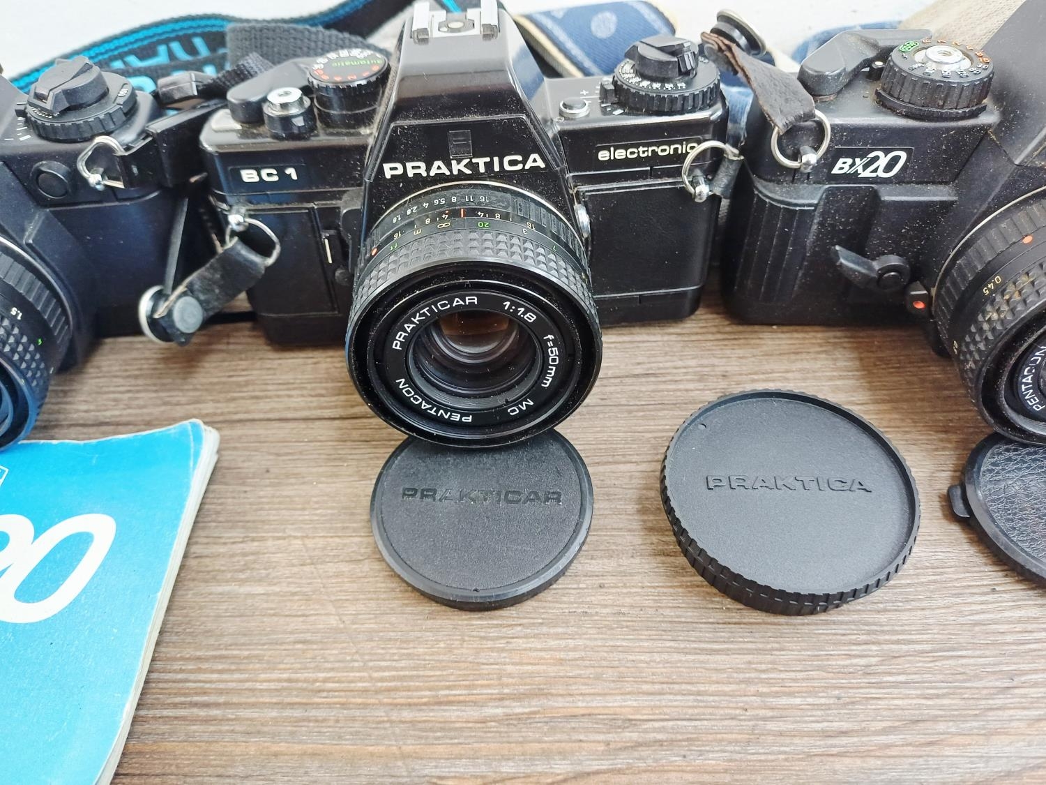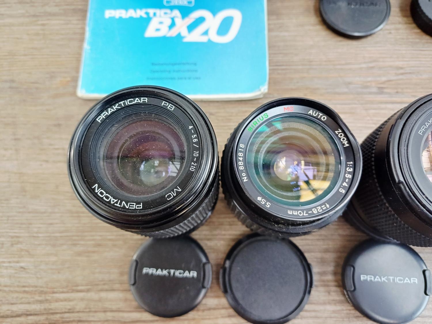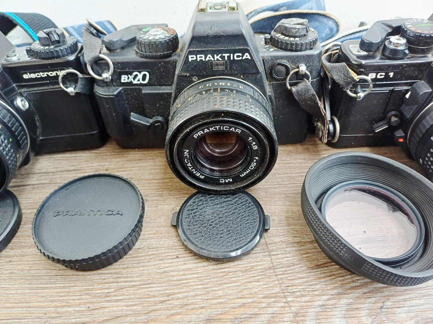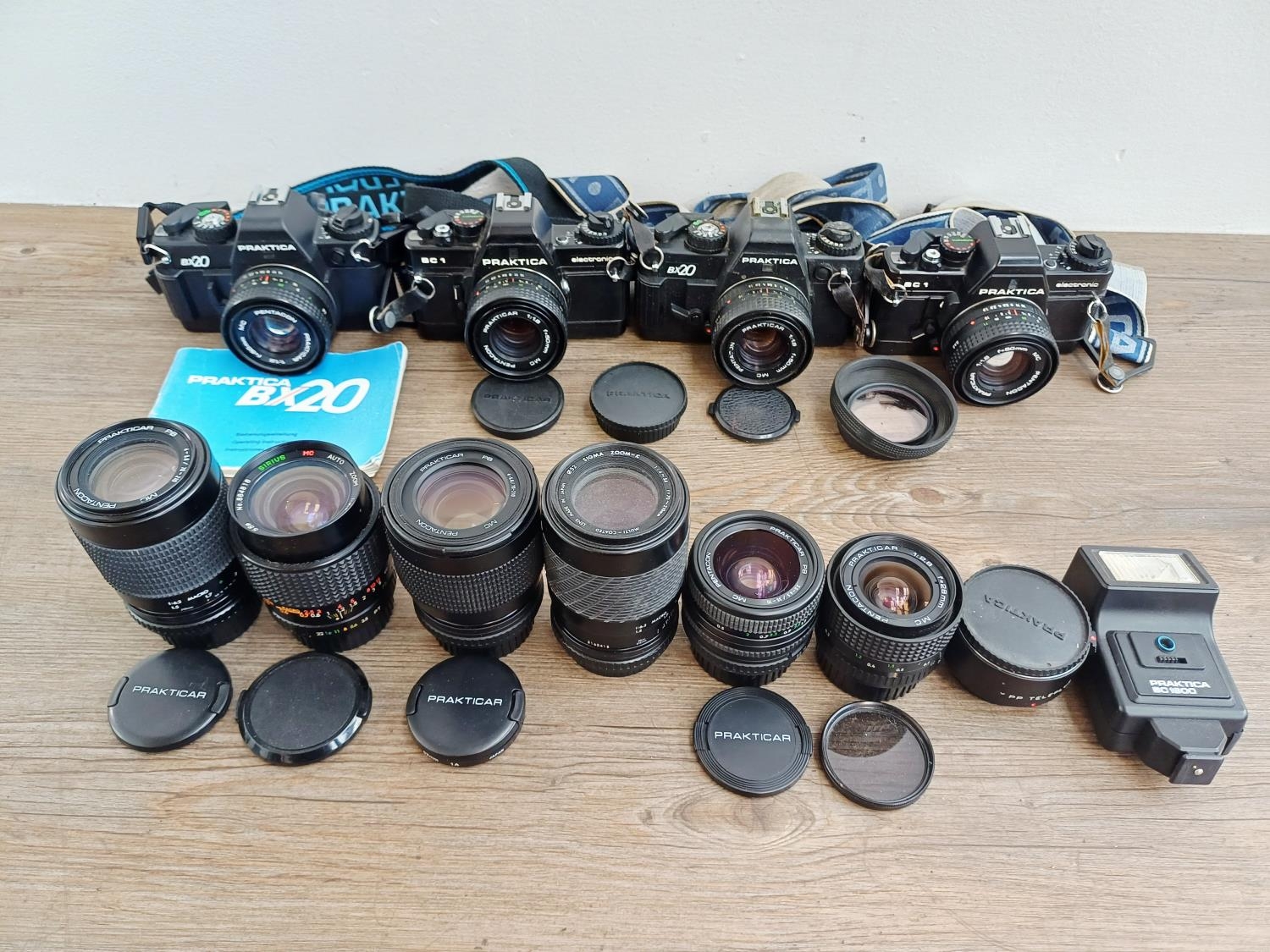 Four Praktica 35mm SLR cameras fitted with Prakticar MC 1:1.8 50mm lenses, two BX20 and two BC1 together with seven compatible lenses to include Prakticar MC 1:2.8 28mm, 1:3.5-4.5 35-70mm and 1:4-5.6 70-210mm etc.