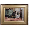 An early 20th century unattributed oil on canvas of a retired hound, titled and dated 'Sixpence 1911' 21.5 x 32cms, gilt frame
