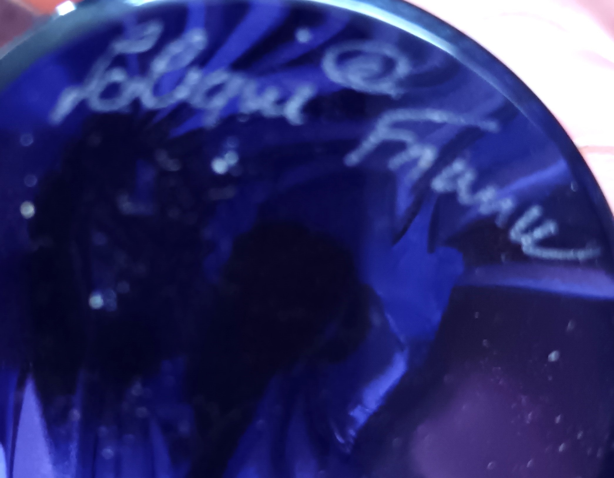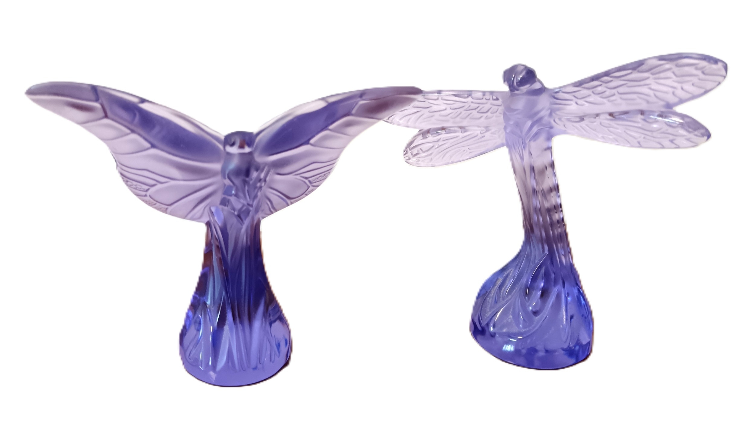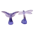 Two Lalique purple frosted crystal figures, modelled as a butterfly and a dragonfly, each with typical moulded detail and satin finish, bearing etched marks (2)