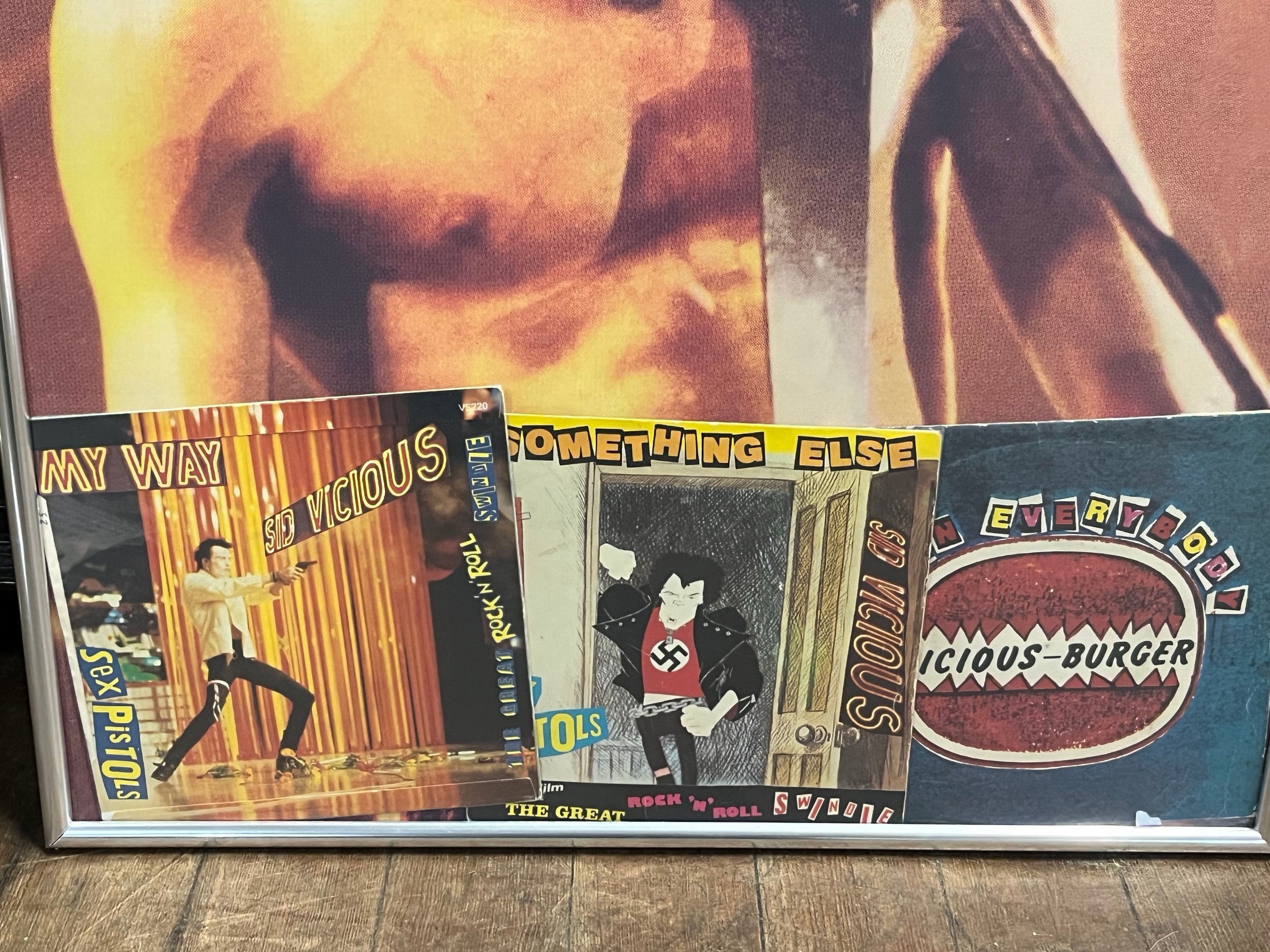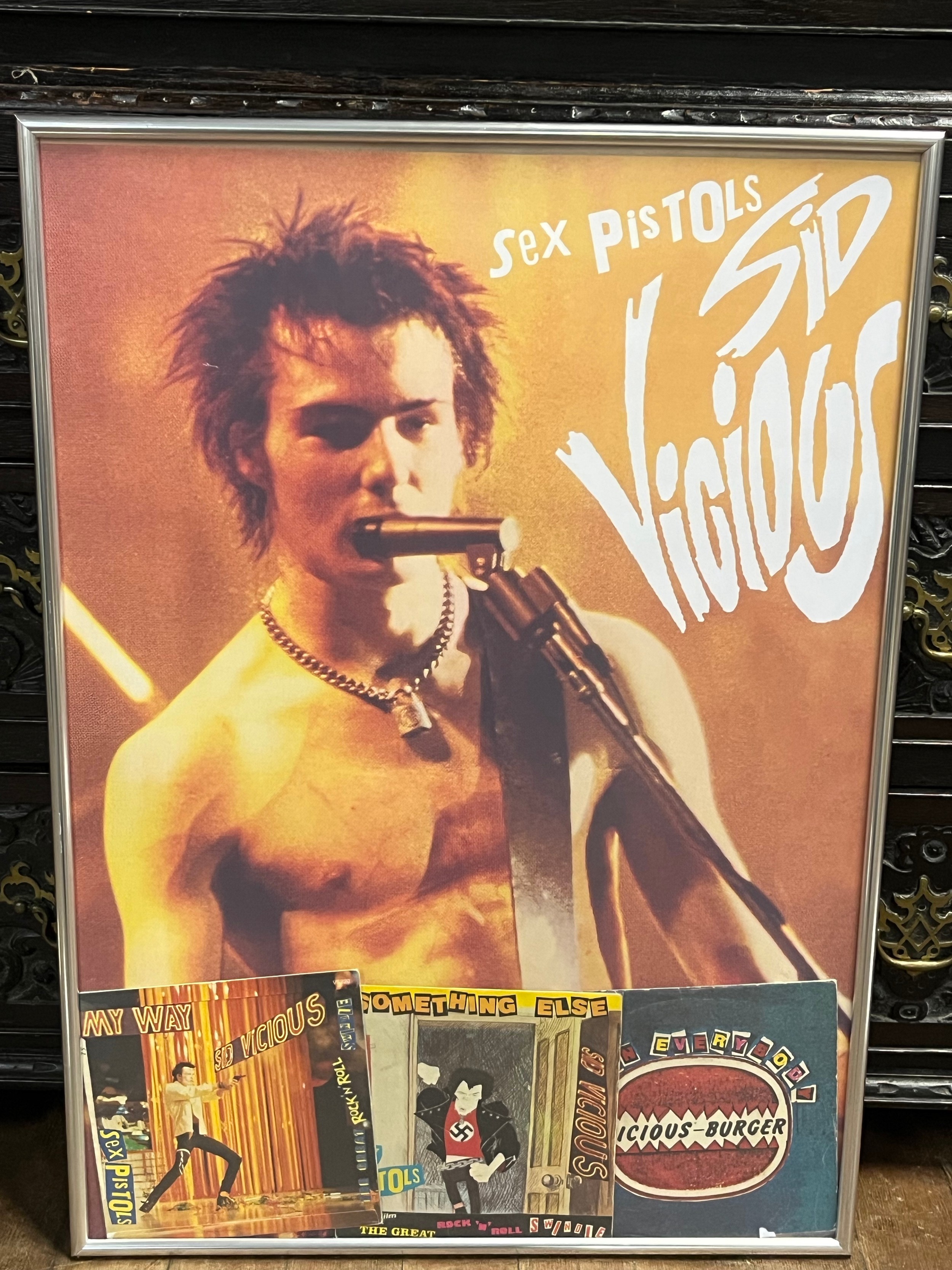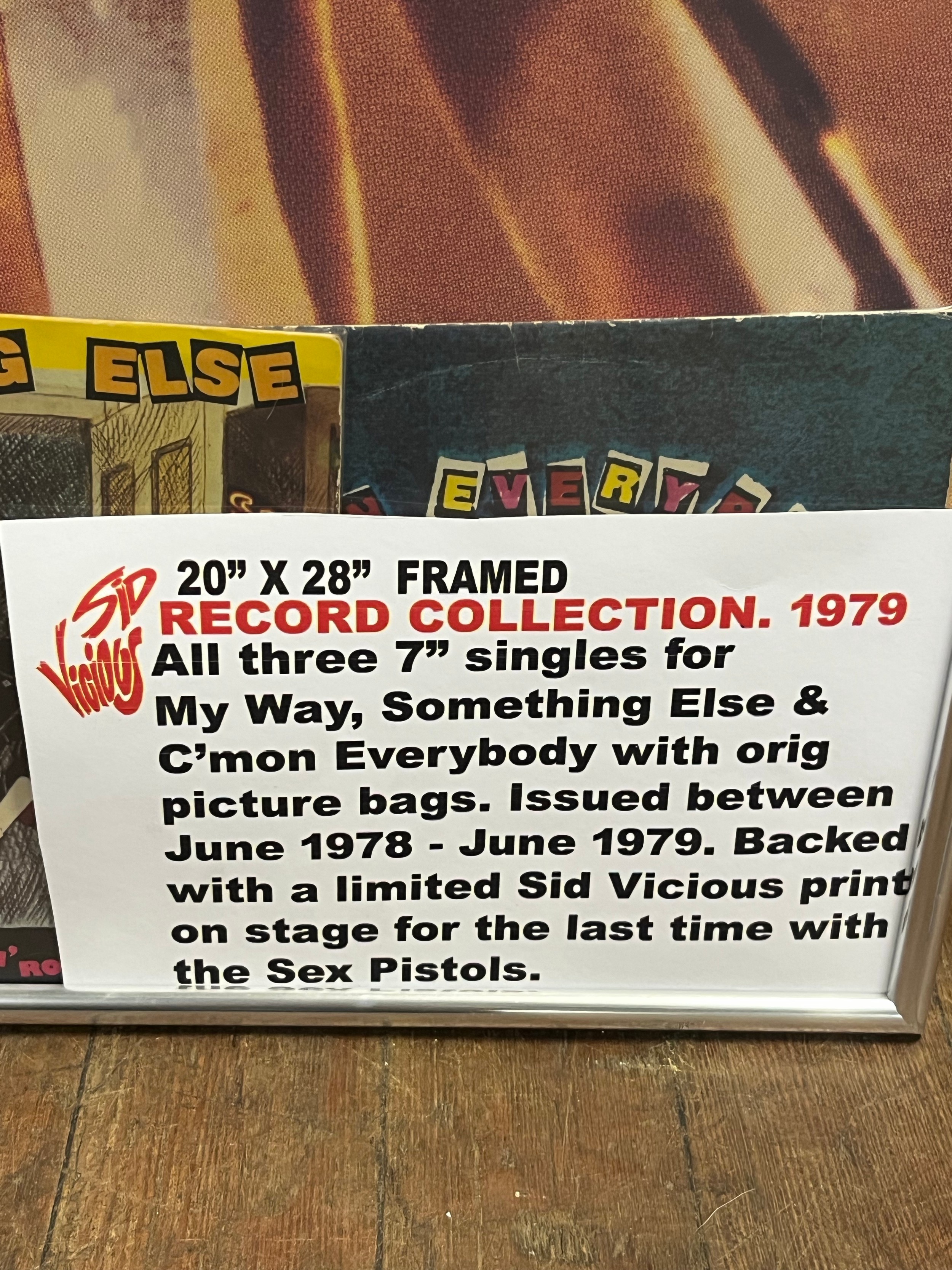 Framed record collection 7" singles for my way, something else and come on everybody with original picture mags. backed with limited Sid Vicious (Info in pictures) 20x28"