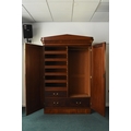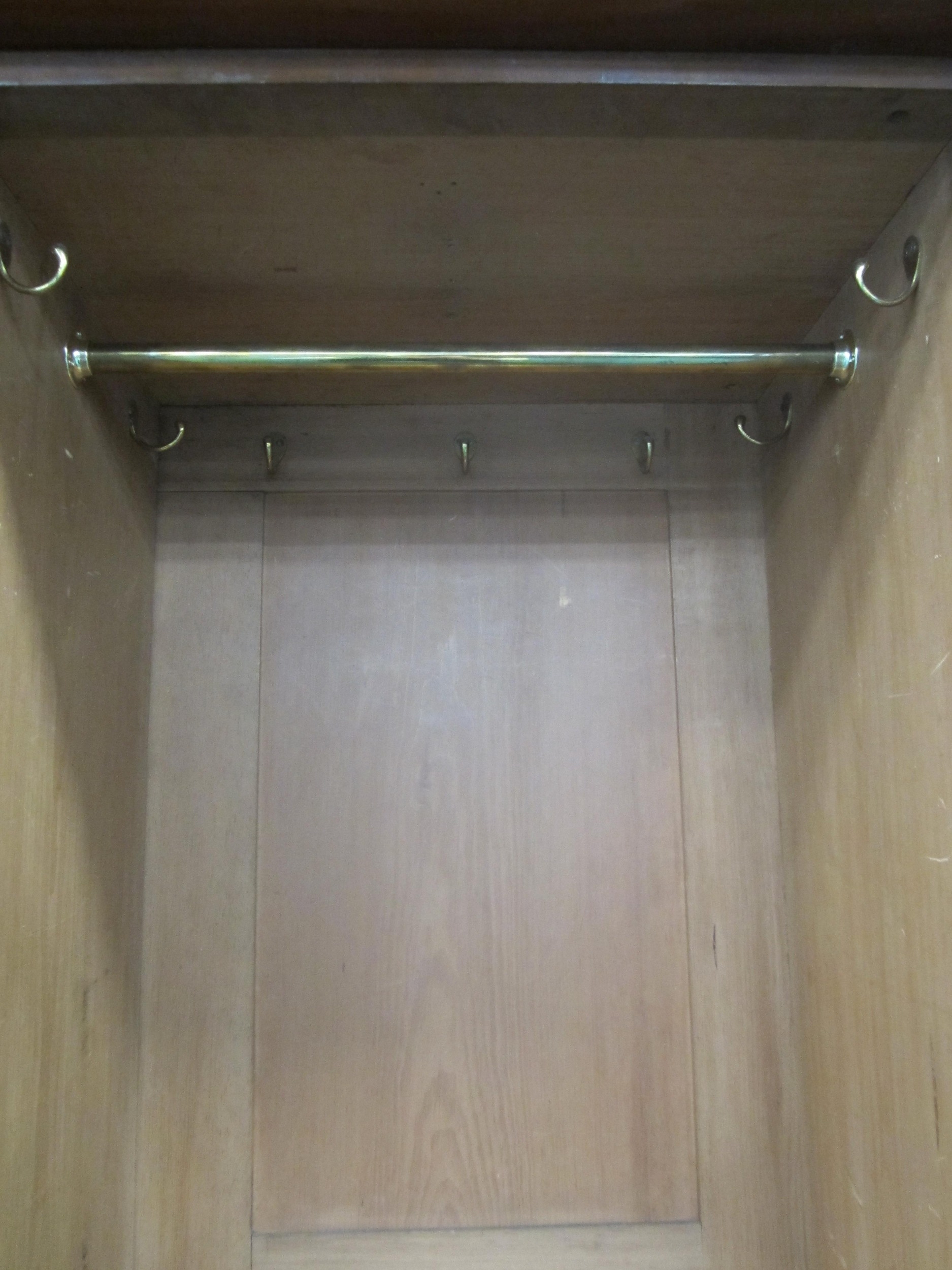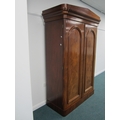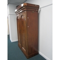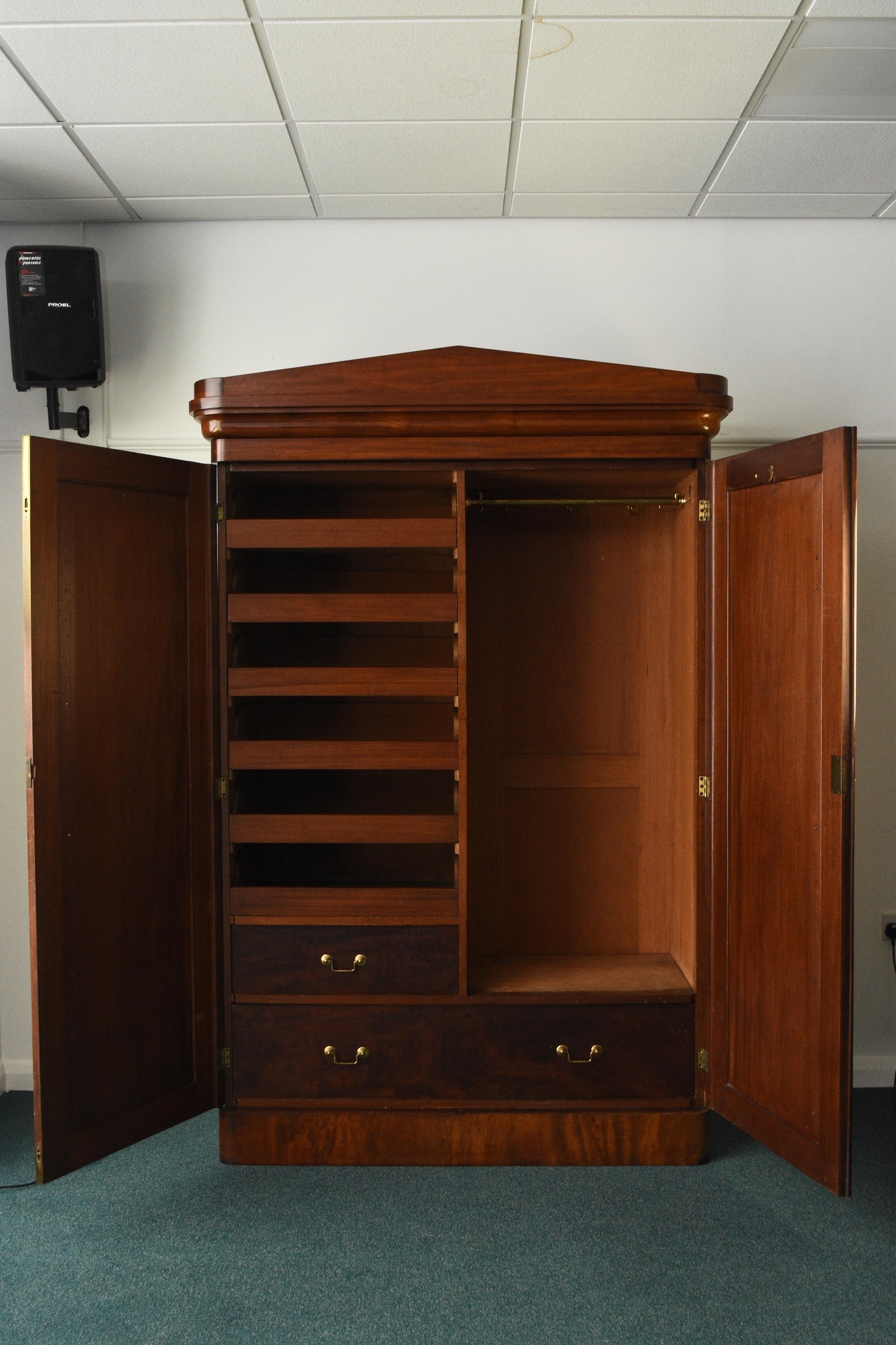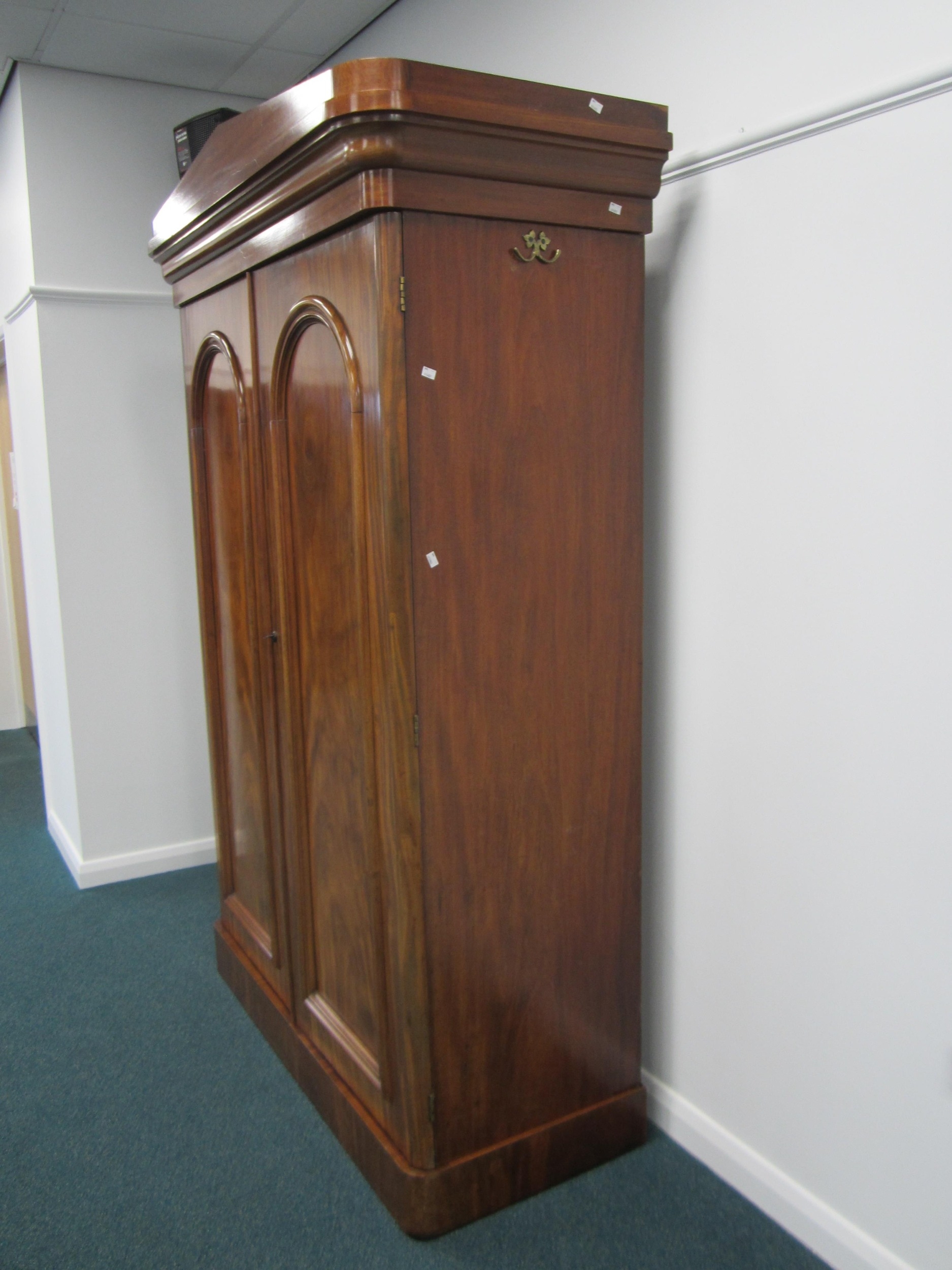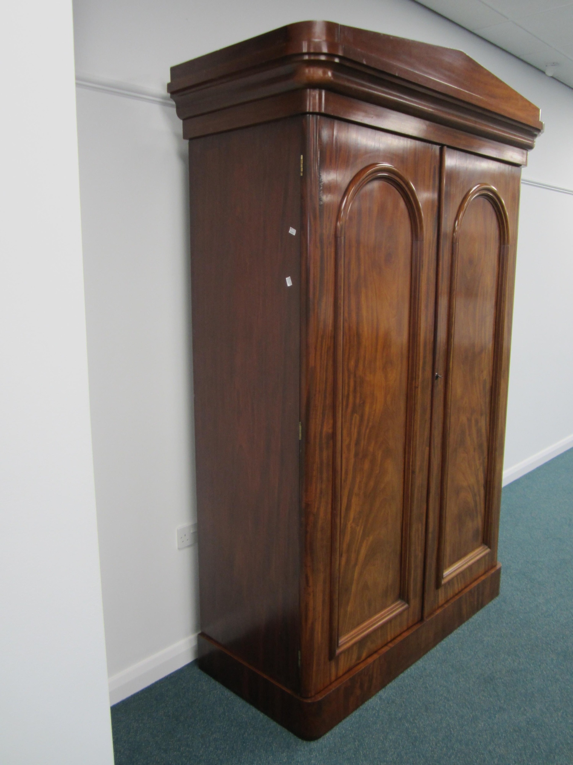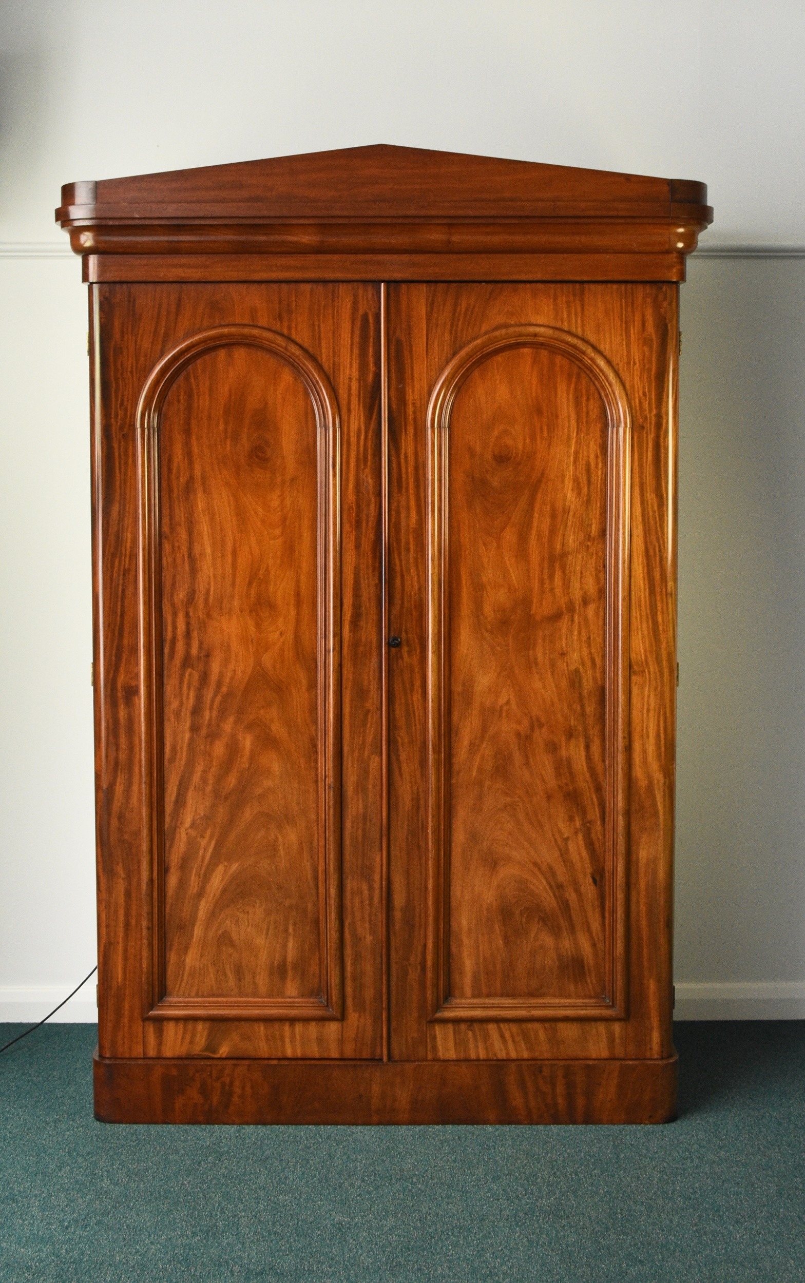 A Victorian mahogany armoire The pedimented ogee cornice above twin arch-panelled doors, the interior with six short slides above one short and one long drawer, beside a hanging compartment, raised on a plinth base. With key. 150cm wide x 66cm deep x 230cm high Condition:Good overall with only minor signs of age and use consistent with age, cosmetic marks, very small dints and scuffs. No evidence of worm.