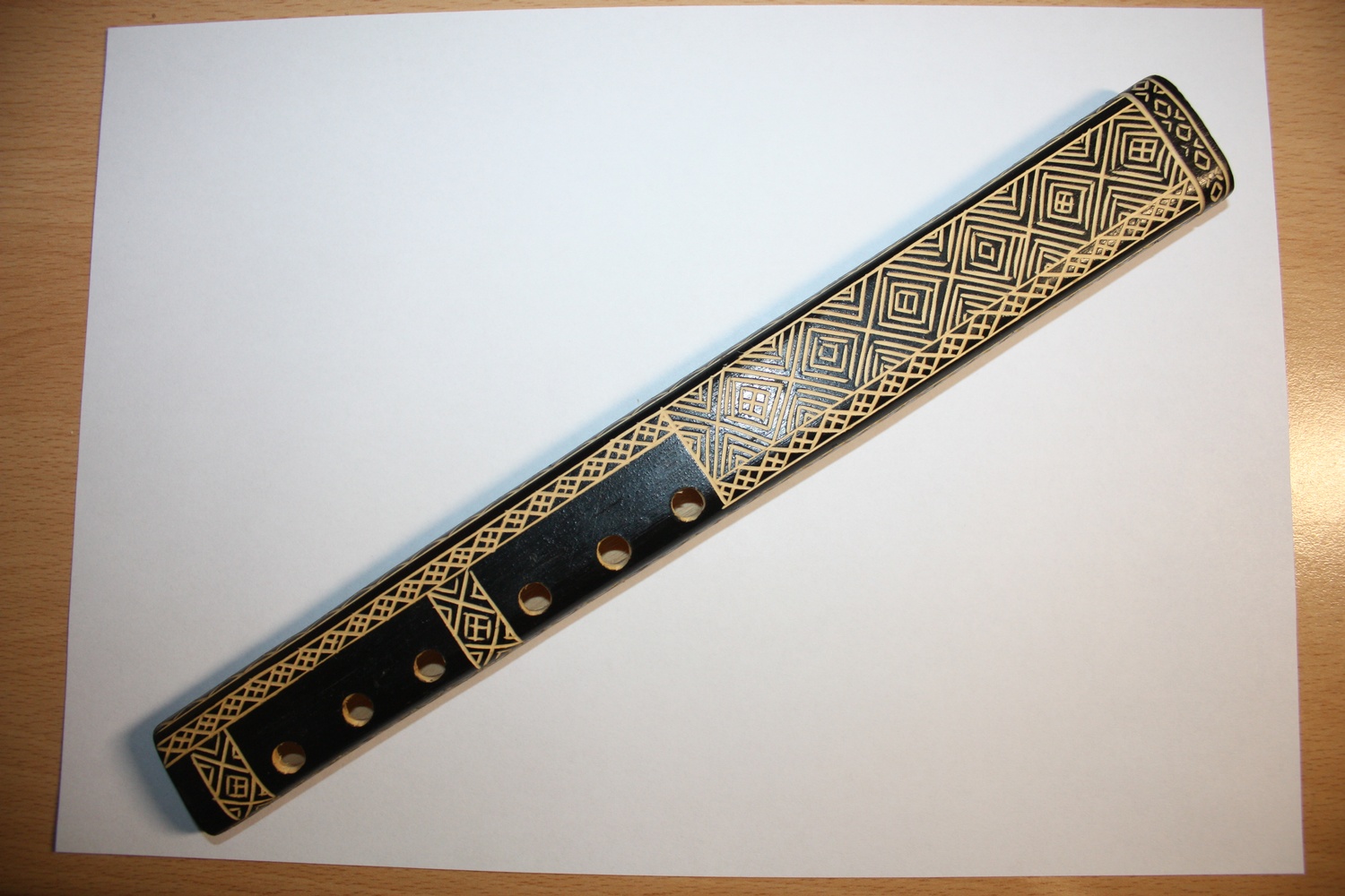 An Iranian Flute- approximately 10" long in an ebonised finish with cream geometric patterns
