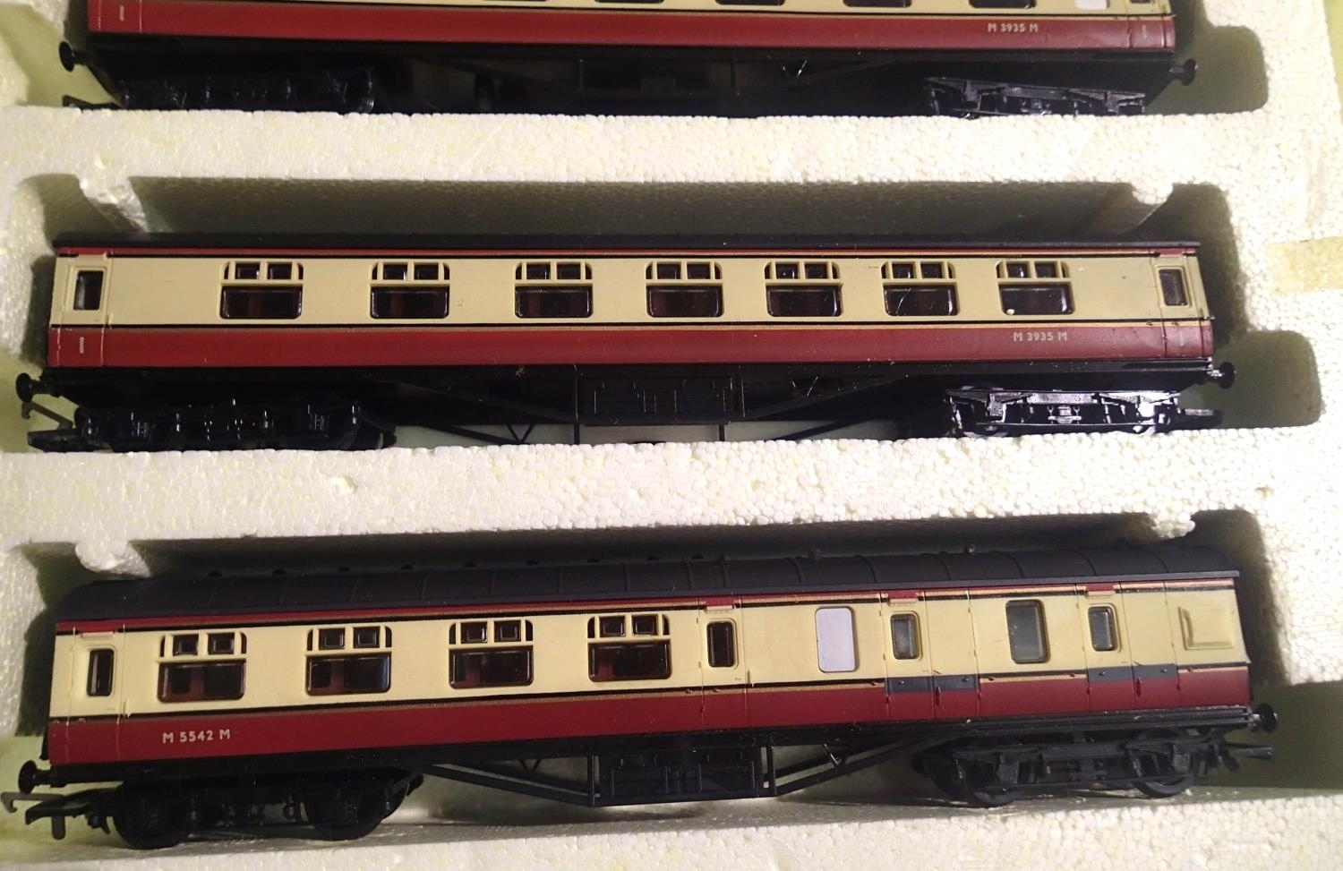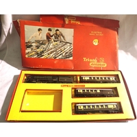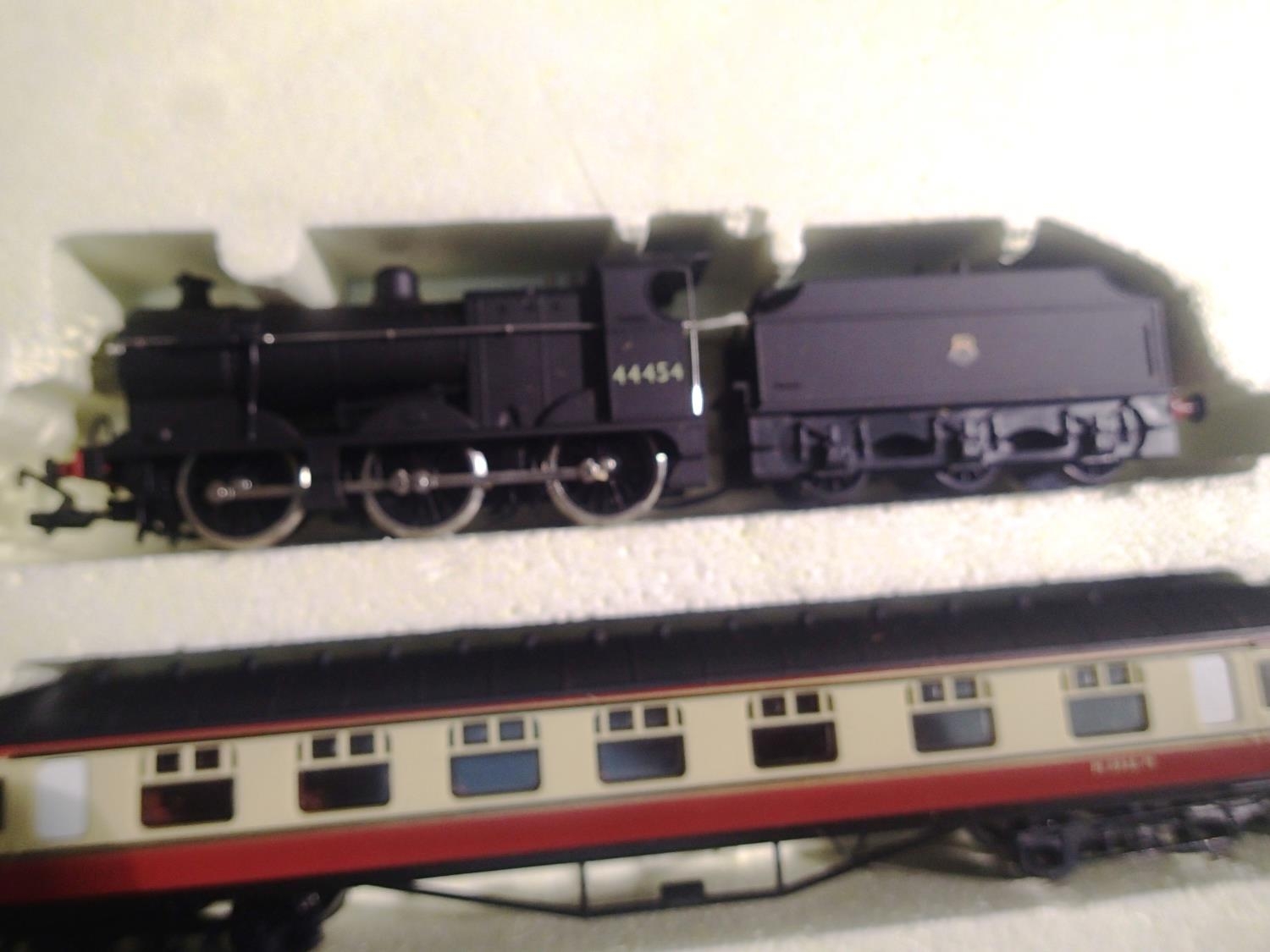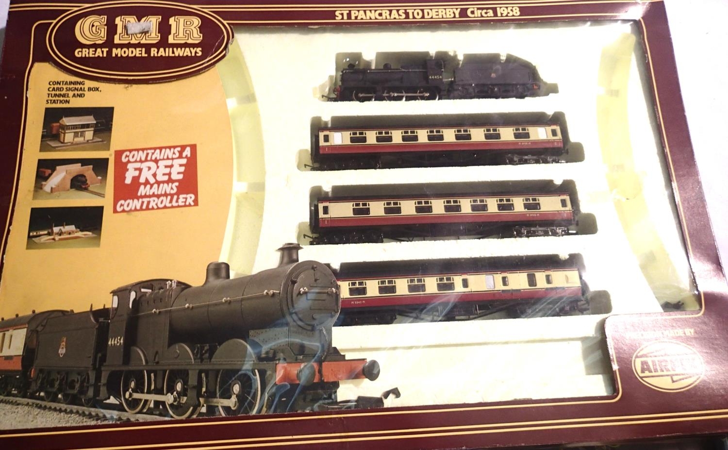 OO scale Airfix St Pancras Derby train set comprising of Fowler 4F, 44454, Black Early Crest with three crimson/ cream coaches and controller, no track, all in excellent condition, box with wear, tape etc. P&P Group 1 (£14+VAT for the first lot and £1+VAT for subsequent lots)