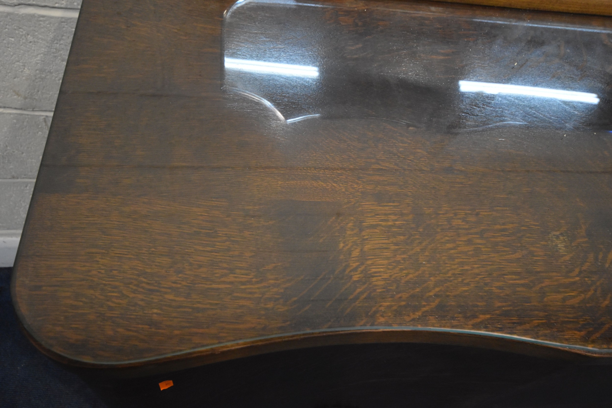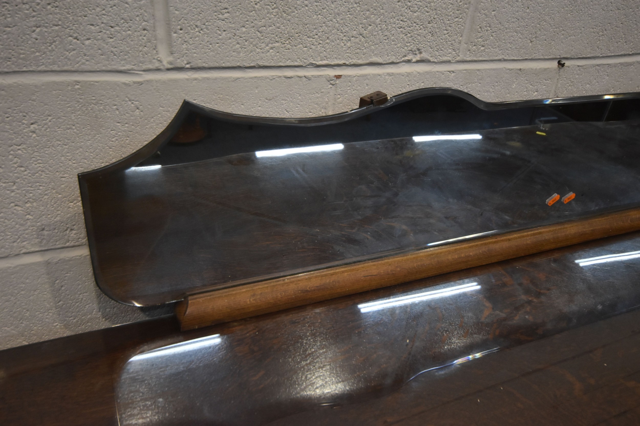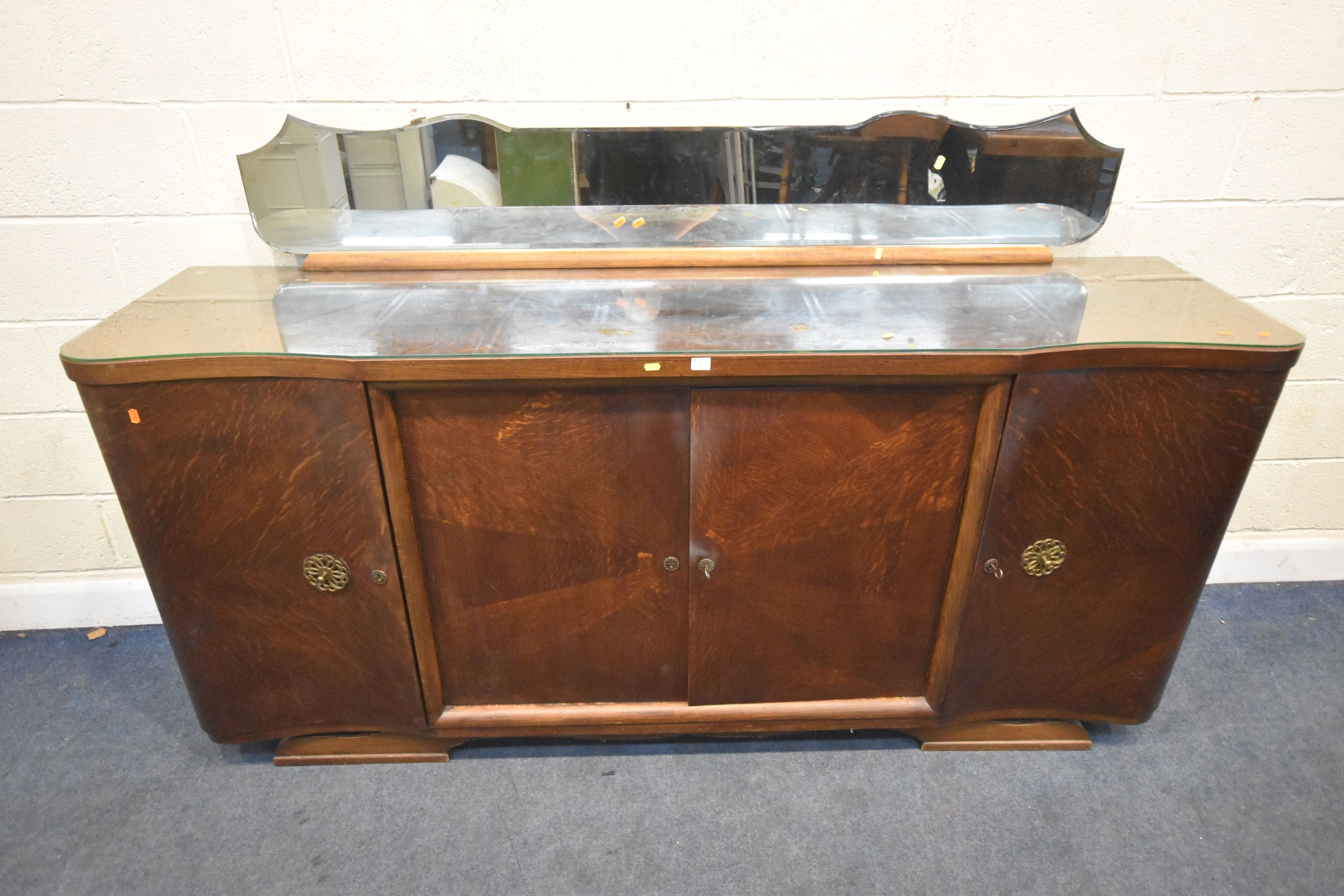 AN EARLY 20TH CENTURY OAK SIDEBOARD, with a raised mirror back, and four cupboard doors, length 210cm x depth 57cm x height 129cm x height of base 98cm, condition report: two keys, glass protective surface present, historical marks, scuffs, stains, discolouration, one handle loose, other wear and usage