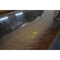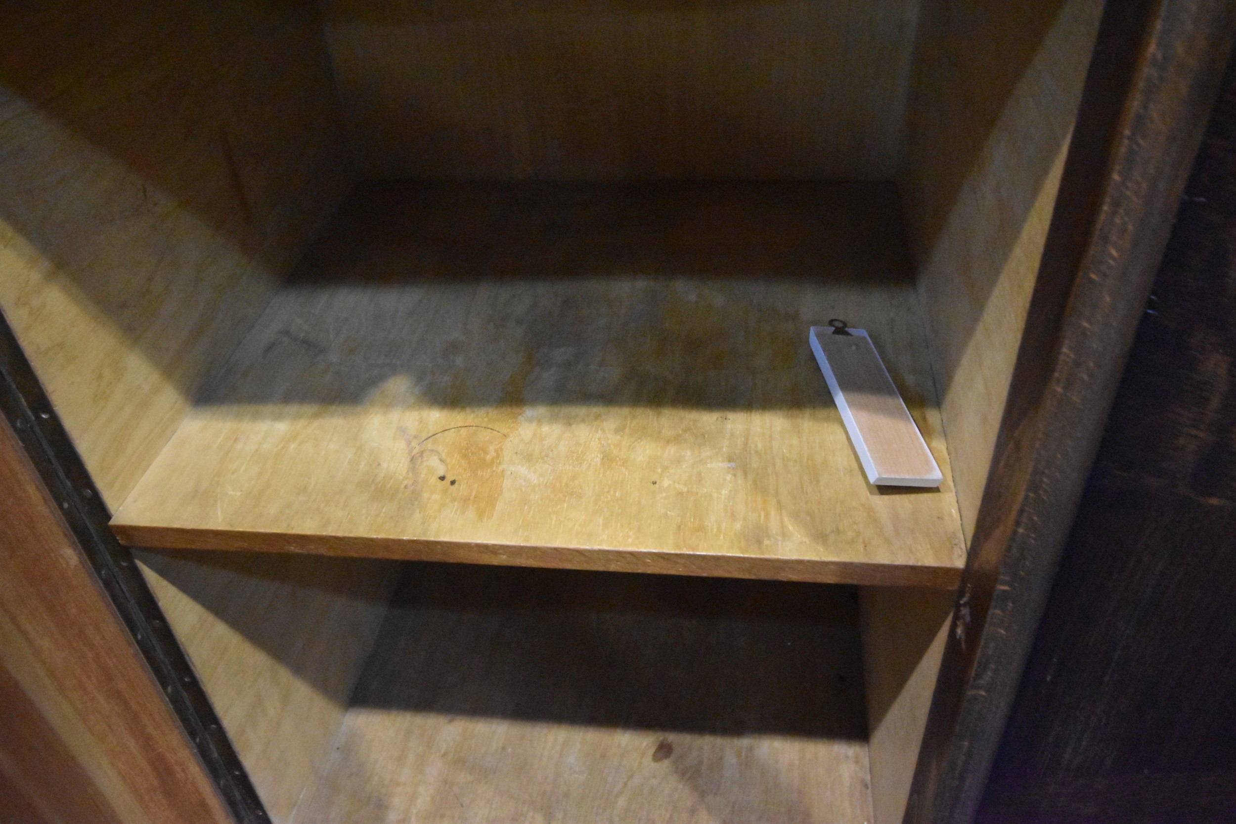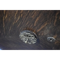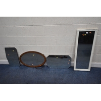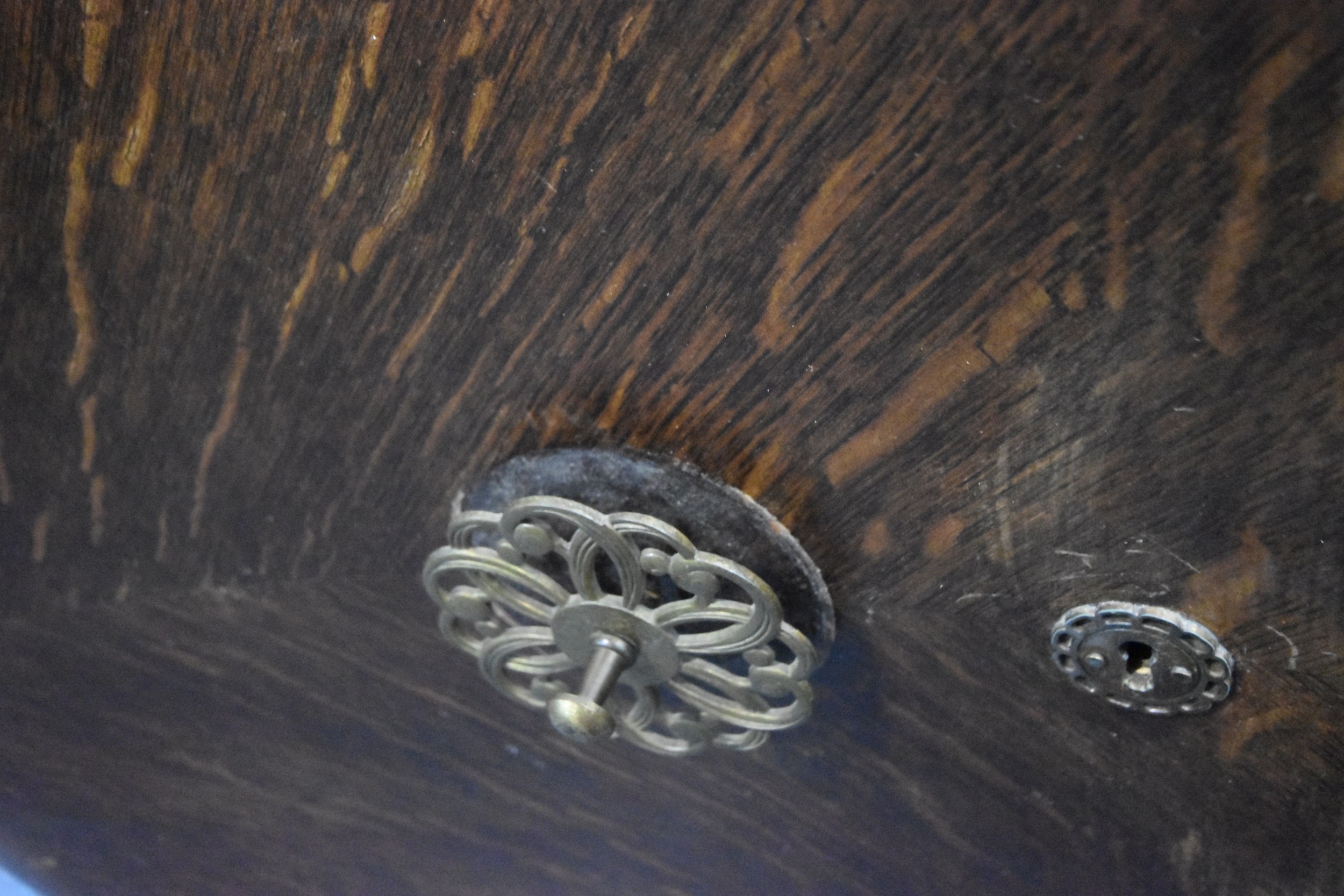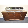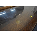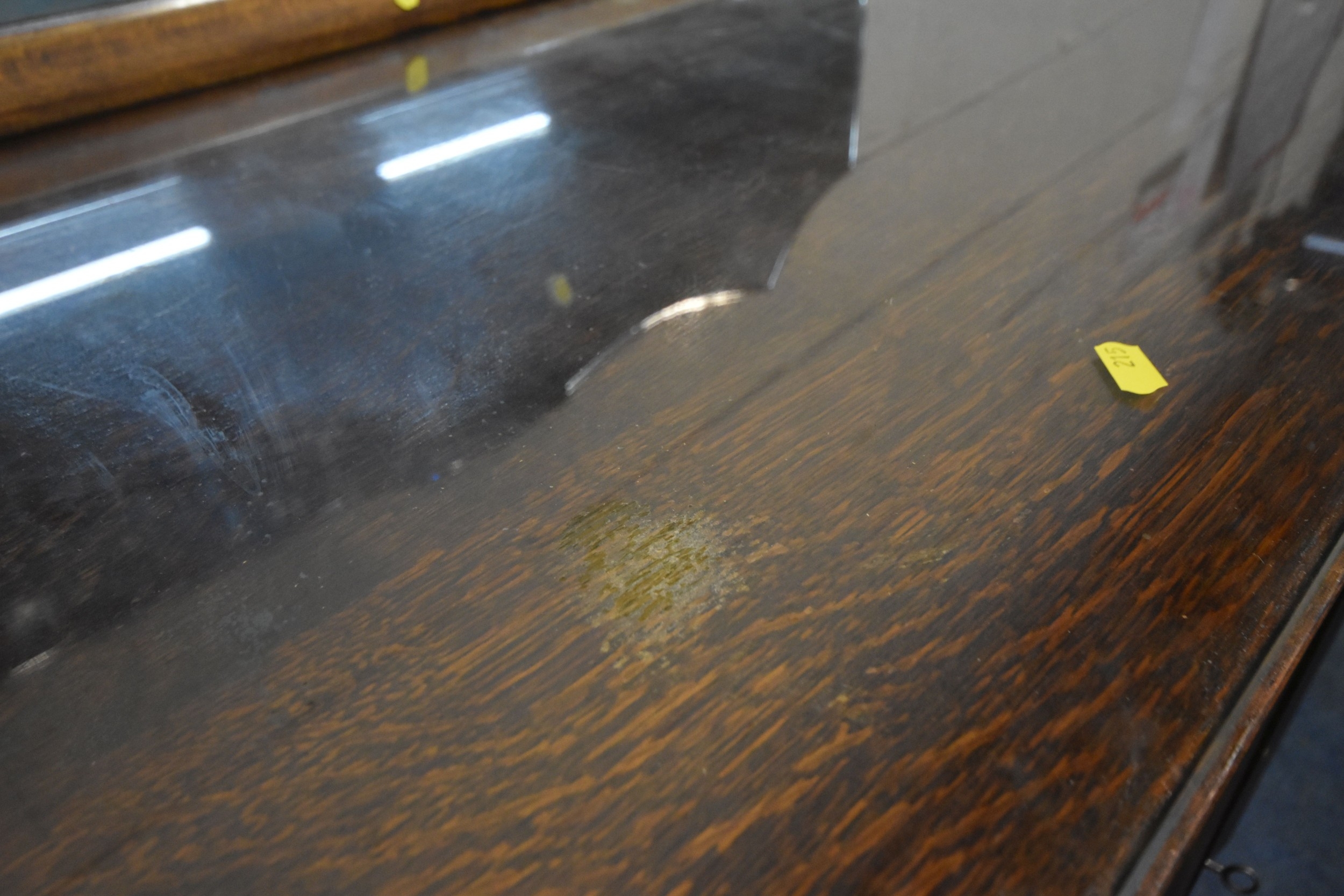 AN EARLY 20TH CENTURY OAK SIDEBOARD, with a raised mirror back, and four cupboard doors, length 210cm x depth 57cm x height 129cm x height of base 98cm, condition report: two keys, glass protective surface present, historical marks, scuffs, stains, discolouration, one handle loose, other wear and usage