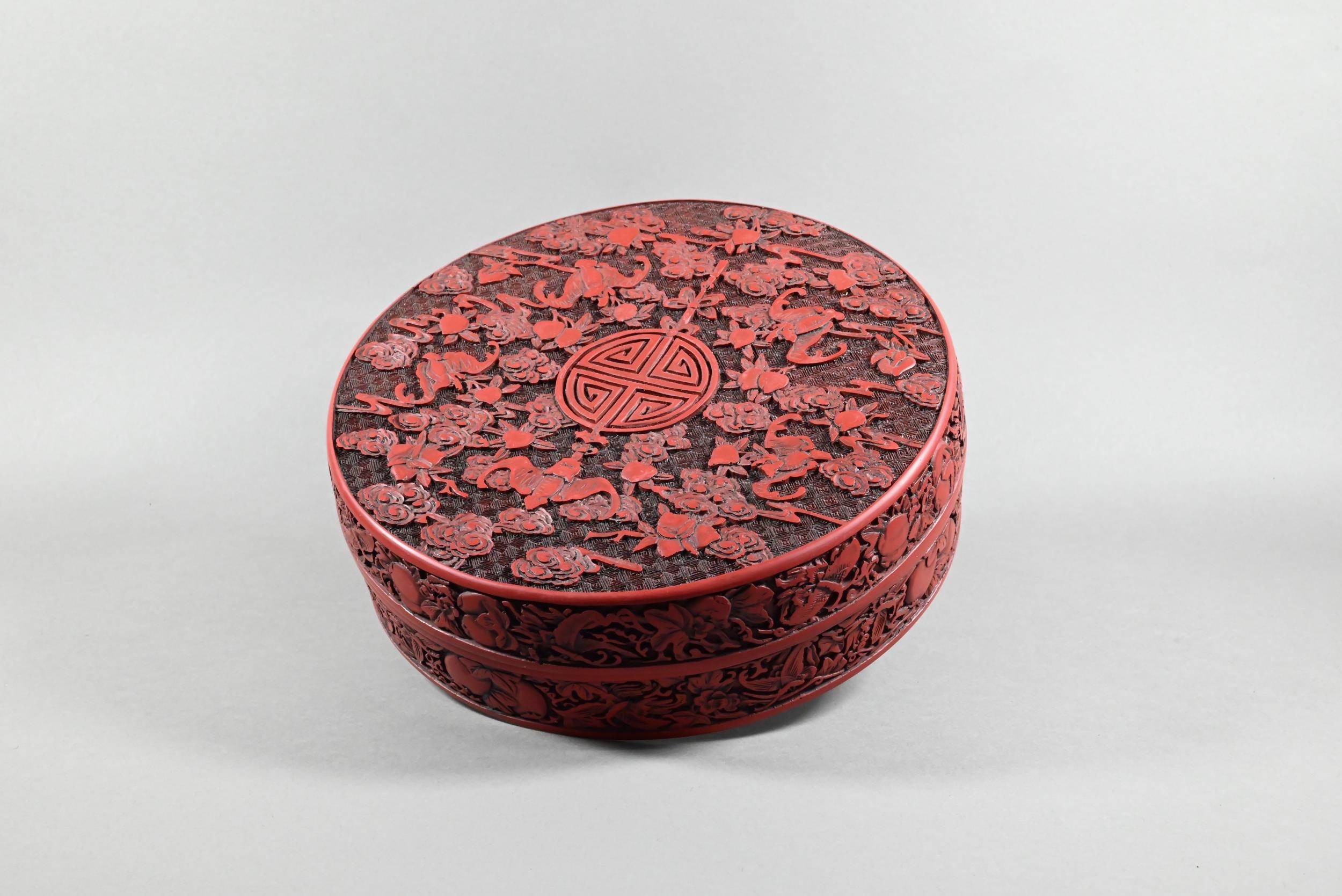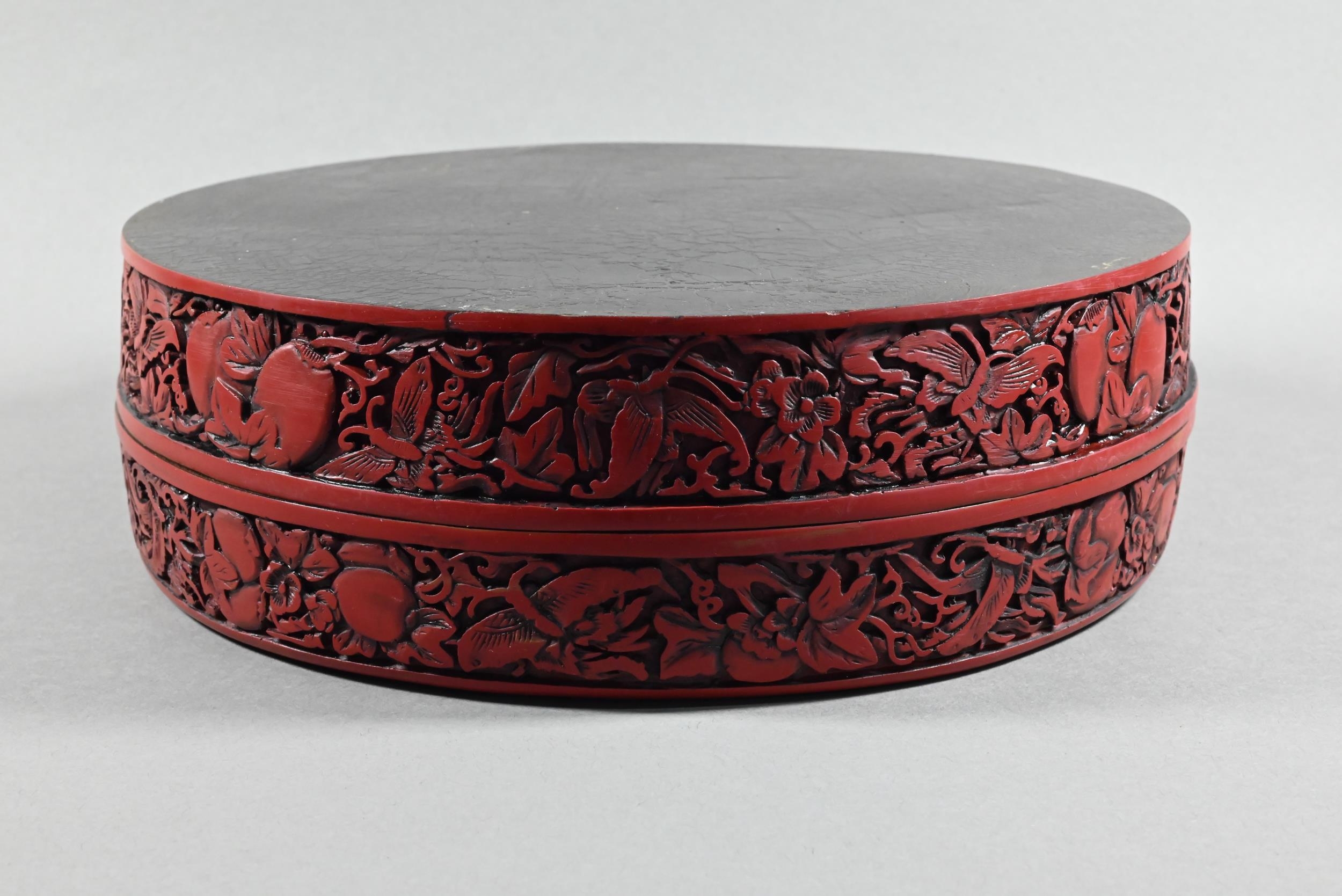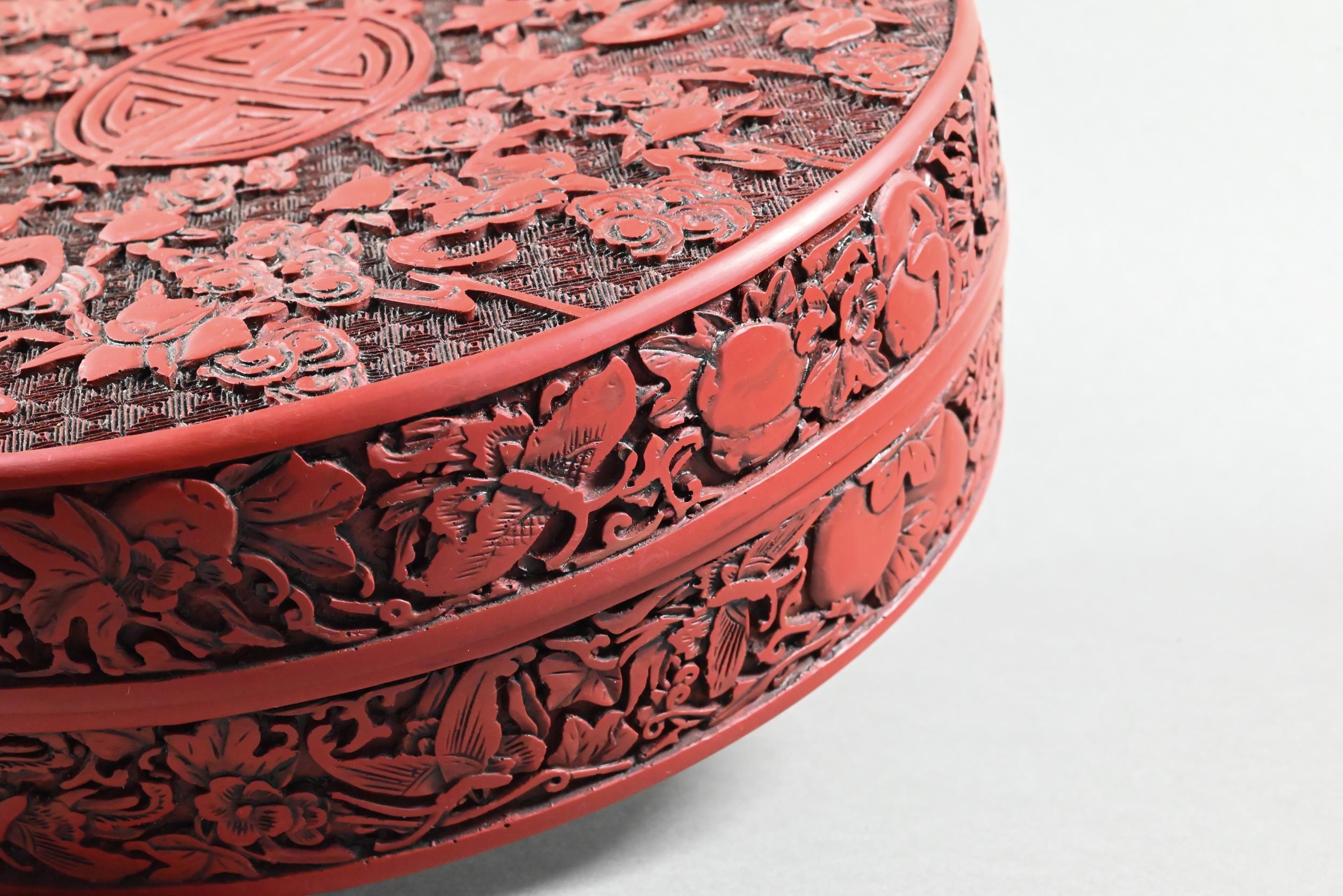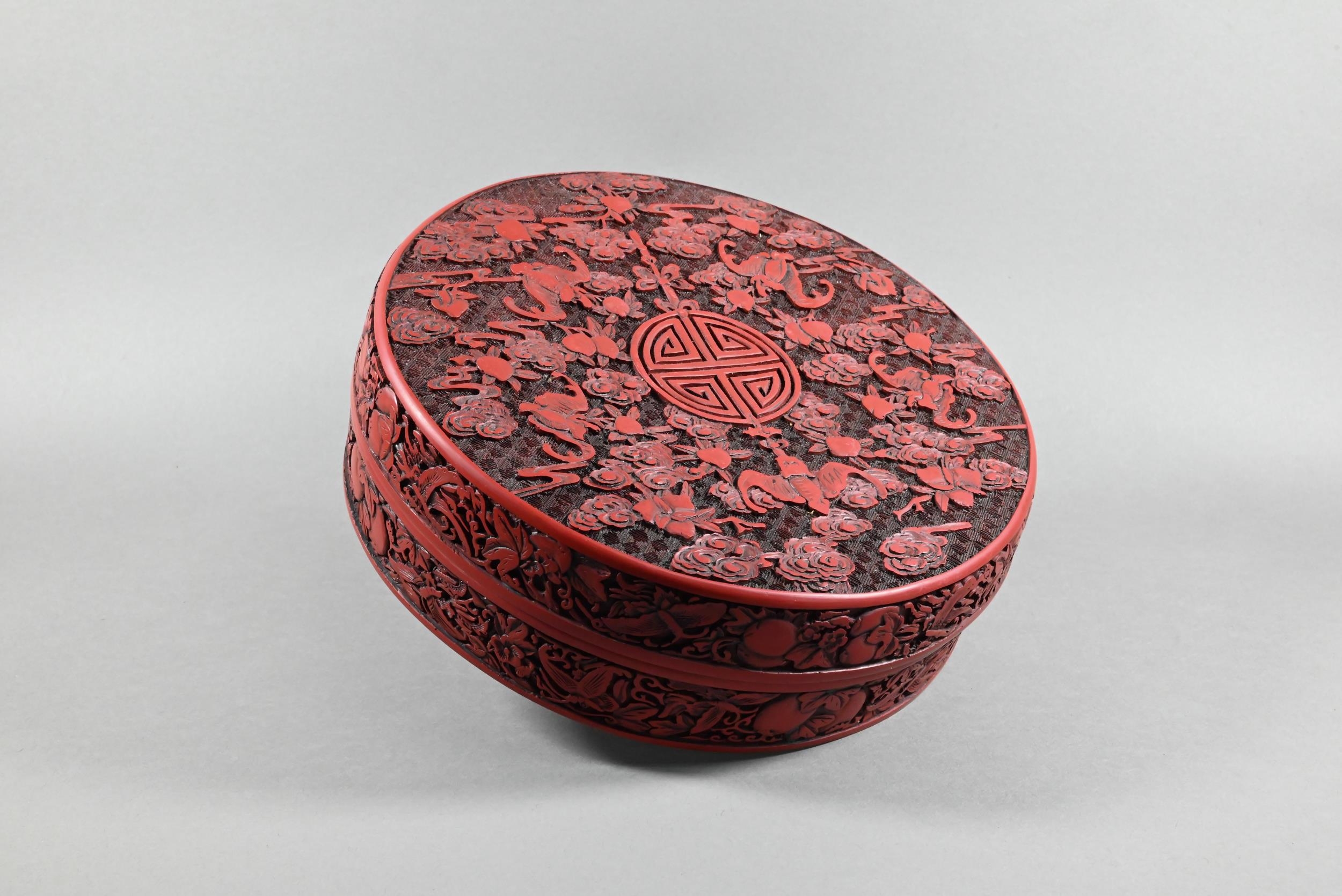 A large Chinese cinnabar lacquer circular box and cover, profusely carved with arrangements of bats, clouds and peach sprays around a large central shou symbol on geometric leiwen ground, the sides of the cover and base with peaches, flowers and butterflies, the base and interior in a plain black lacquered finish, 25 cm diameter