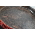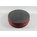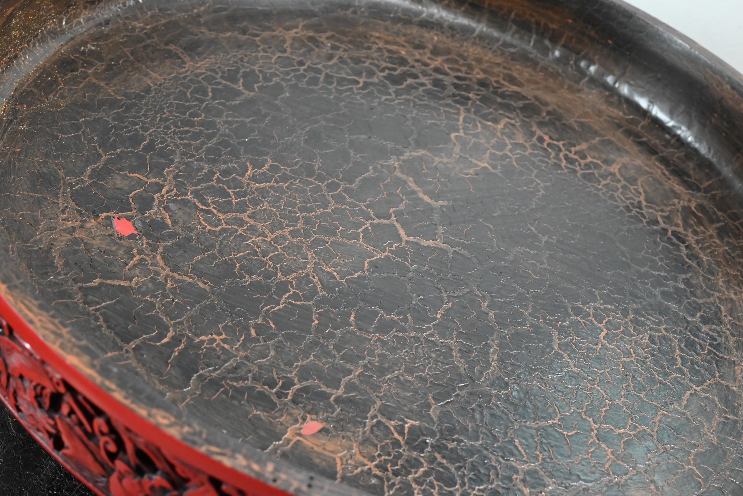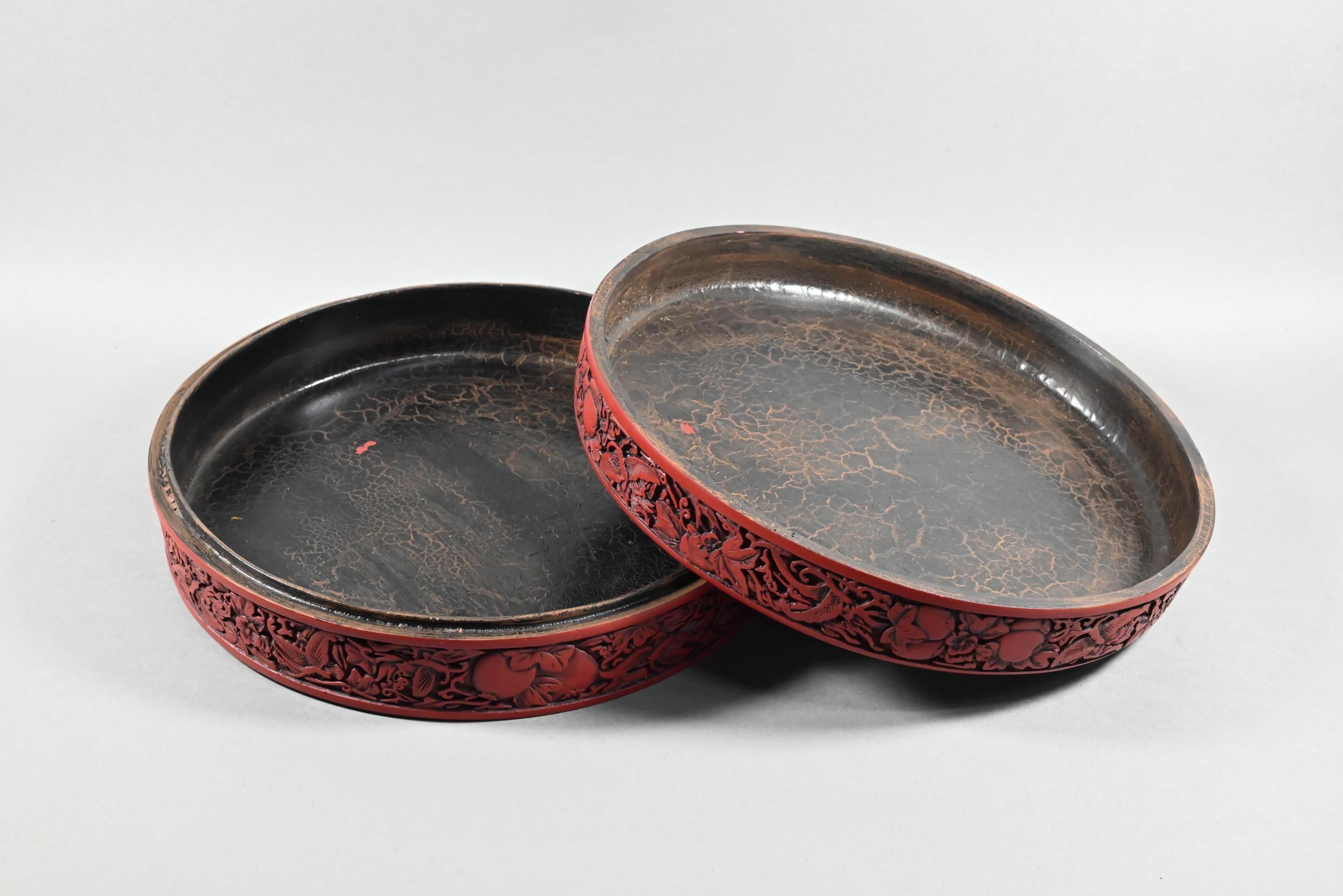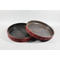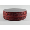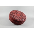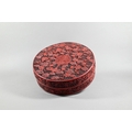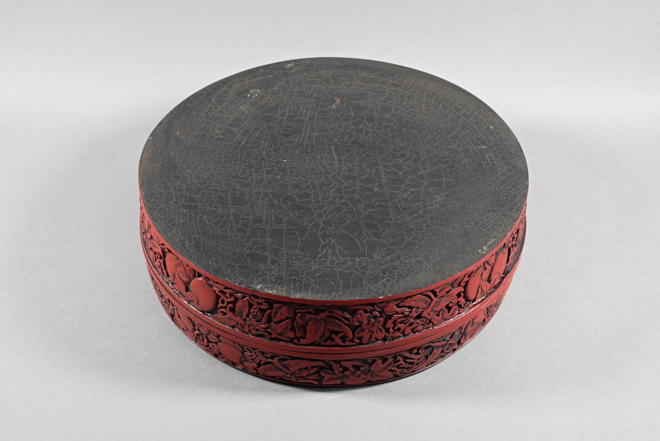 A large Chinese cinnabar lacquer circular box and cover, profusely carved with arrangements of bats, clouds and peach sprays around a large central shou symbol on geometric leiwen ground, the sides of the cover and base with peaches, flowers and butterflies, the base and interior in a plain black lacquered finish, 25 cm diameter