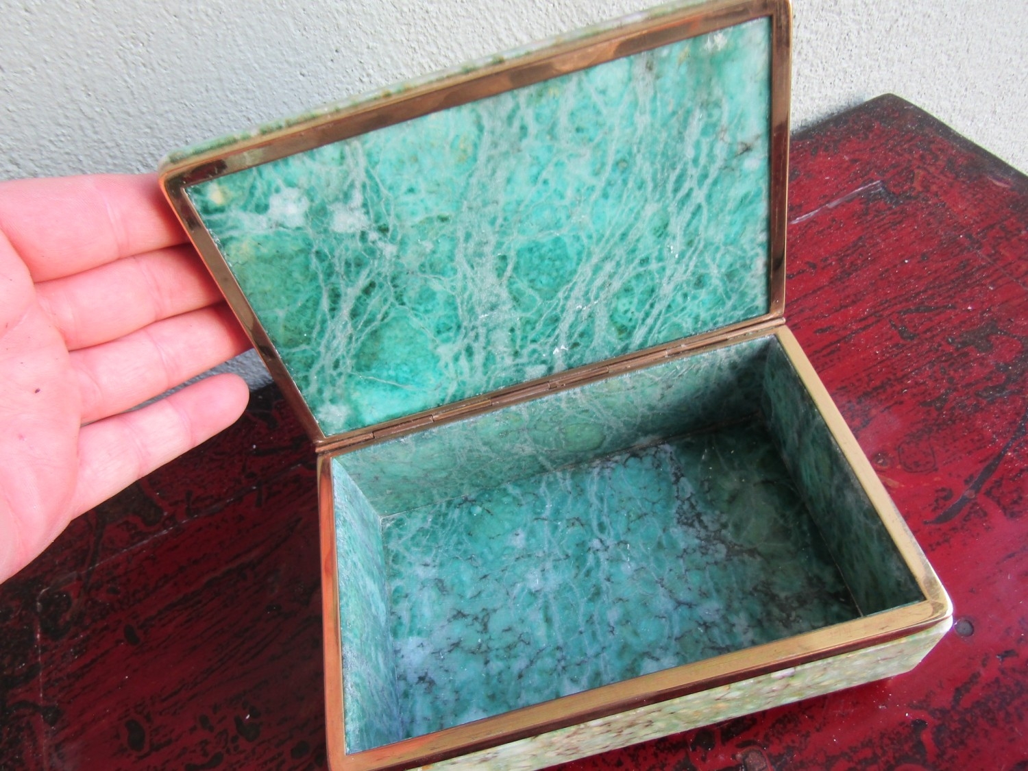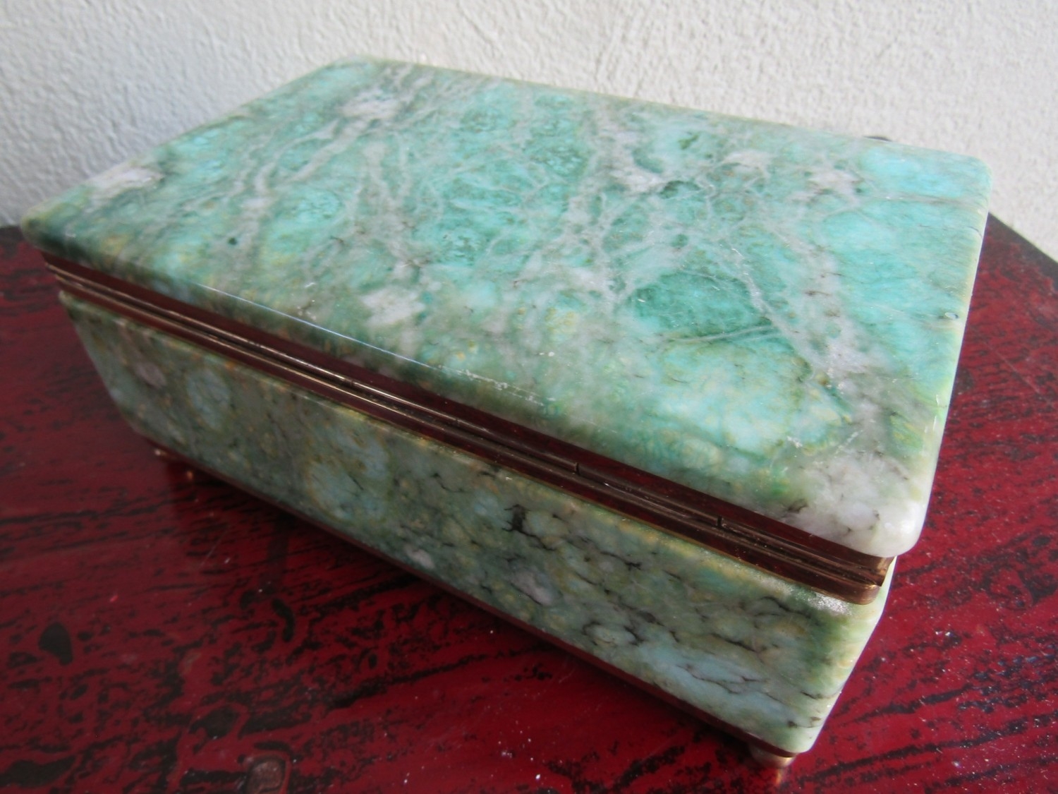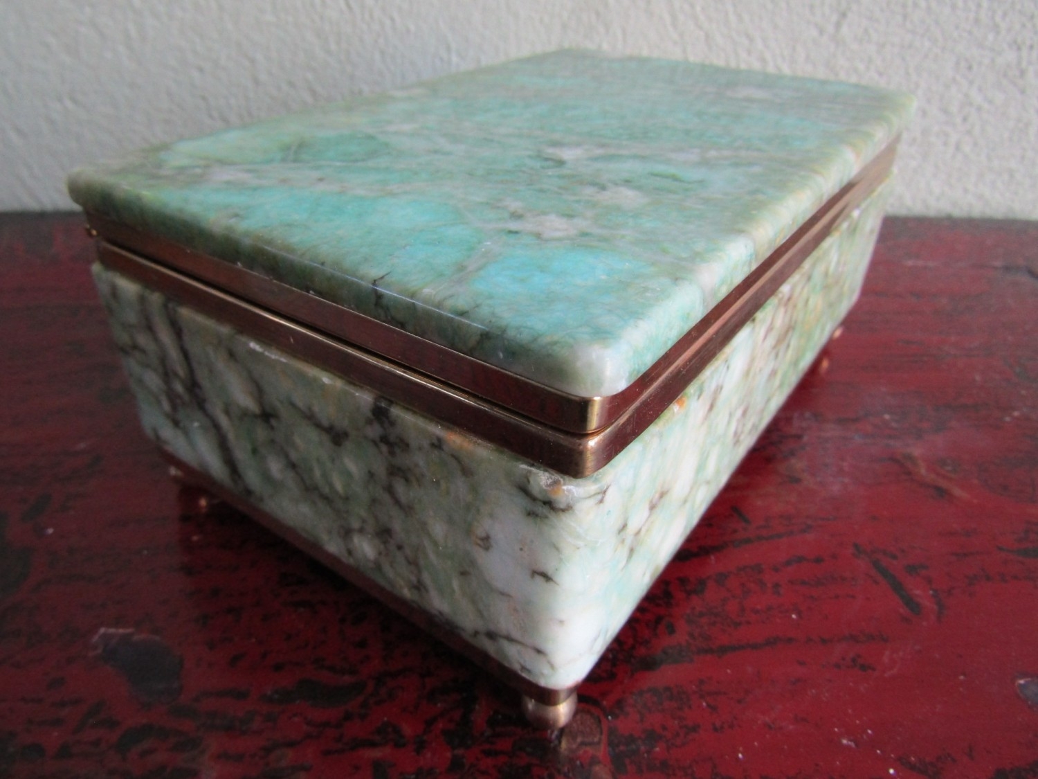 Vintage Agate Brass Bound Ladies Jewellery Box Rectangular Form Hinged Cover Approximately 10 Inches Wide x 5 Inches Deep