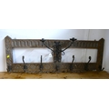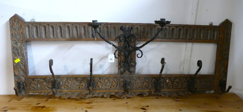 Heavily carved oak coat rack with candle sconce light fittings