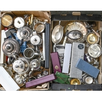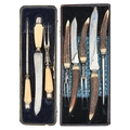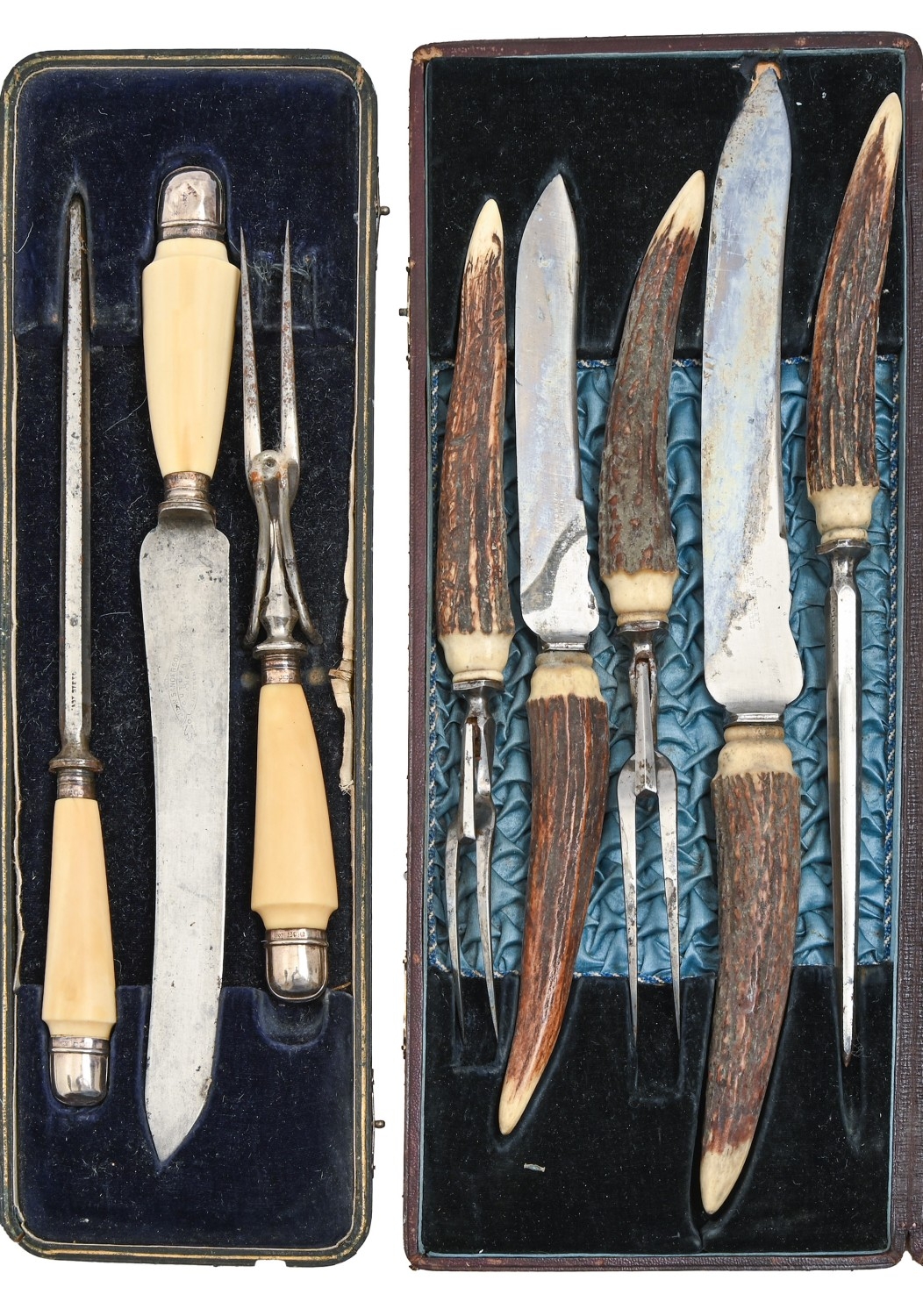 A silver mounted three-piece carving set, with ivorine handles, Sheffield 1918, cased and a contemporary antler-handled example, cased