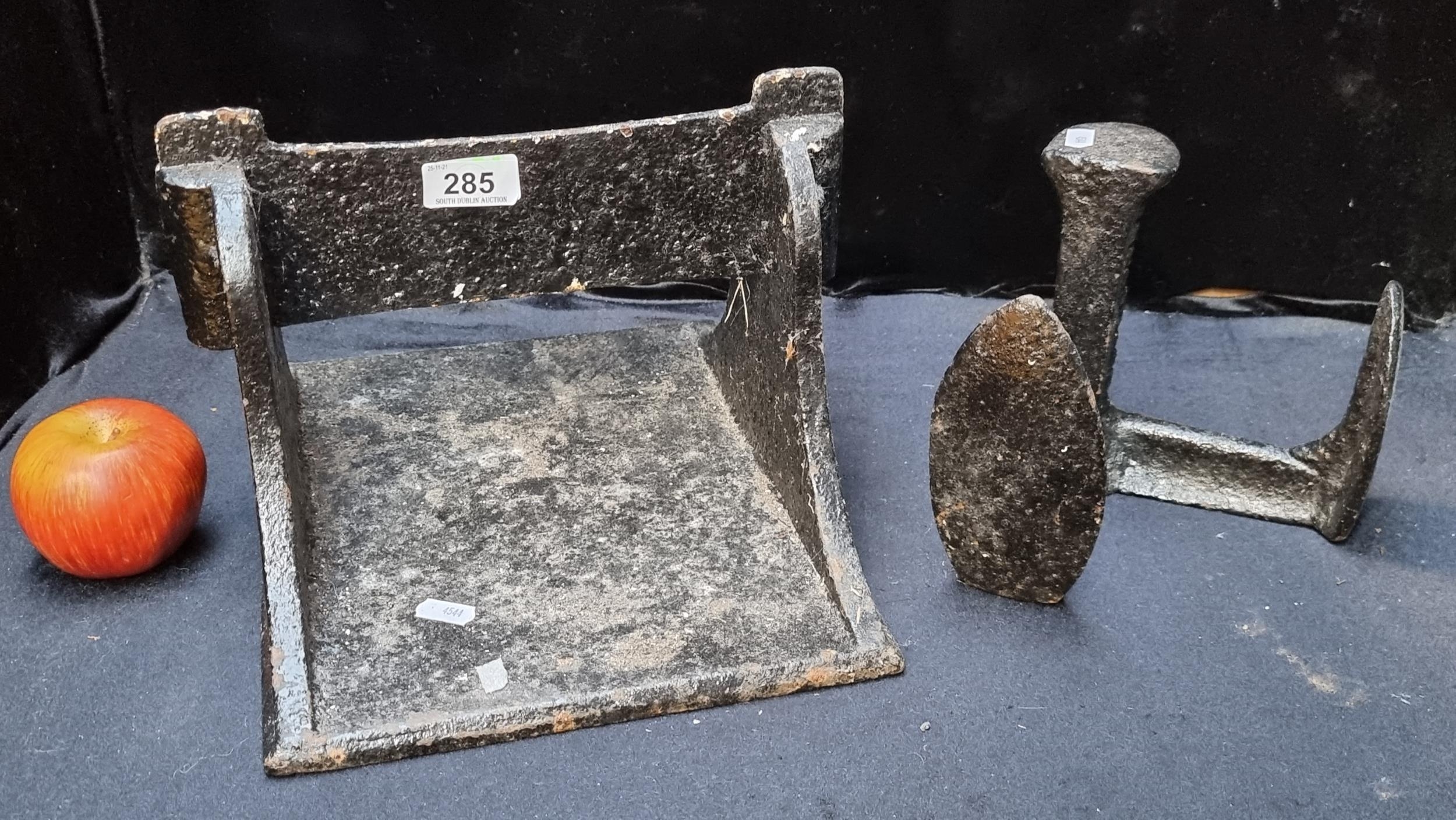 Two antique items including a very heavy cast iron Victorian boot scrape and shoe last