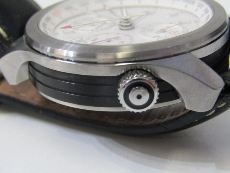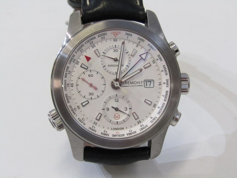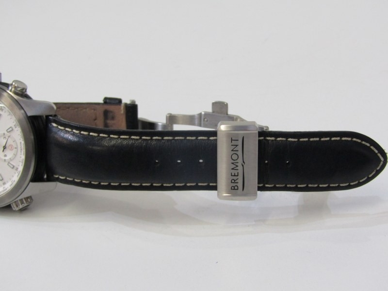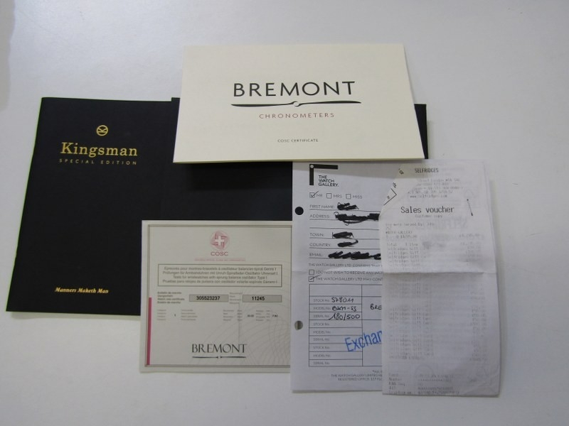 BREMONT CHRONOMETER, a Bremont 'Kingsman' white dialled chronograph wristwatch, limited edition of 500, no. 180 of 500, purchased 5th September 2016, with warranty registration card, leather carry case with pen, with black or brown leather straps, boxed and other relevant items