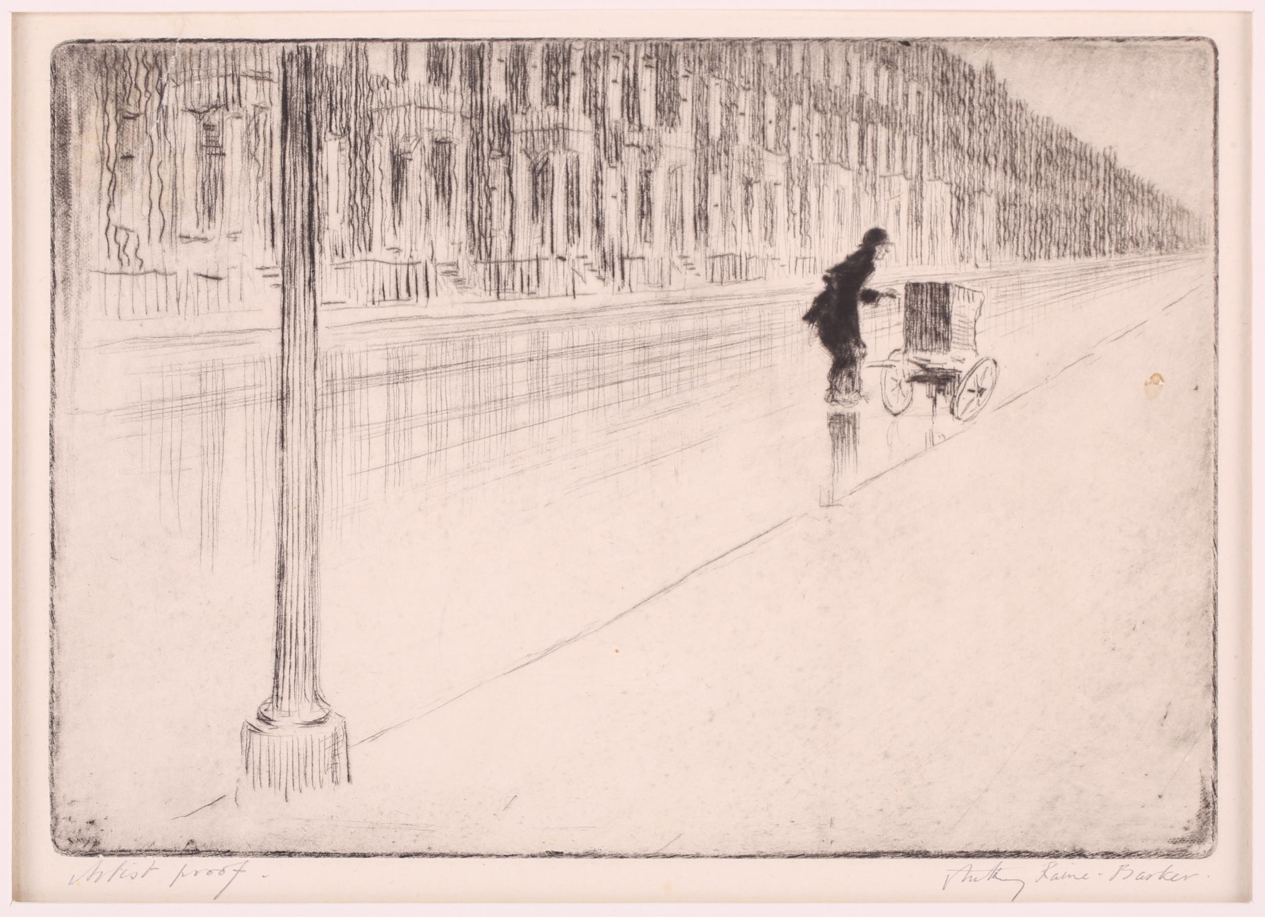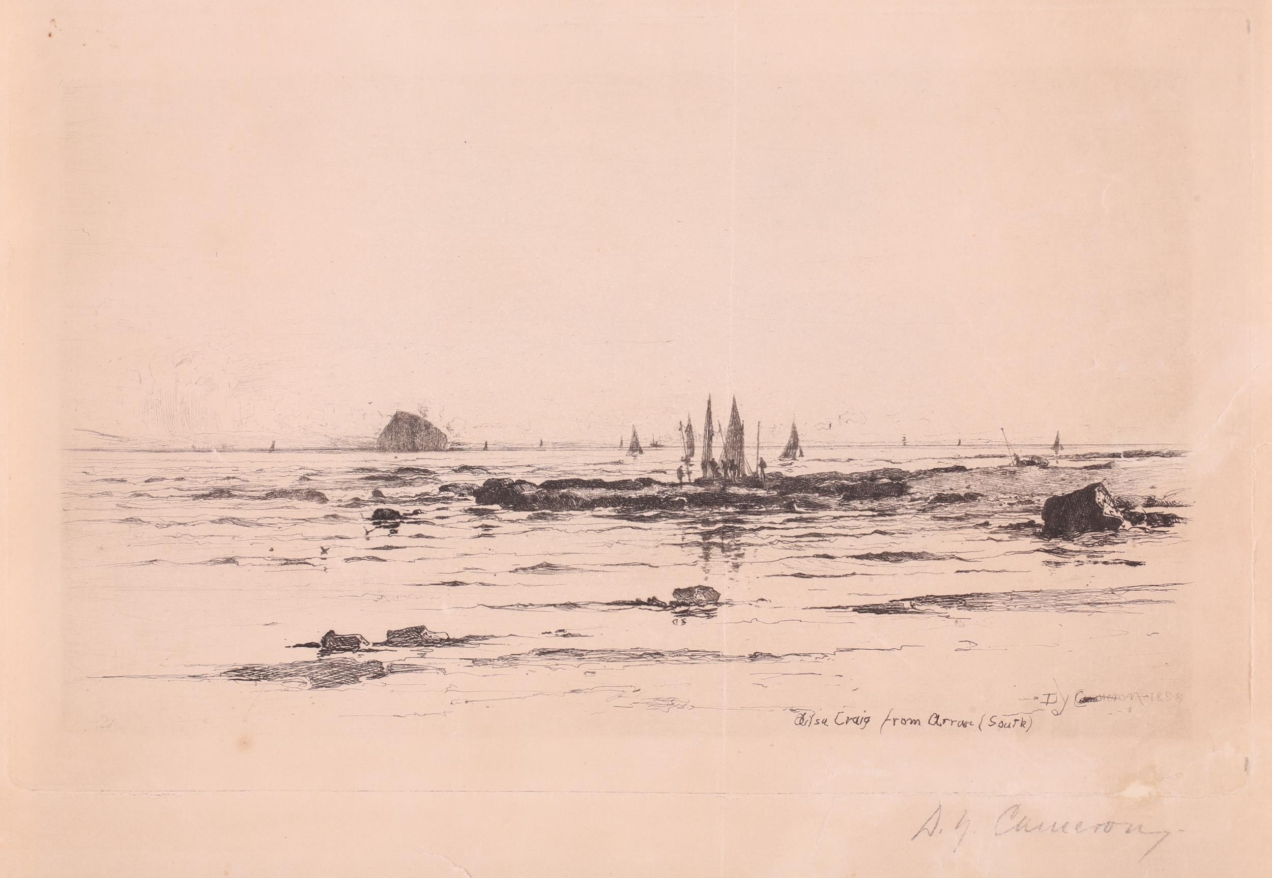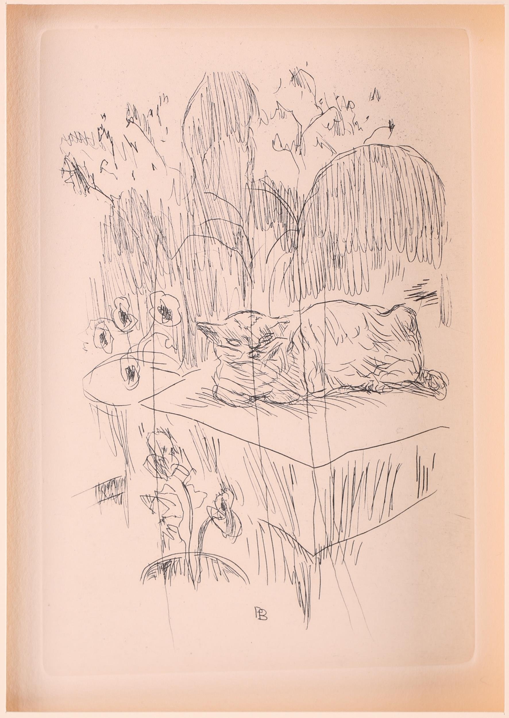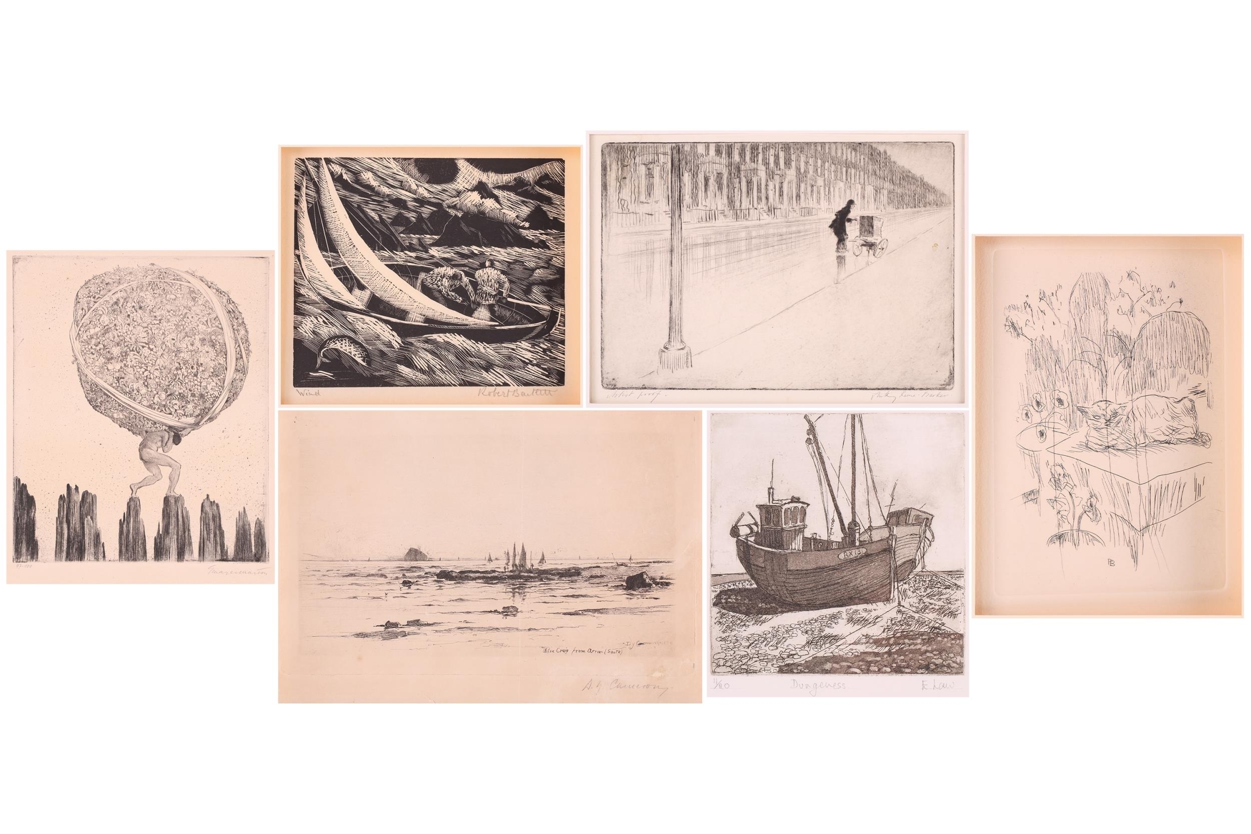 A collection of etchings and engravings comprising - Anthony Raine – Barker (1880 - 1963) The Barrel Organ, original drypoint, artists proof, signed in pencil in the margins, 13.2cm x19cm; Robert Bartlett (20th century) Wind, wood engraving, 1930, signed & titled in pencil in the margins, image 13cm x 15.5cm; E Law (20th century) Dungeness, soft round etching, numbered 11/20, signed & titled in pencil in the margins, image 12cm x 12cm; David Young Cameron (1865 – 1945) Ailsa Craig from Arran (South), signed and titled within the plate, 1888, signed in pencil in the margins, plate 15cm x 24cm: An untitled etching of Atlas with a globe of flowers, indistinctly signed in pencil and numbered 97/100, plate 24.5cm x 20.5cm and Pierre Bonnard (1867 – 1947) Cat (Bouvier III), etching and illustration to La Vie de Sainte Monique, c1930, initialed within the plate, a later impression from the cancelled plate, 18cm x 12cm
