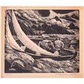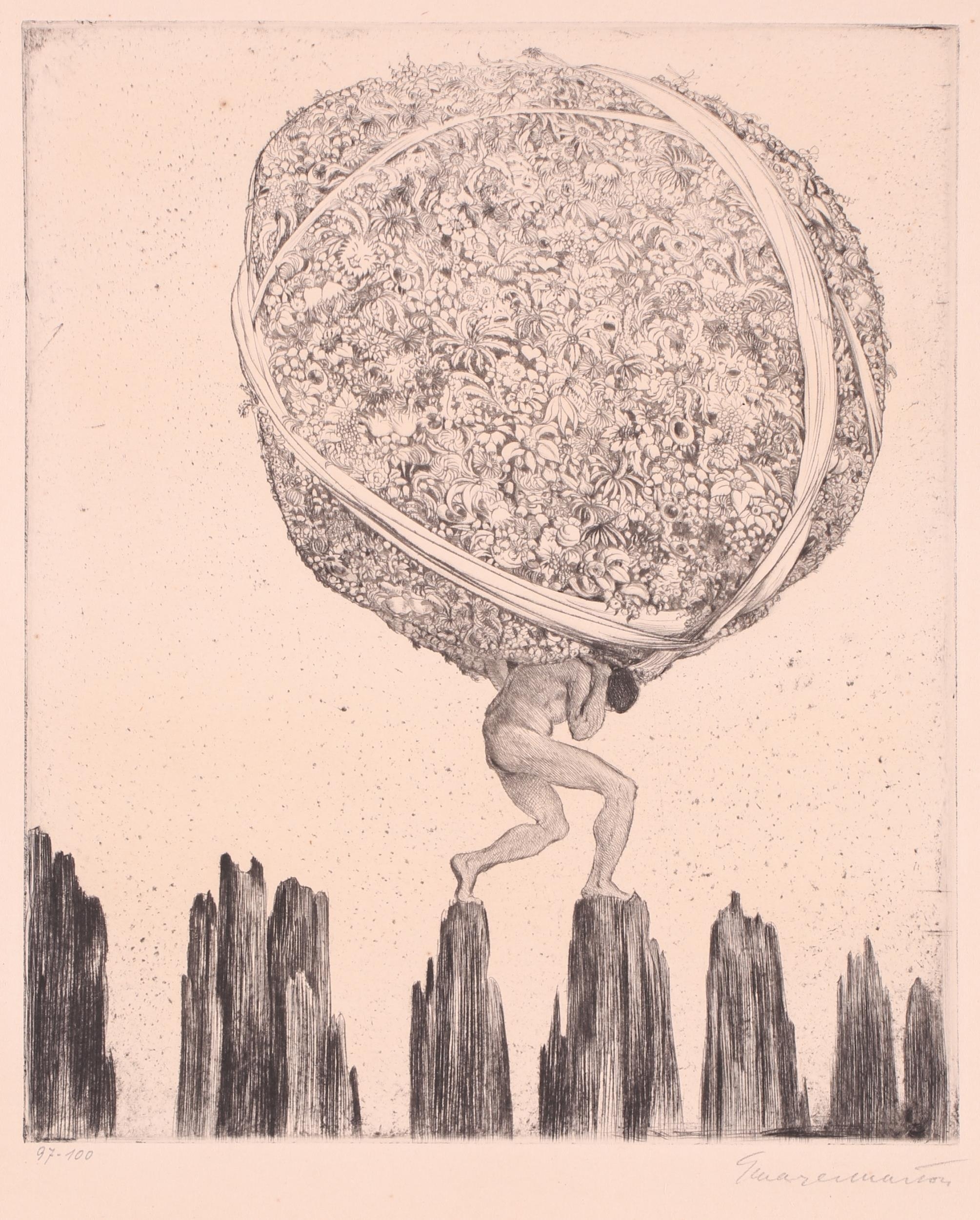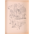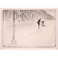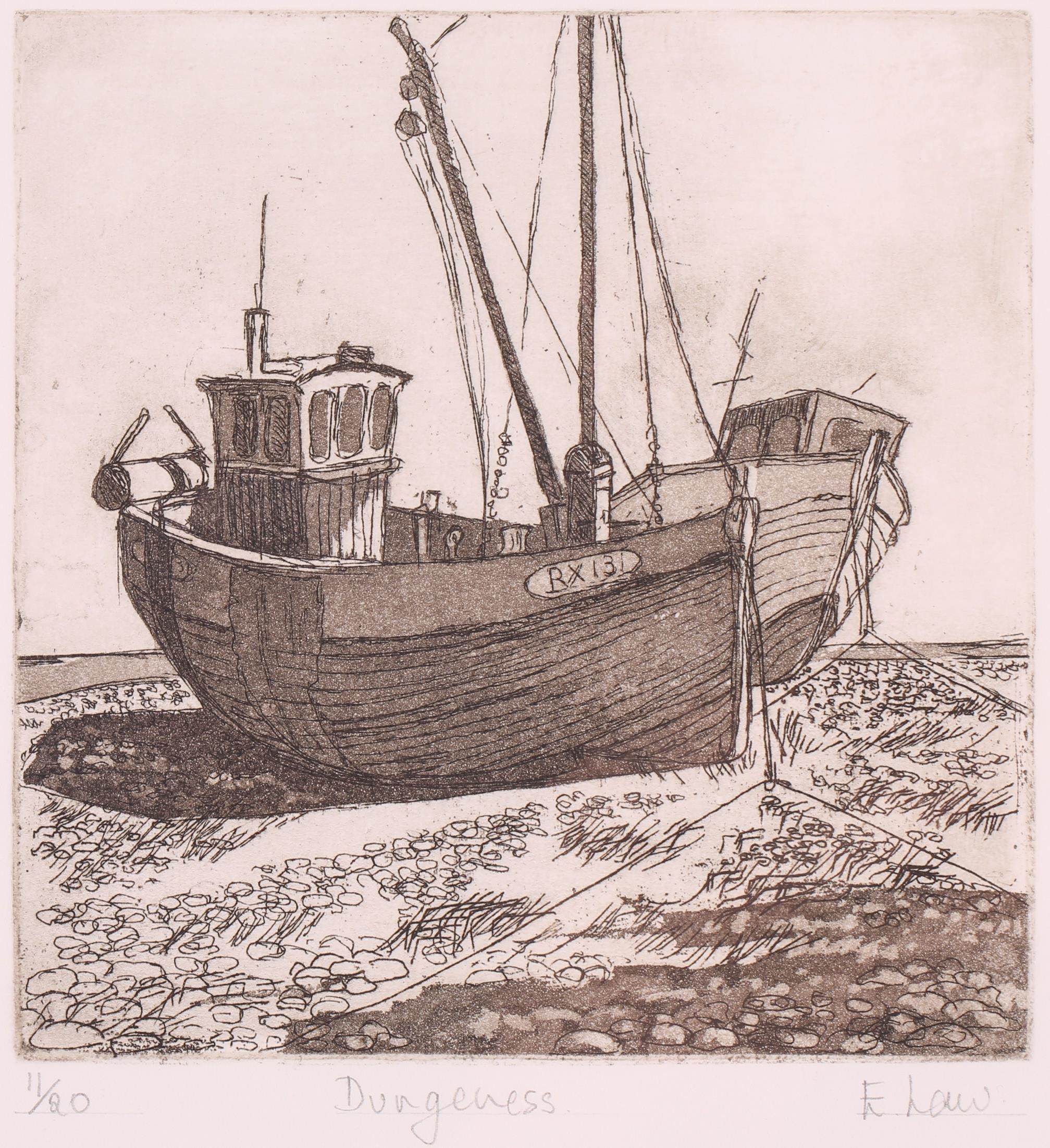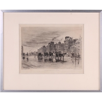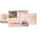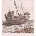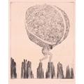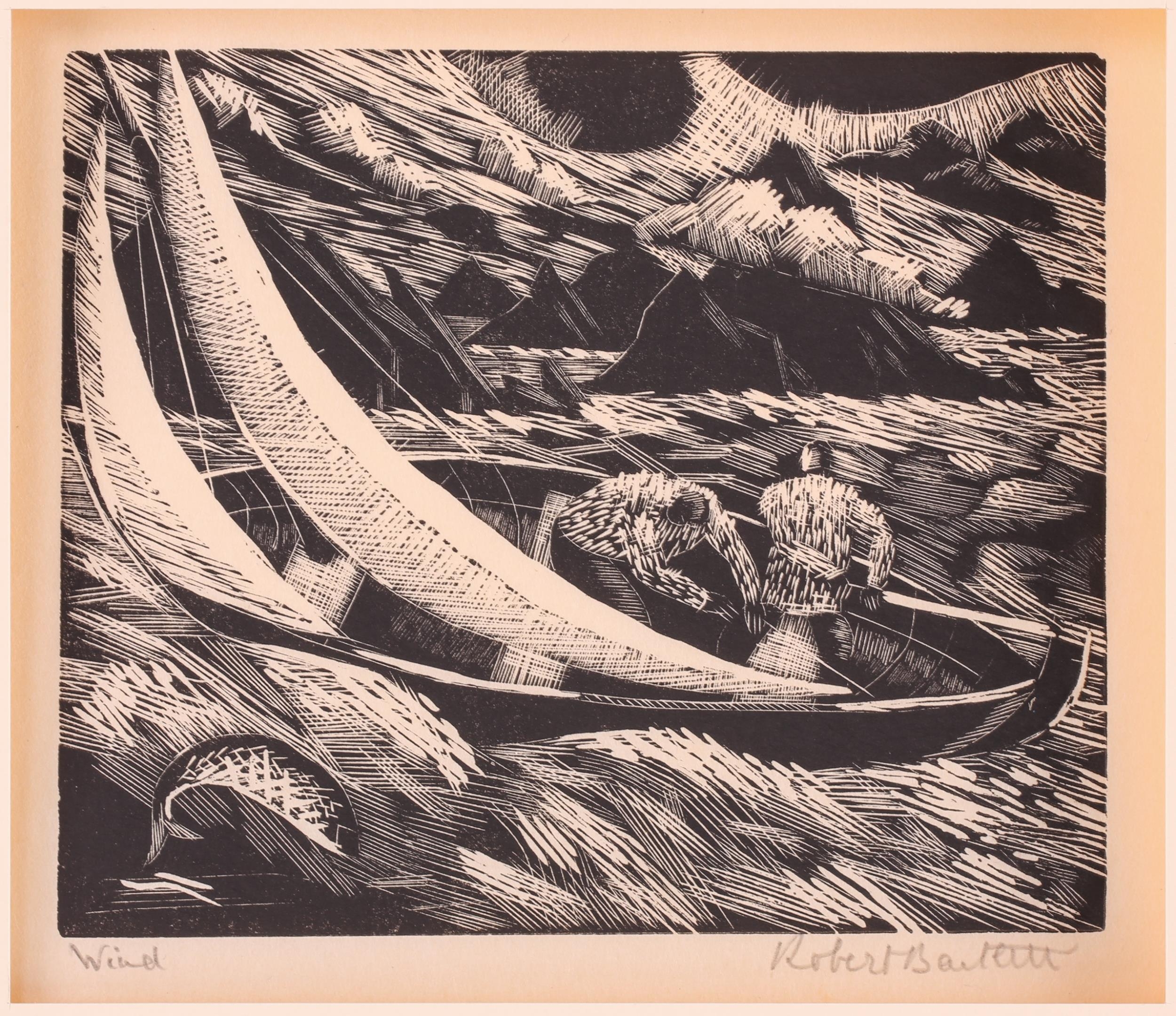 A collection of etchings and engravings comprising - Anthony Raine – Barker (1880 - 1963) The Barrel Organ, original drypoint, artists proof, signed in pencil in the margins, 13.2cm x19cm; Robert Bartlett (20th century) Wind, wood engraving, 1930, signed & titled in pencil in the margins, image 13cm x 15.5cm; E Law (20th century) Dungeness, soft round etching, numbered 11/20, signed & titled in pencil in the margins, image 12cm x 12cm; David Young Cameron (1865 – 1945) Ailsa Craig from Arran (South), signed and titled within the plate, 1888, signed in pencil in the margins, plate 15cm x 24cm: An untitled etching of Atlas with a globe of flowers, indistinctly signed in pencil and numbered 97/100, plate 24.5cm x 20.5cm and Pierre Bonnard (1867 – 1947) Cat (Bouvier III), etching and illustration to La Vie de Sainte Monique, c1930, initialed within the plate, a later impression from the cancelled plate, 18cm x 12cm