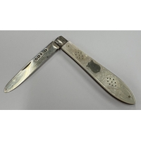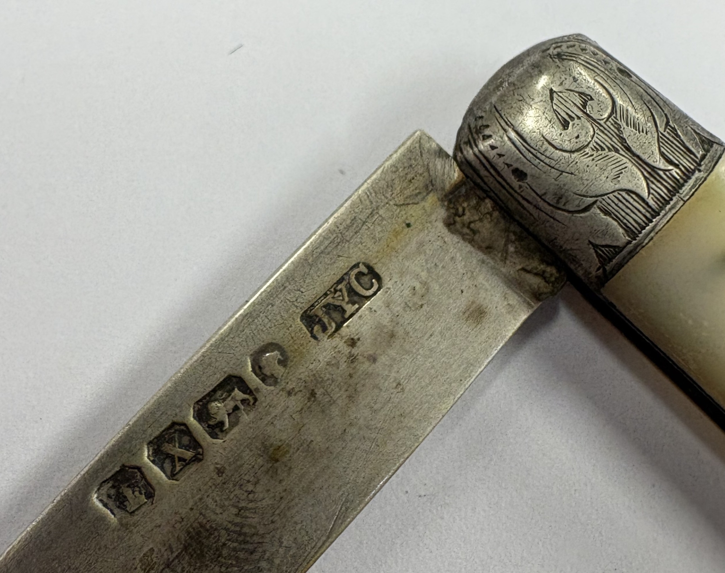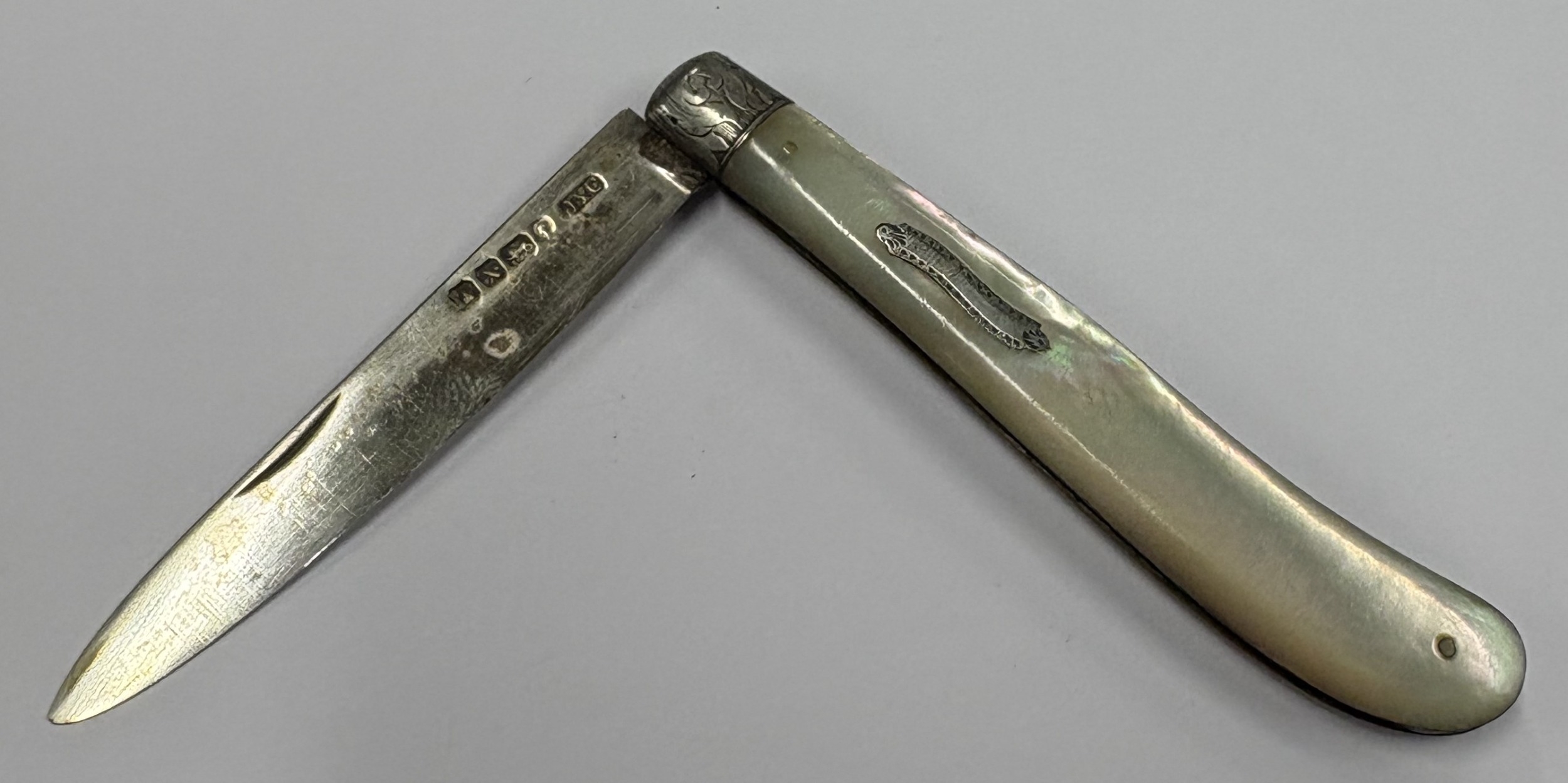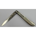 A Victorian silver and MOP travelling knife with vacant cartouche. Sheffield 1865. By John Yeomans Cowlishaw. Approx. 25 grams. Est. £30 - £50.