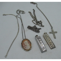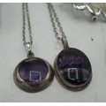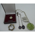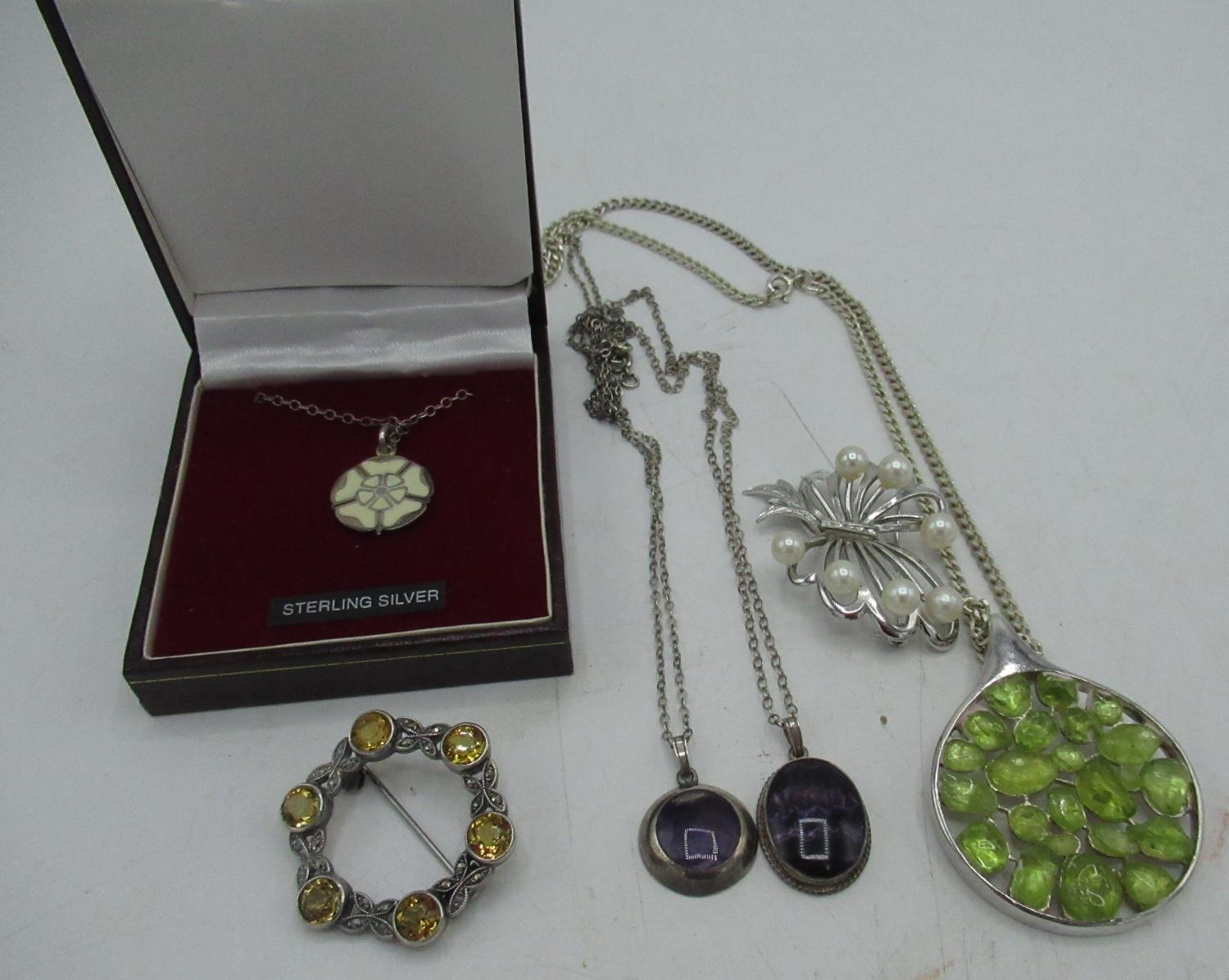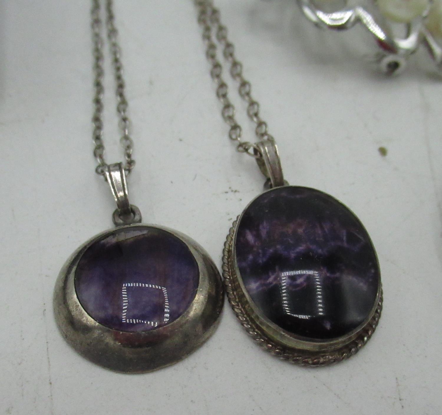 Blue John pendant in a silver mount stamped Sil, on a chain link necklace stamped 925, another similar, two silver brooches, and two silver necklaces