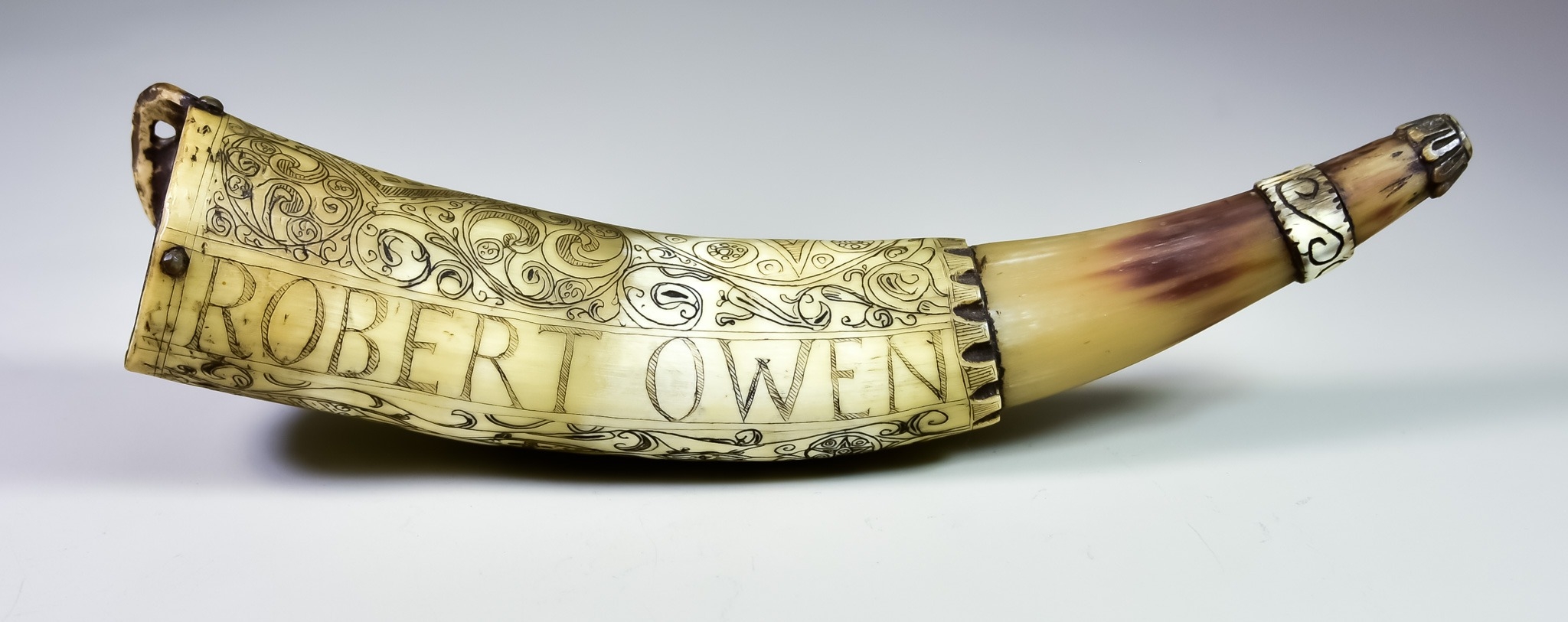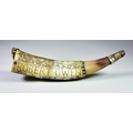 A 17th/ 18th Century Horn Powder Flask, engraved with stylised motifs and worded "Robert Owen, His Horn", 12ins long