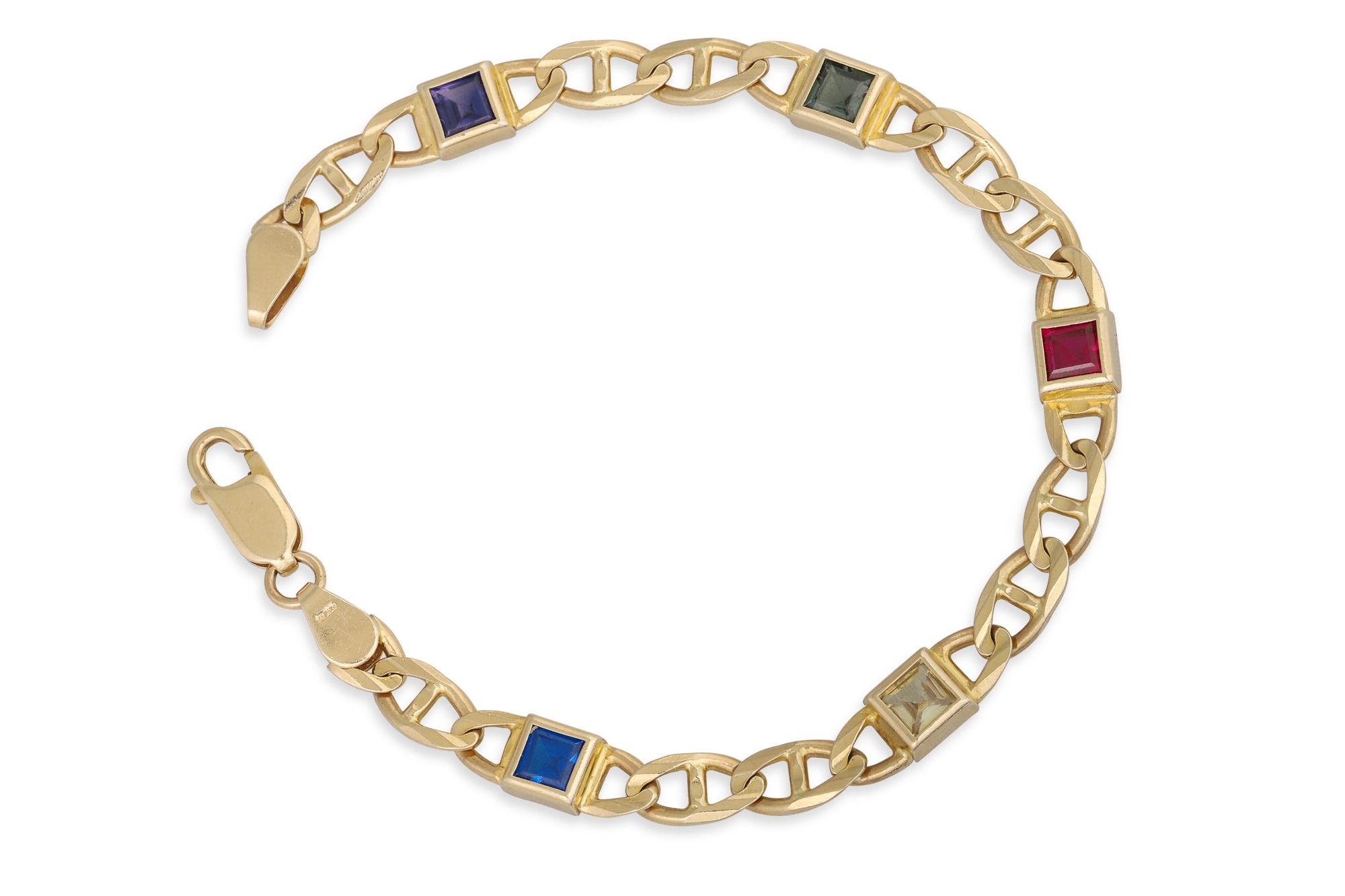 A 14CT GOLD GEM SET BRACELET, panel design, 7 1/2" long, 10.3 g