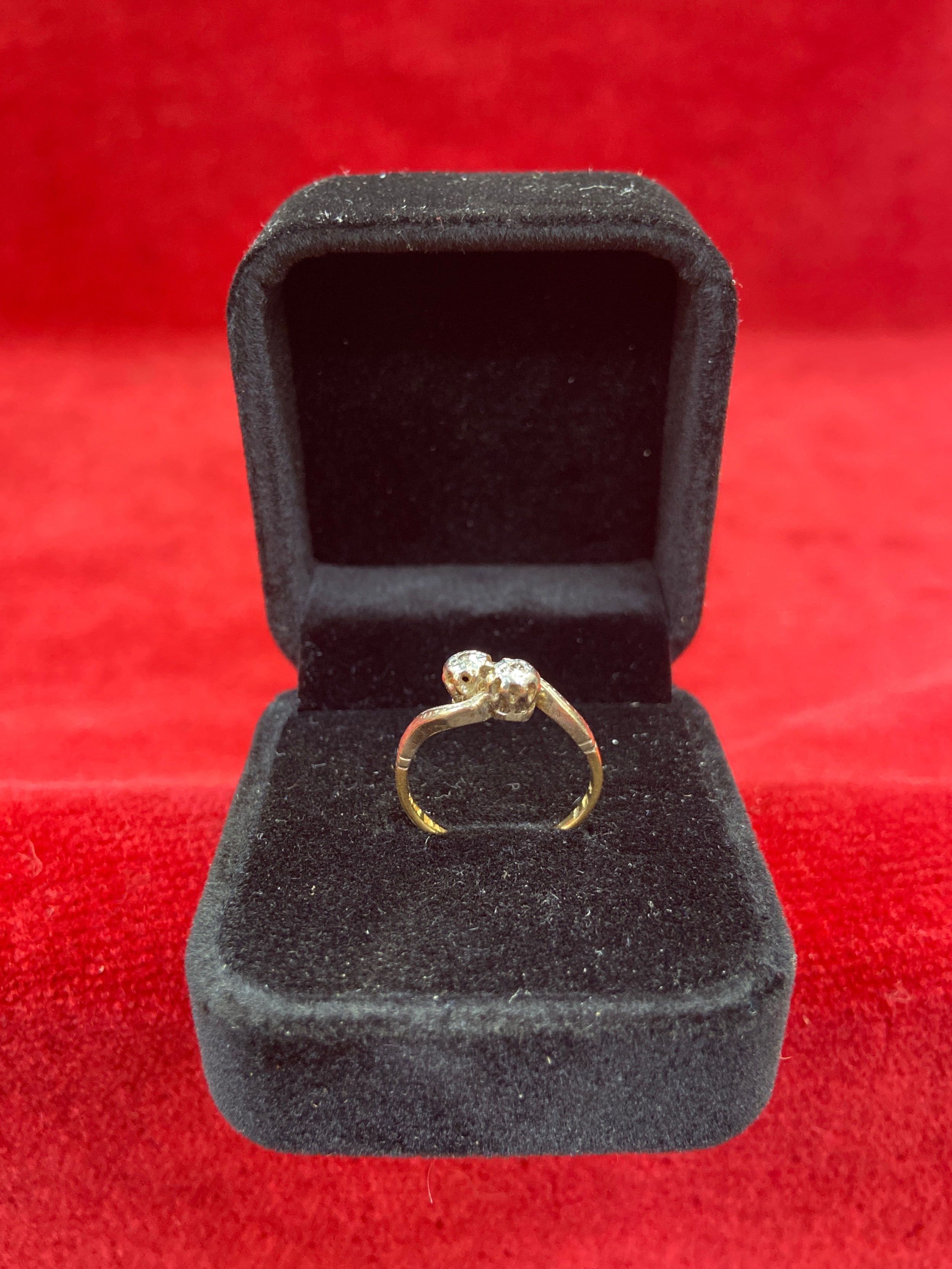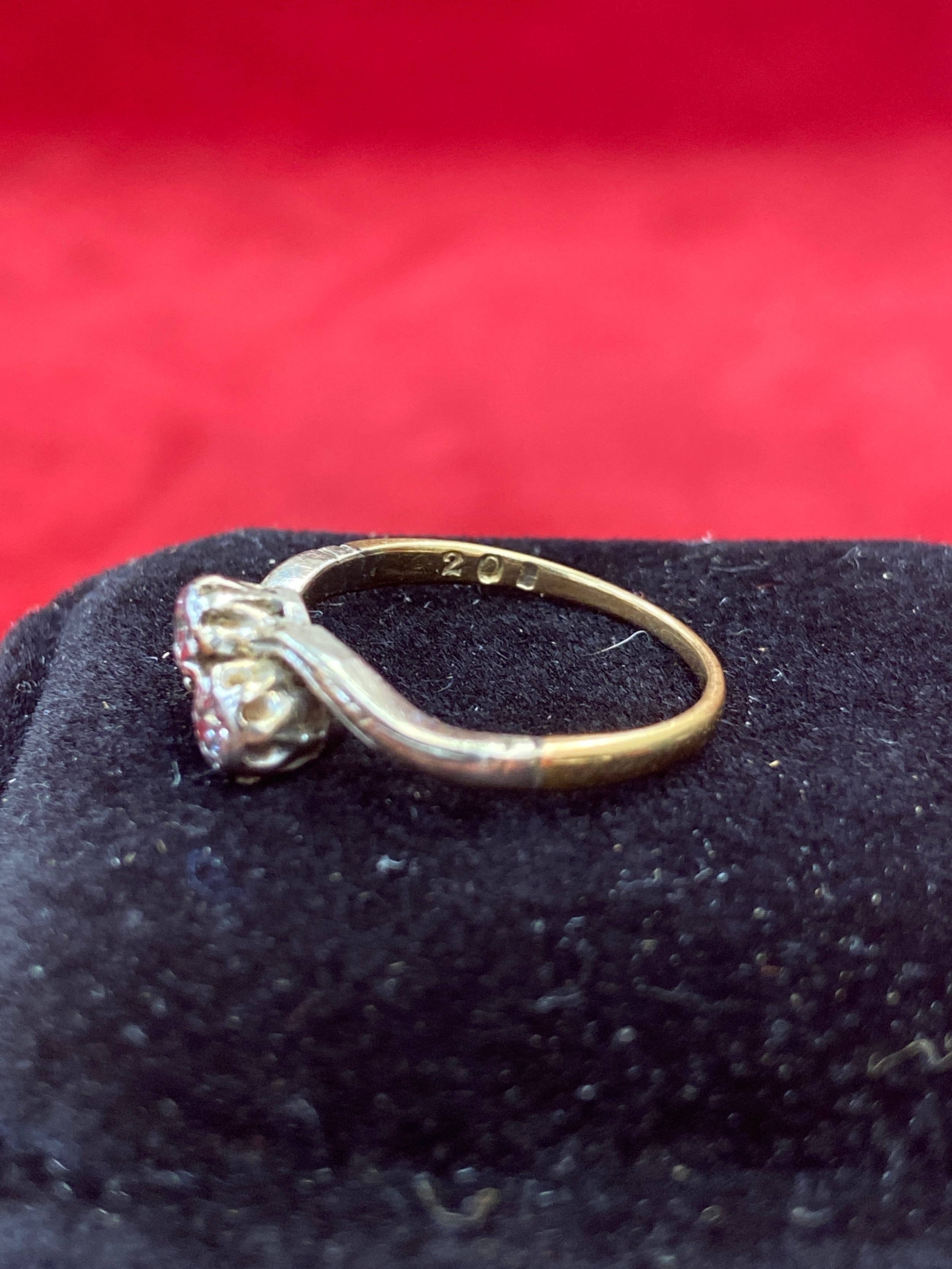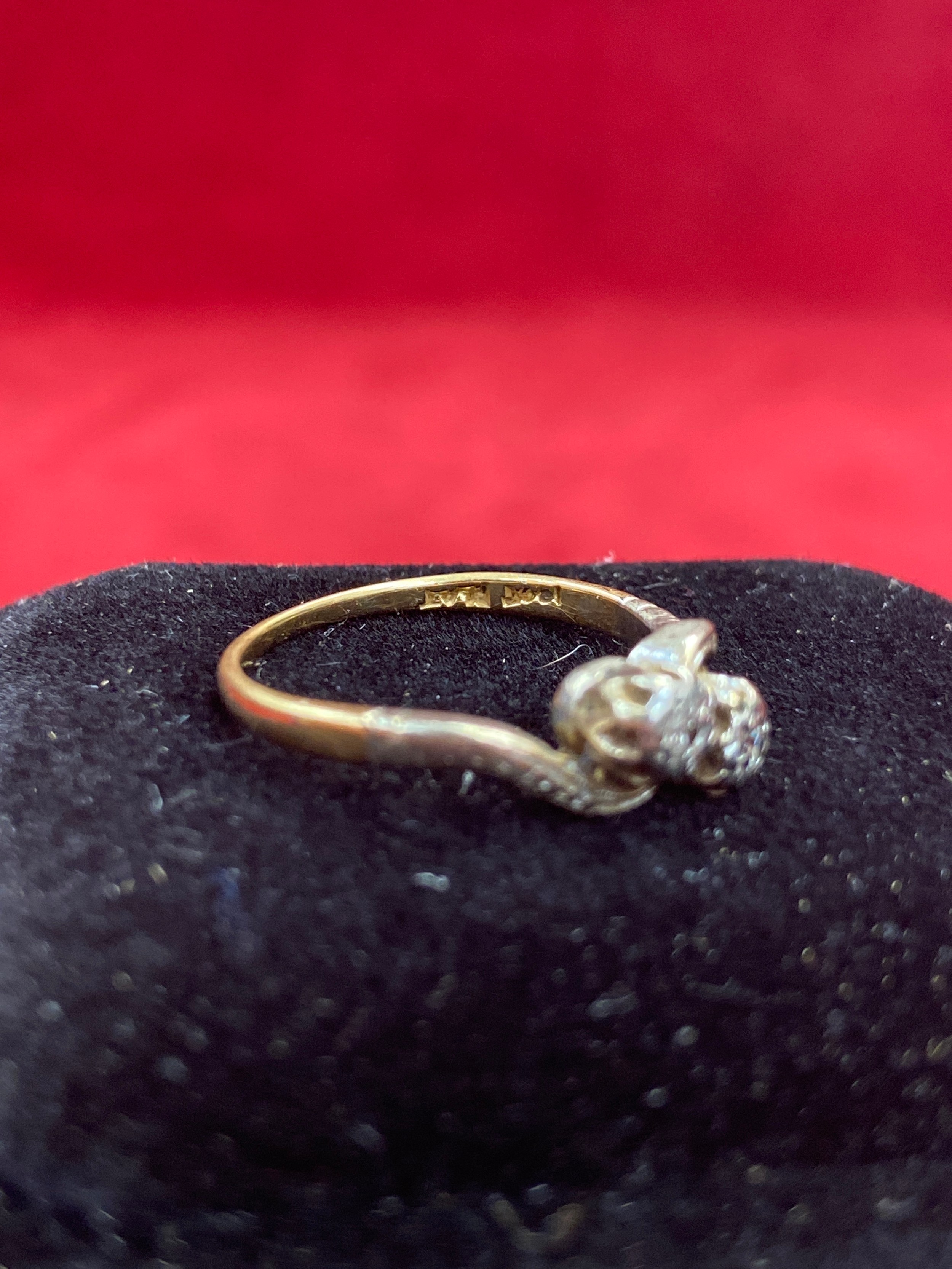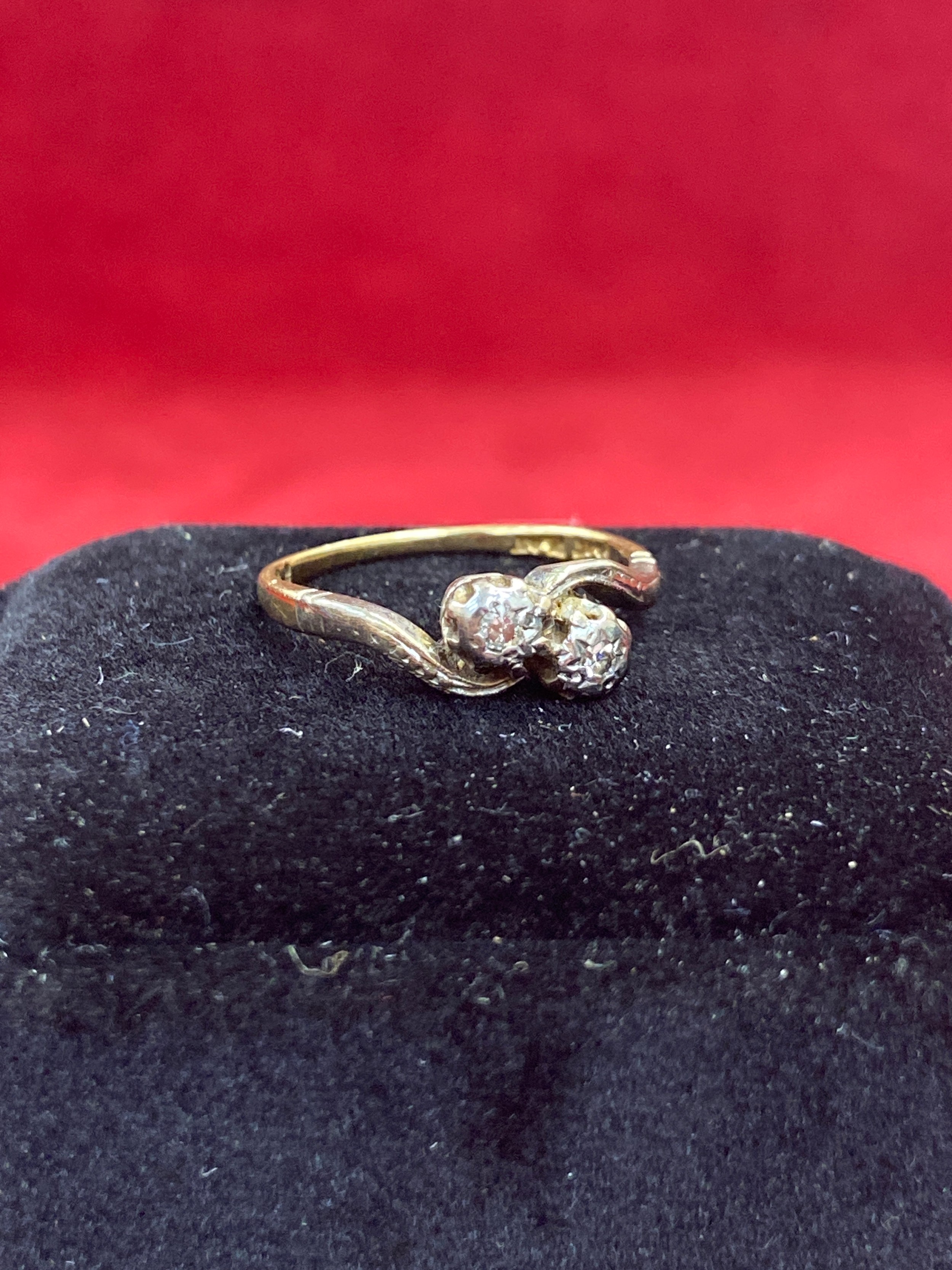 A Vintage 18ct gold ring in crossover design platinum setting with two diamonds. Size L 2.2 grams