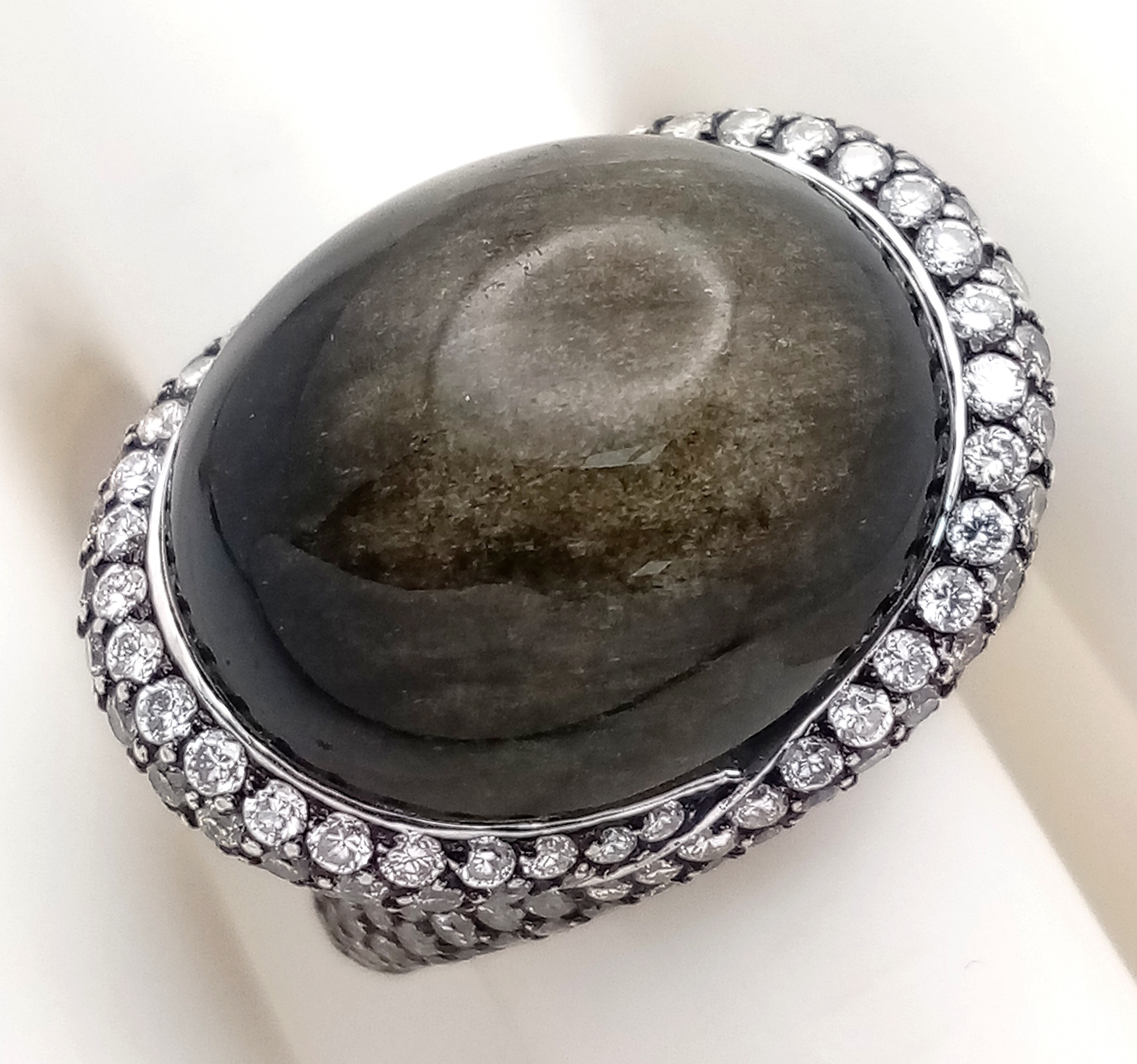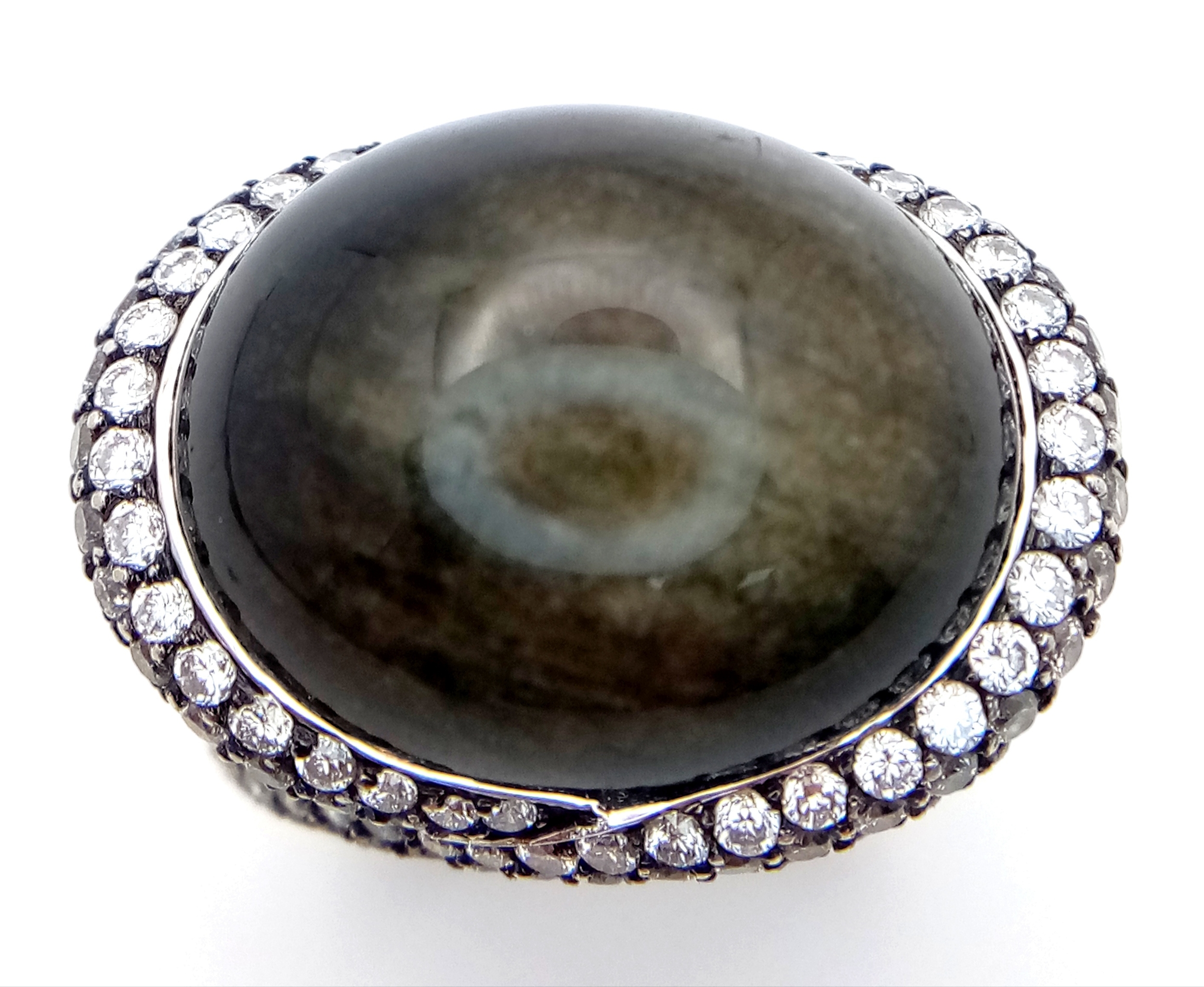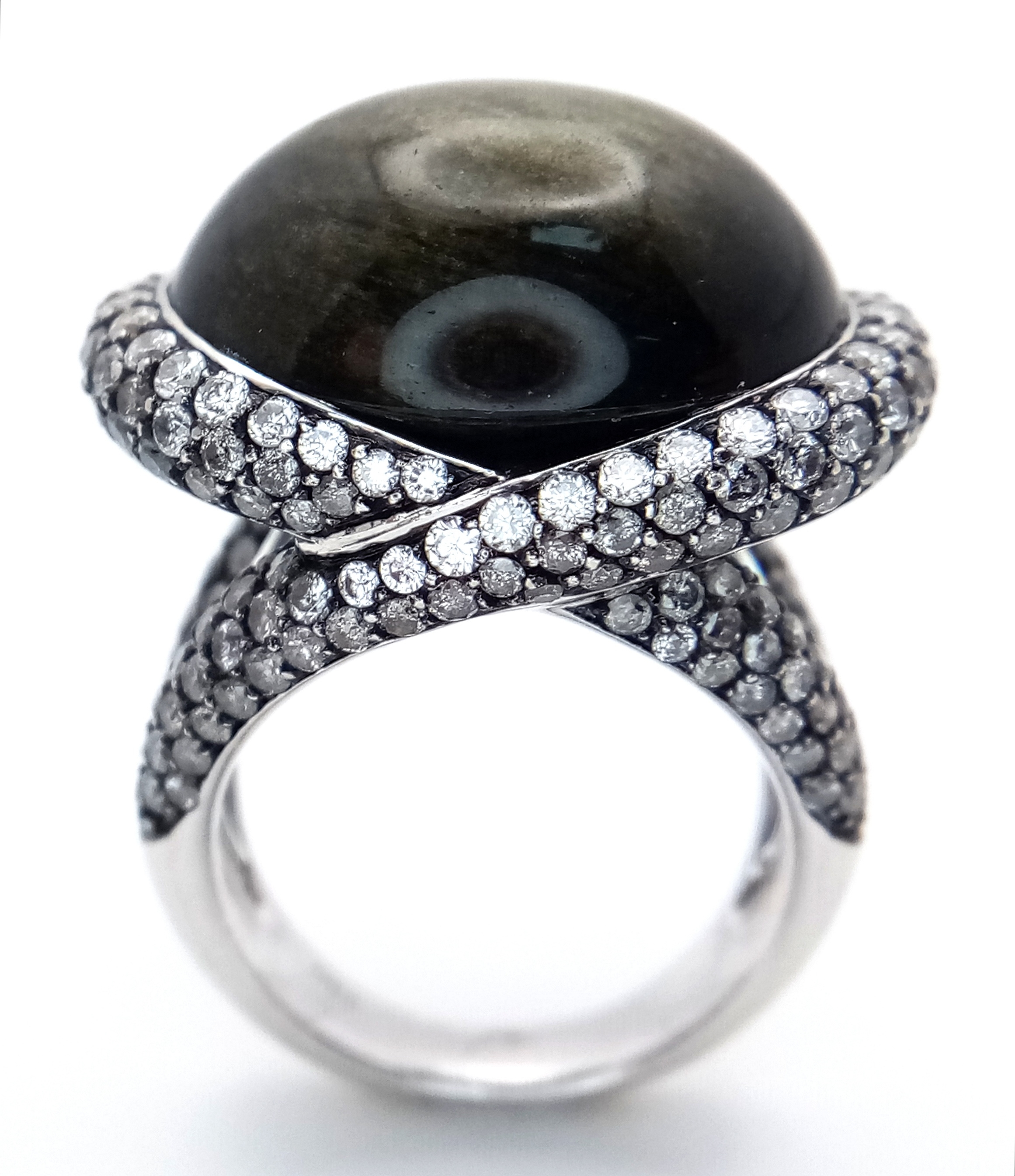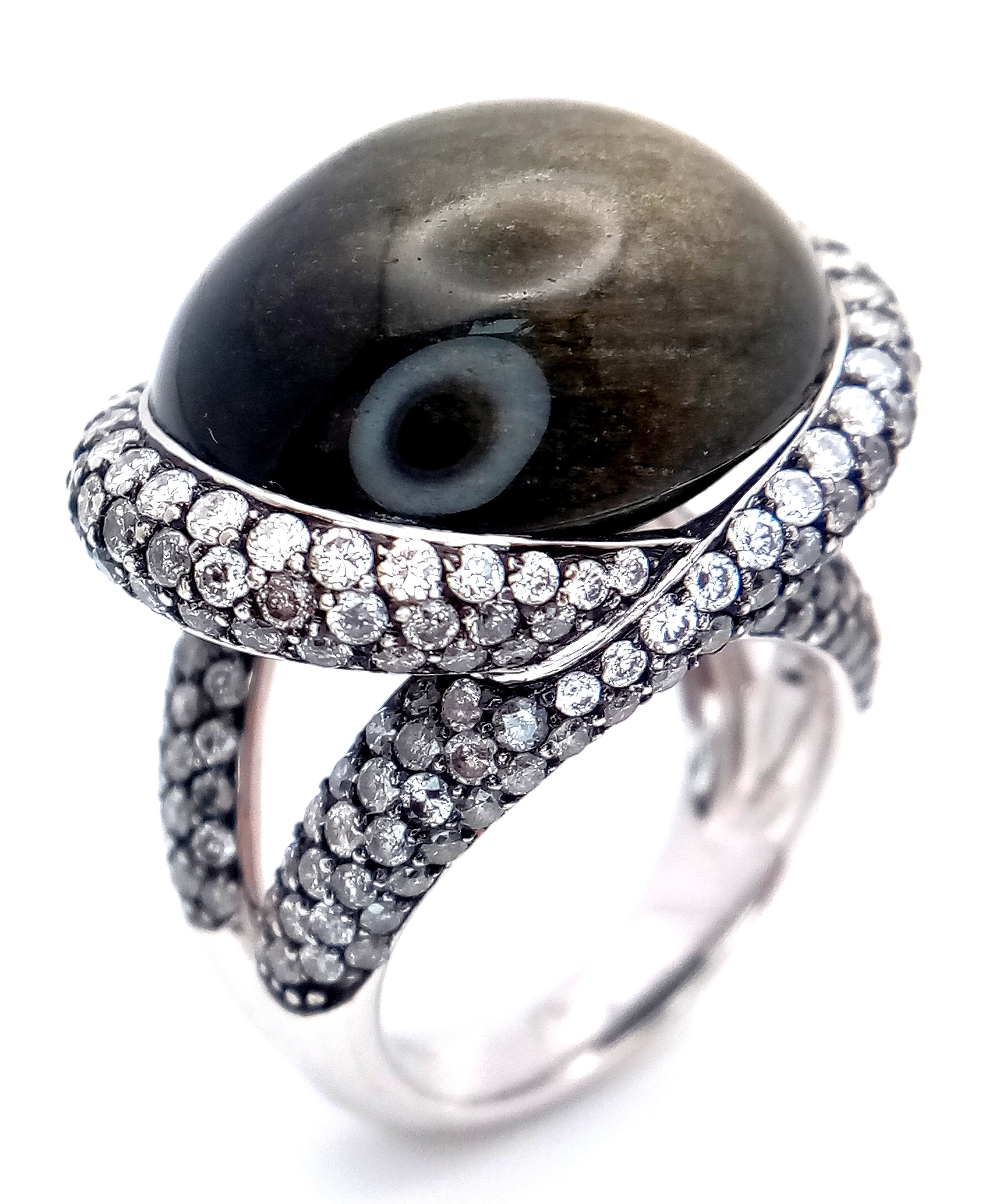A Head-Turning 18K White Gold, Diamond and Chrysoberyl (cat's eye) Ring. A large c.15ct chrysoberyl cabochon with an intricate three row diamond setting. Size N. 17.6g.