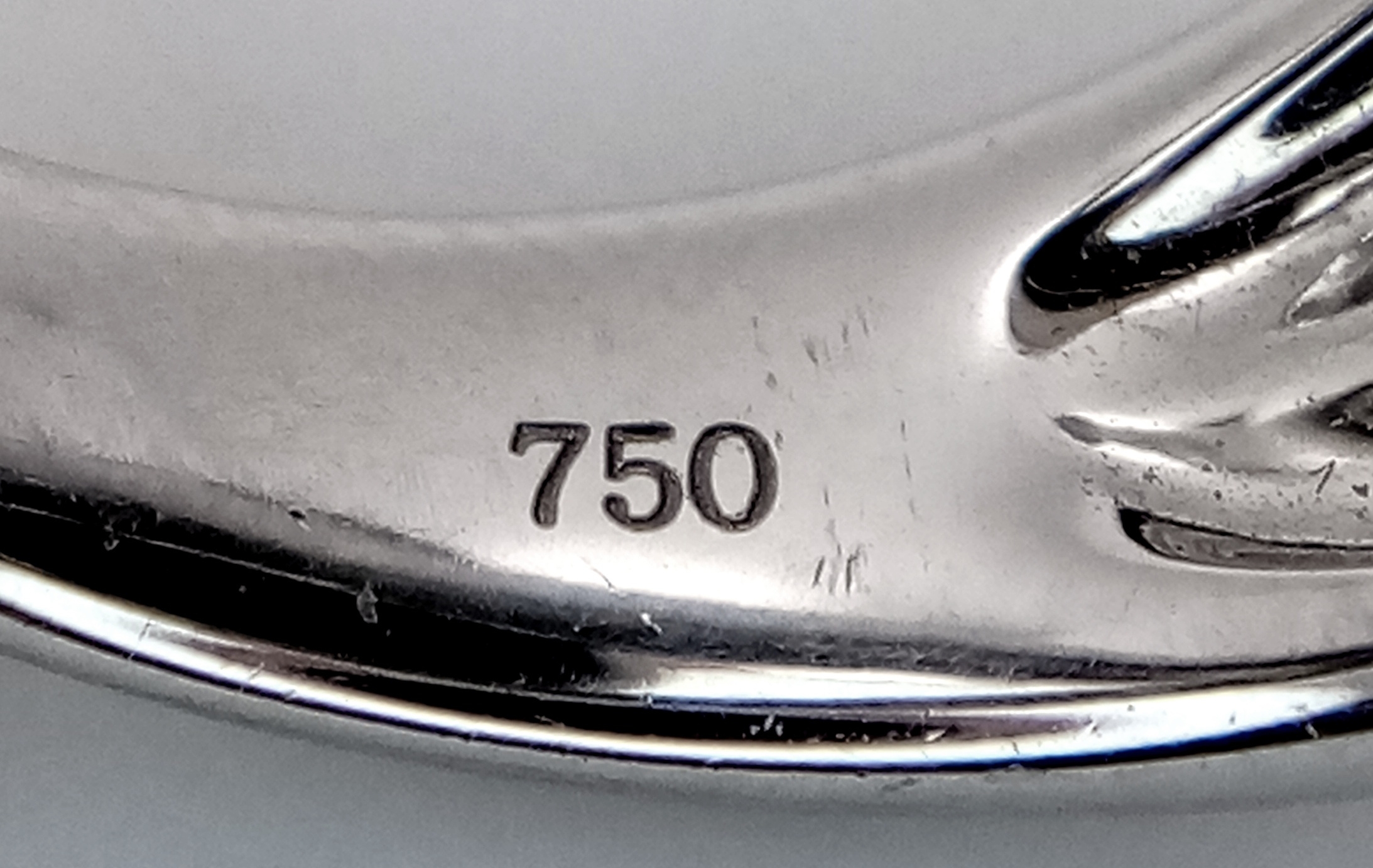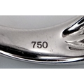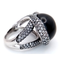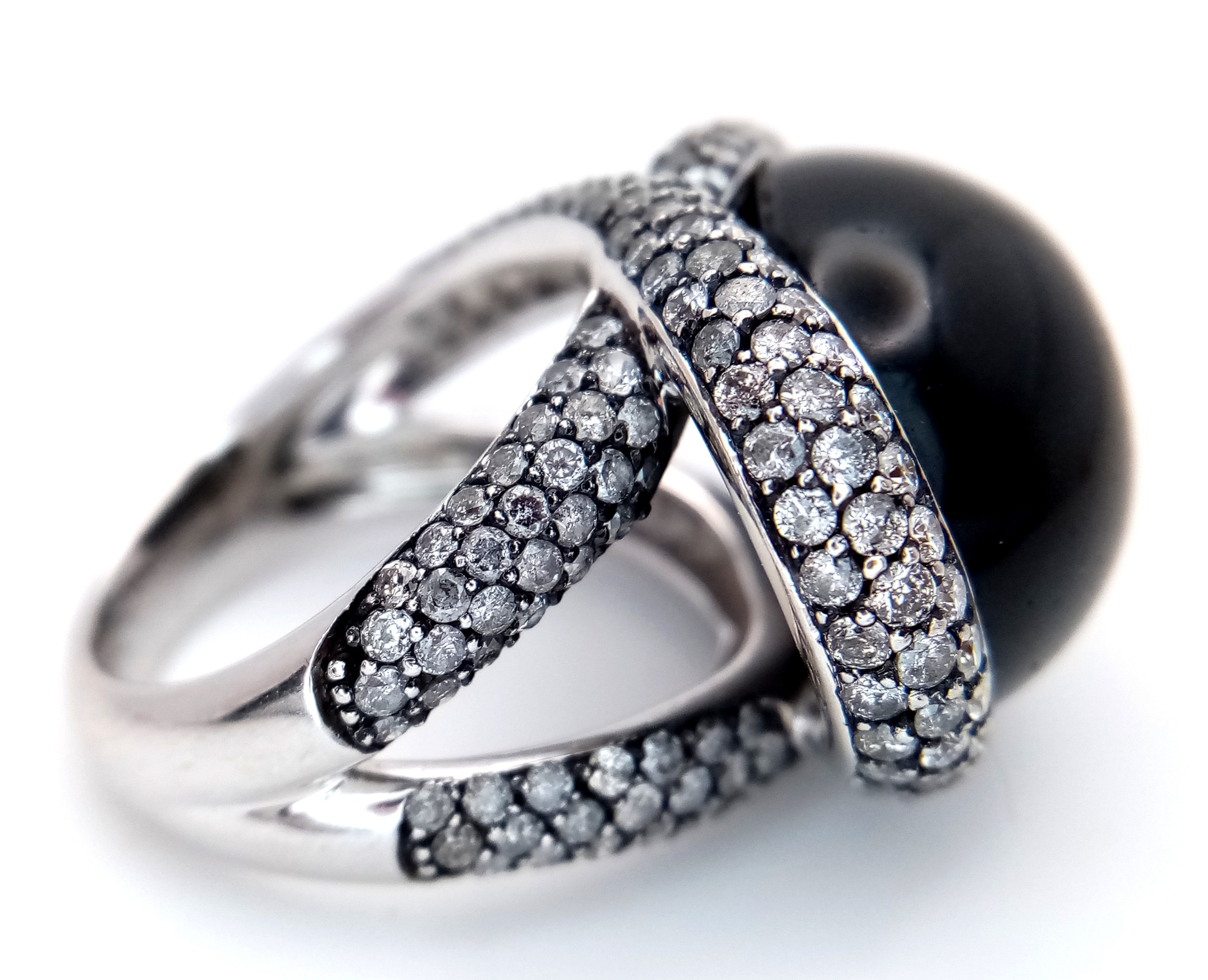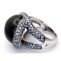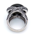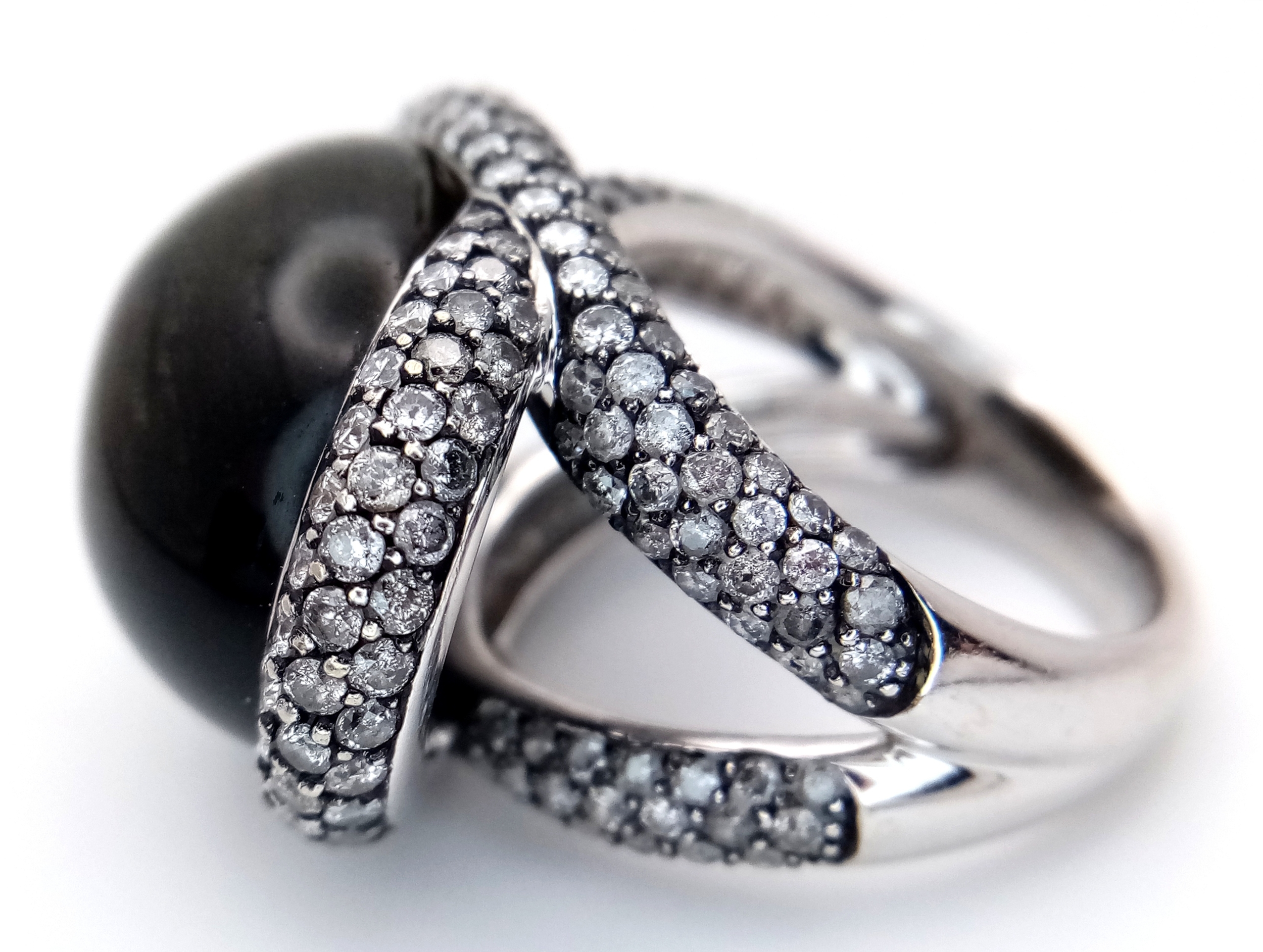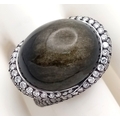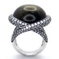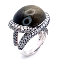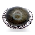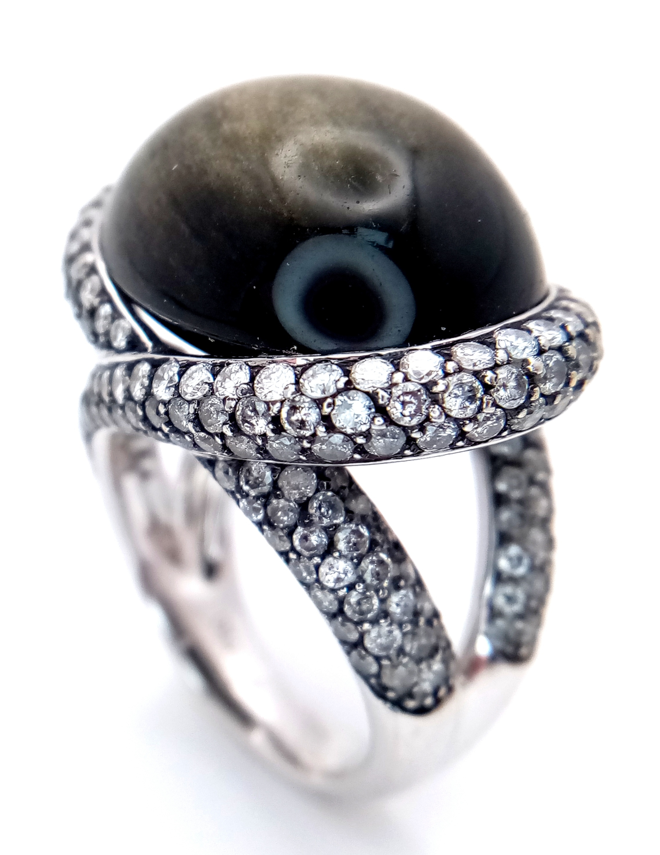 A Head-Turning 18K White Gold, Diamond and Chrysoberyl (cat's eye) Ring. A large c.15ct chrysoberyl cabochon with an intricate three row diamond setting. Size N. 17.6g.