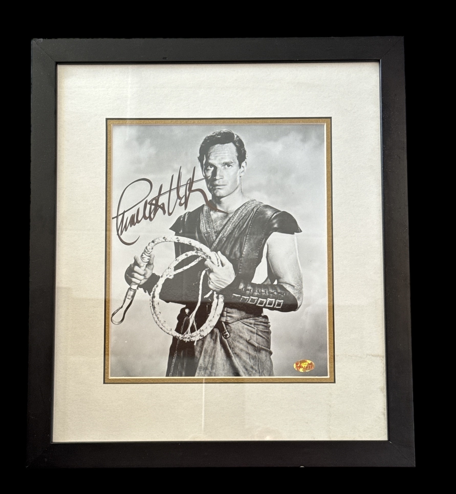 Charlton Heston signed black and white photo from the movie Ben-Hur. Mounted and framed, measures 16x14 inch appx.