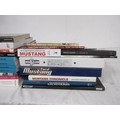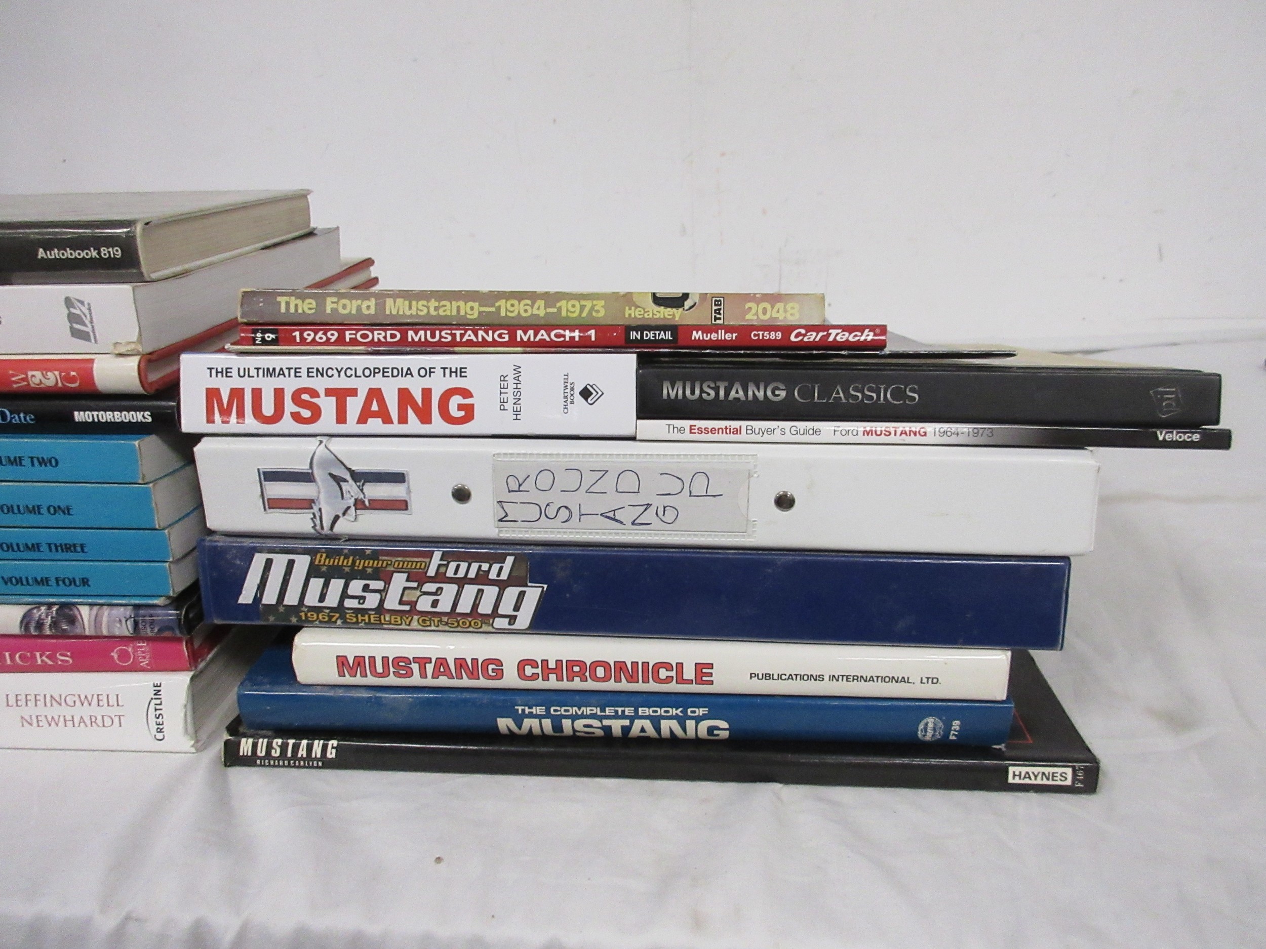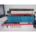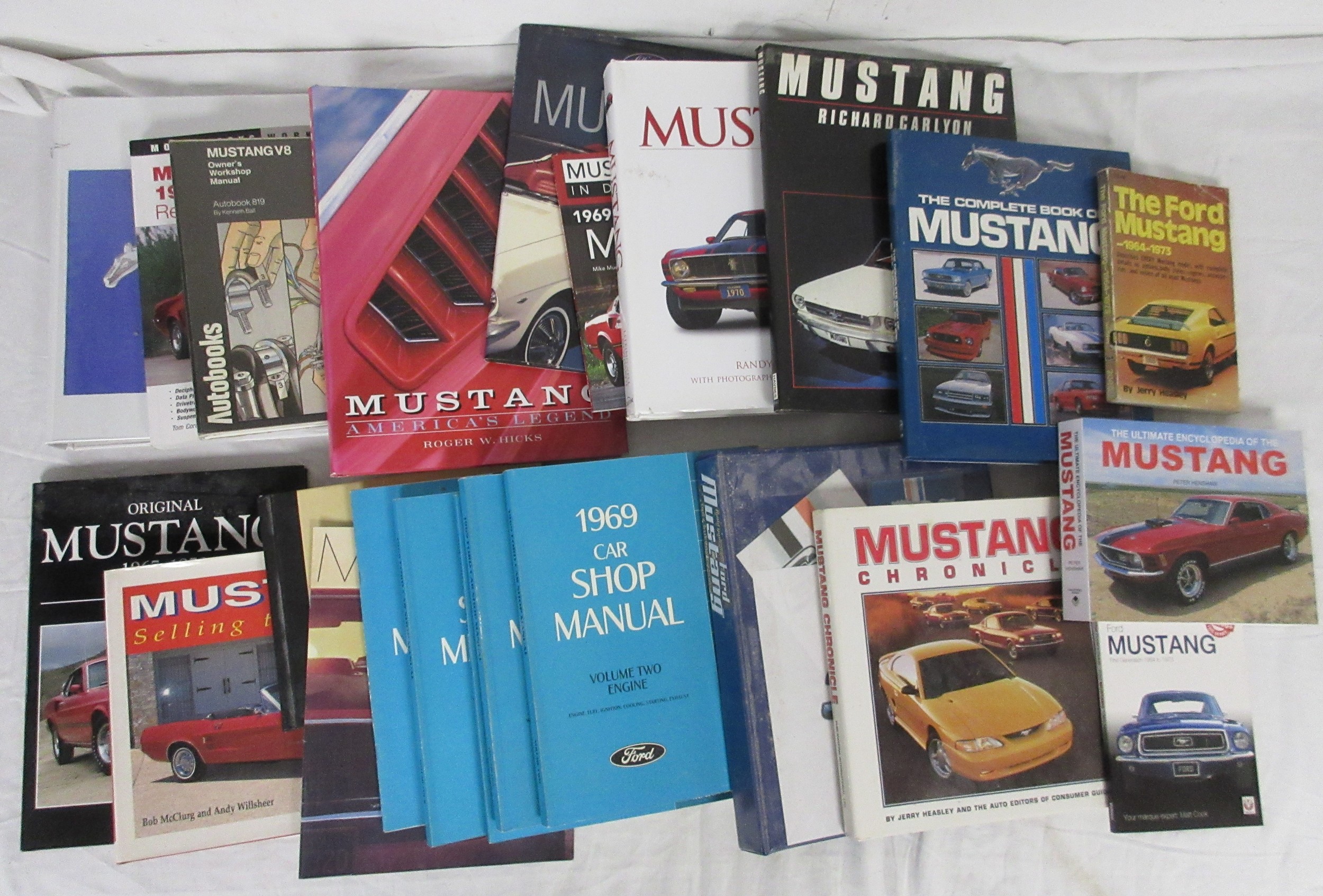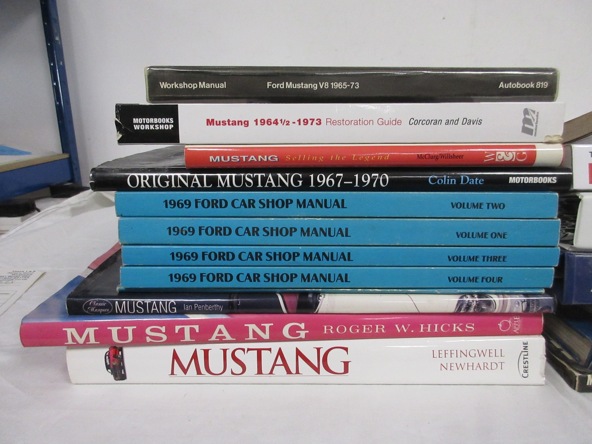 About twenty books regarding the Ford Mustang, including 1969 car shop manuals, 'Mustang' by Randy Leffingwell, and a few numbers of Round Up the Official magazine of the Mustang Owners Club of Great Britain