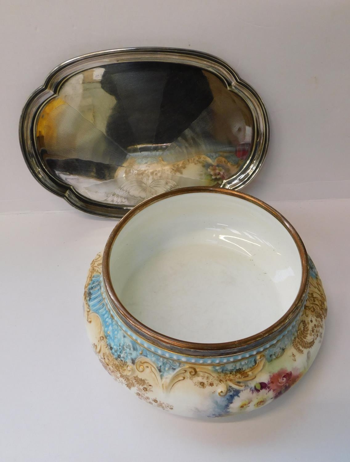 Large Doulton bowl with silver plated rim pre 1901 - no damage, Greenwood and Son EPNS card tray