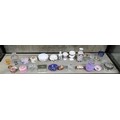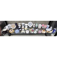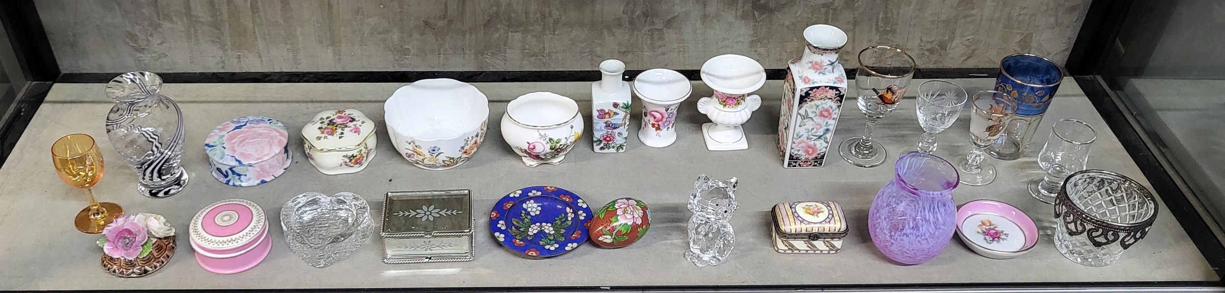 Porcelain and glass including Royal Worcester 'Palissy' lidded box, Royal Crown Derby vase, Aynsley bowl, Ashleydale campana vase, Coalport 'Ludlow' bowl and other items, Cloisonne egg and dish, Caithness oviform glass vase, a cut glass crystal cat, mirrored lidded box, and small drinking glasses. (26)