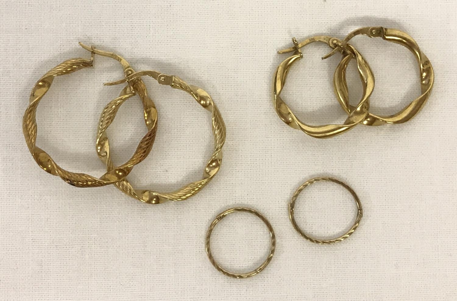 3 pairs of 9ct gold hoop earrings in varying sizes. 2 pairs of twisted style hoops together with a small pair of hoops with decoration to one side. Total weight approx. 3g.