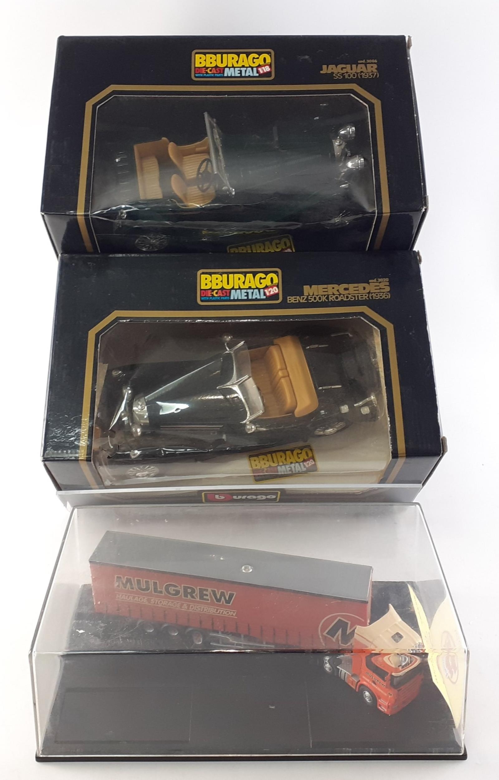 Diecast Models x 3. To include BURAGO Jaguar SS100, Mercedes Benz 500K Roadster and Oxford Mulgrew Curtainside. All in good condition.