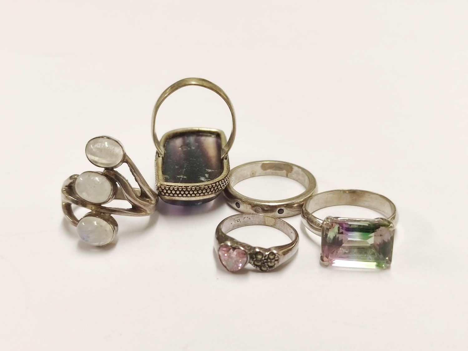 Group of five 925 silver rings set with various stones, 31.2g gross.