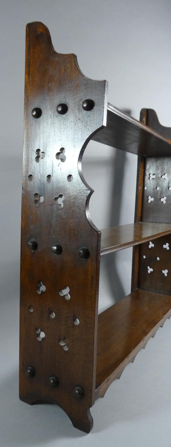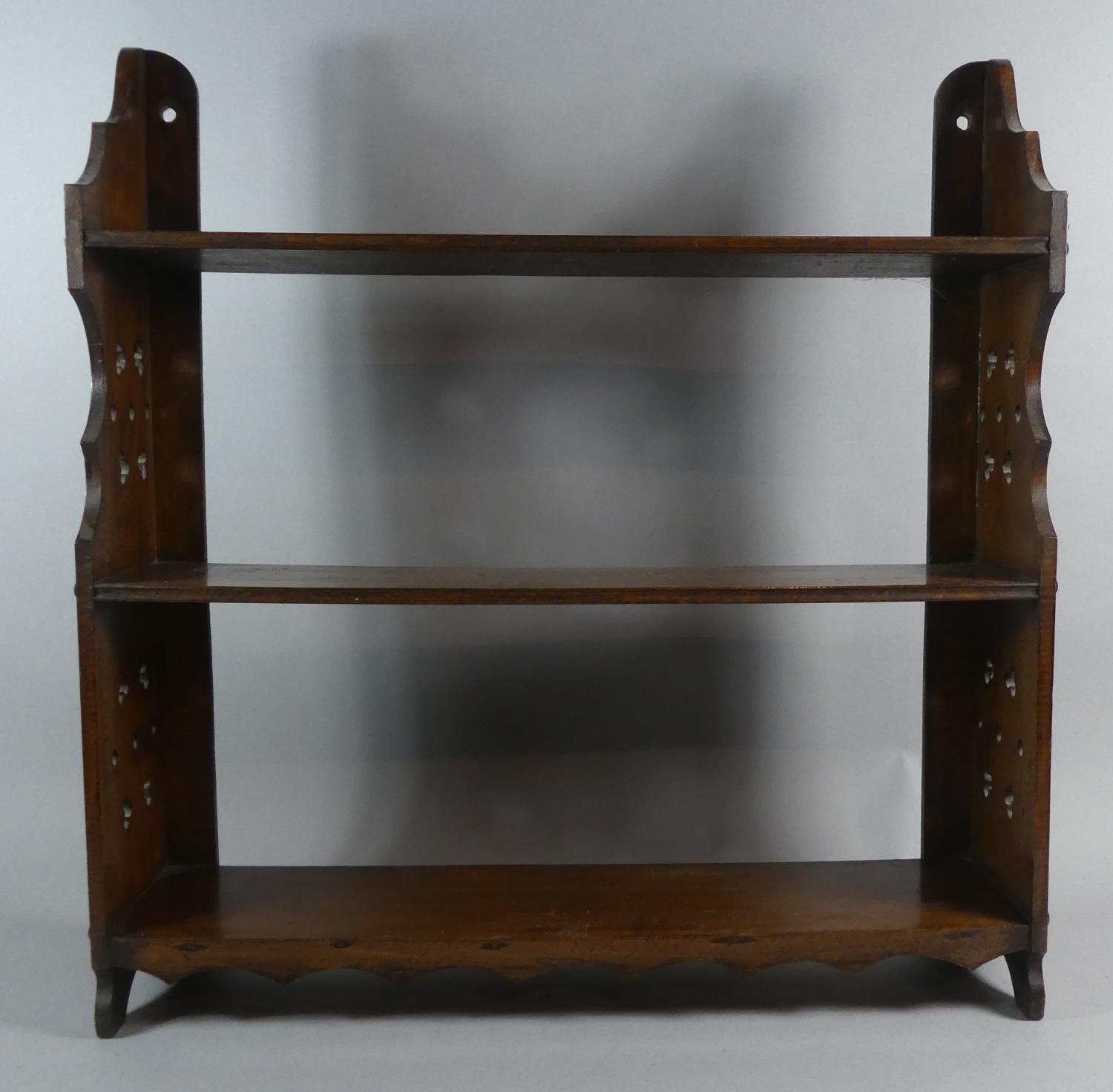 An Edwardian Mahogany Three Tier Wall Mounting Shelf with Pierced Supports, 57cm Wide