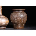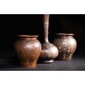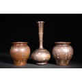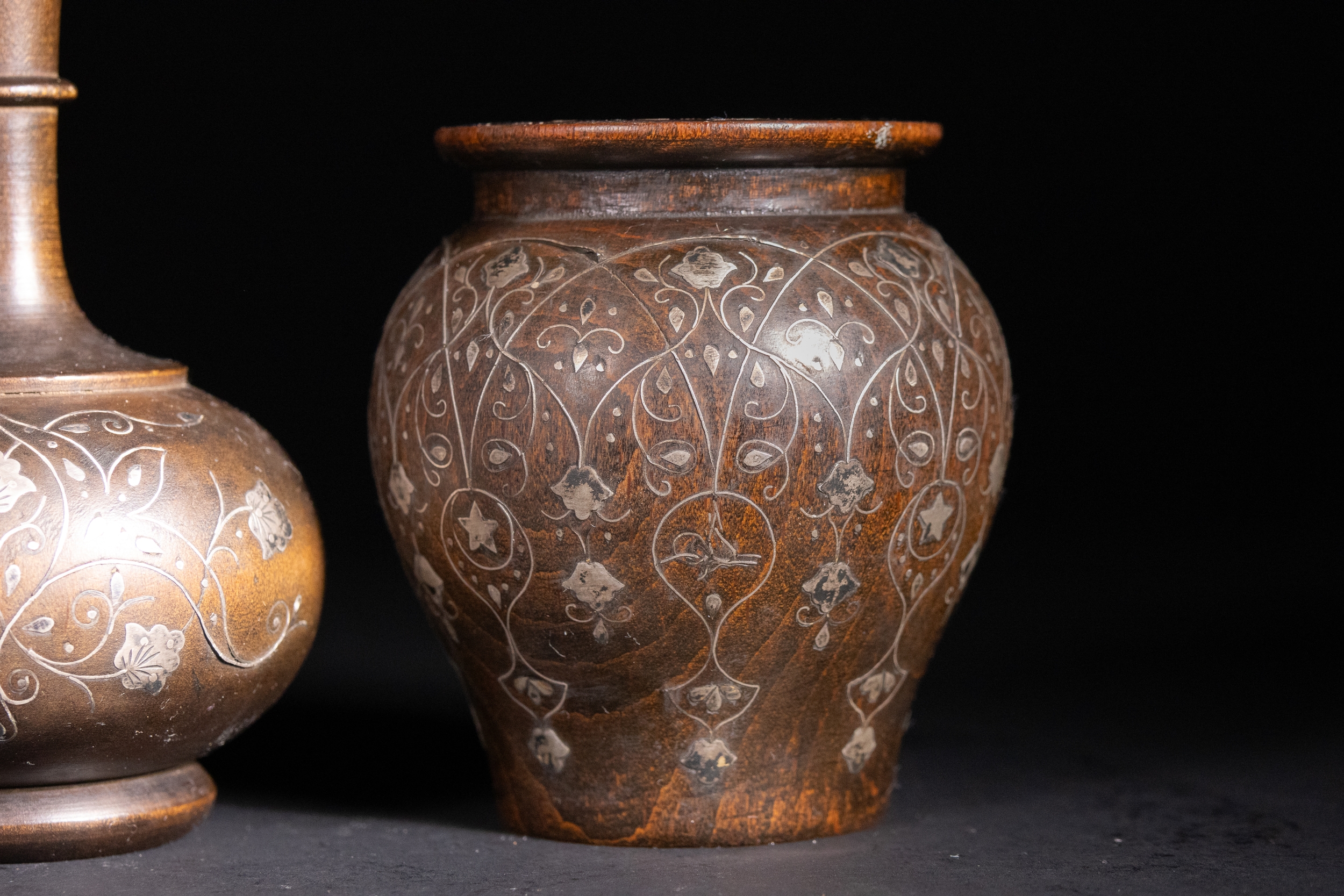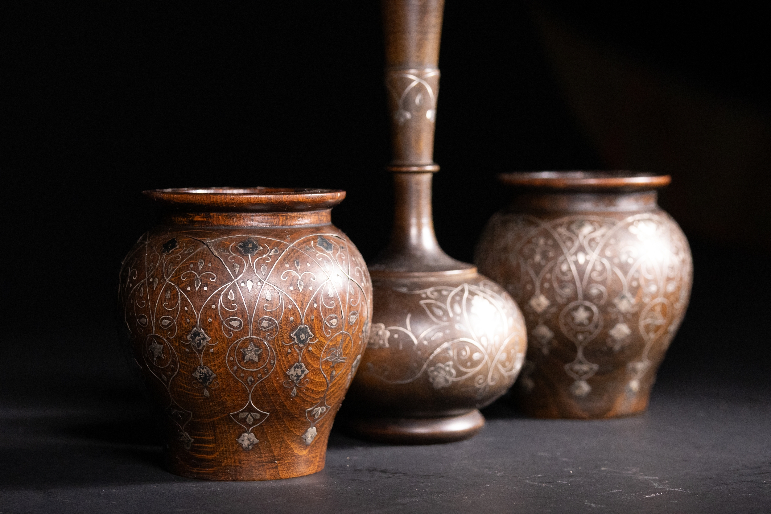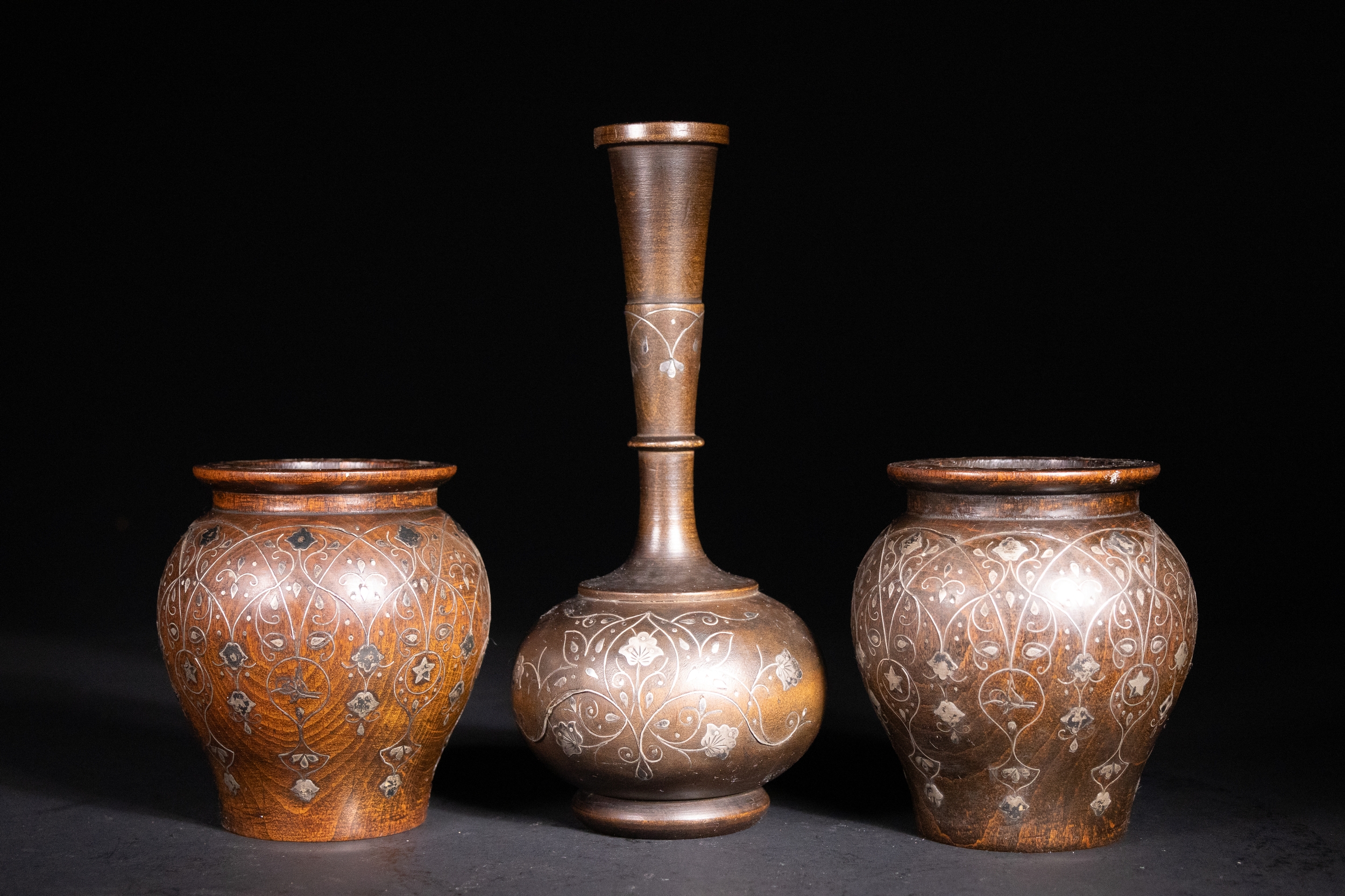 A lot of three Ottoman wooden vessels, each richly inlaid with delicate silver floral and foliate motifs. The set comprises two bulbous jars with wide rims and a central bottle-form vessel with an elongated neck and rounded body.